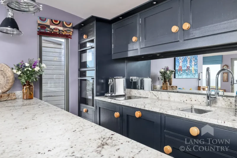 A bespoke kitchen—complete with high-spec integrated appliances—sits seamlessly alongside the living and dining areas, creating a sociable and functional heart of the home. Carefully selected materials, including reclaimed features and marine-grade finishes, reflect both quality craftsmanship and a sensitivity to the coastal environment.