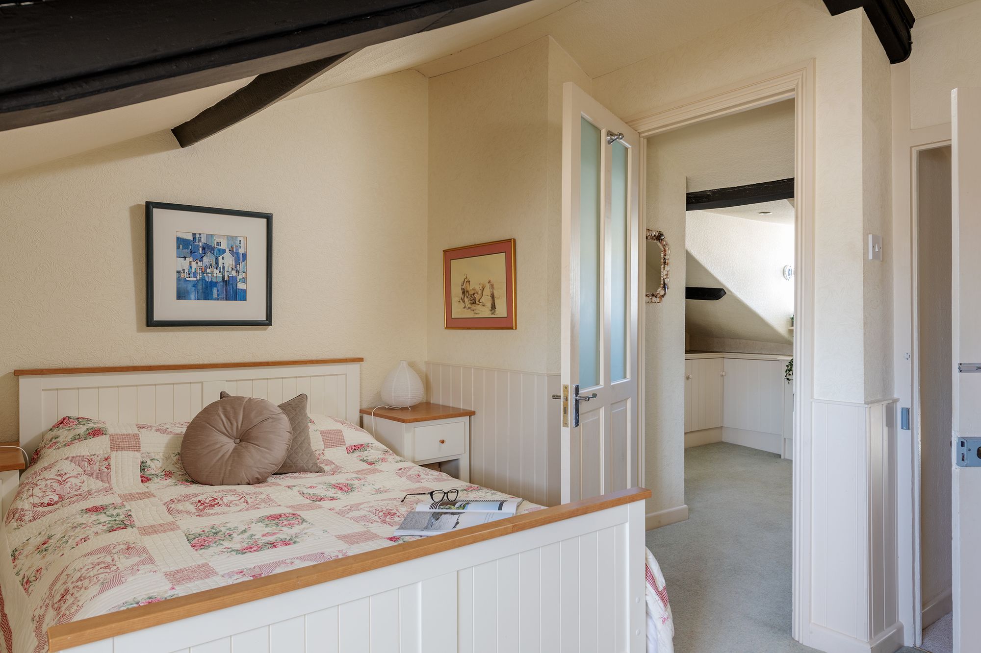 The top floor is home to the charming Guest Suite, where windows frame views over the historic market square to the green hills of Kingswear beyond. It is a Bedroom full of character, offering a quiet vantage point over the town.