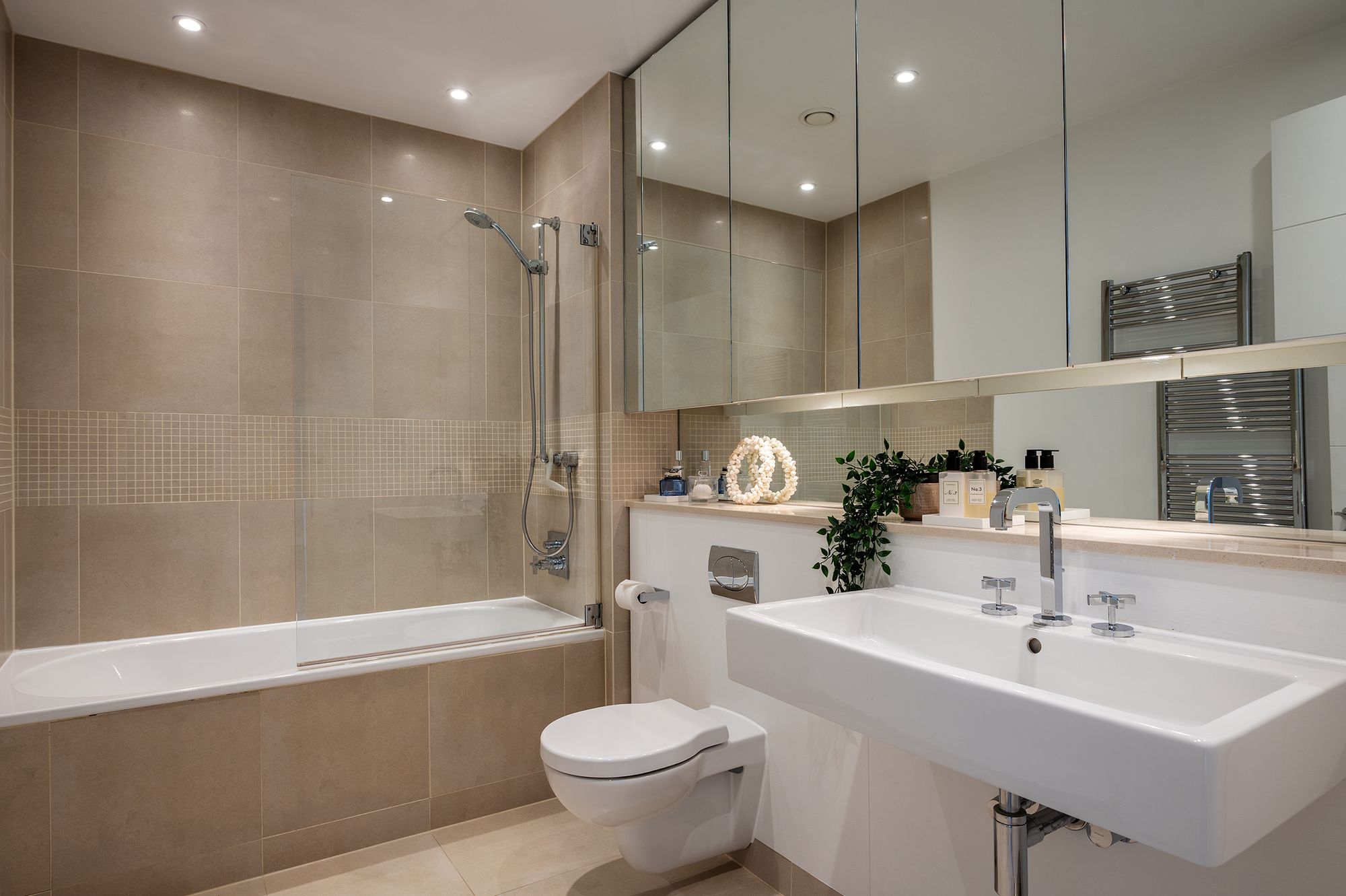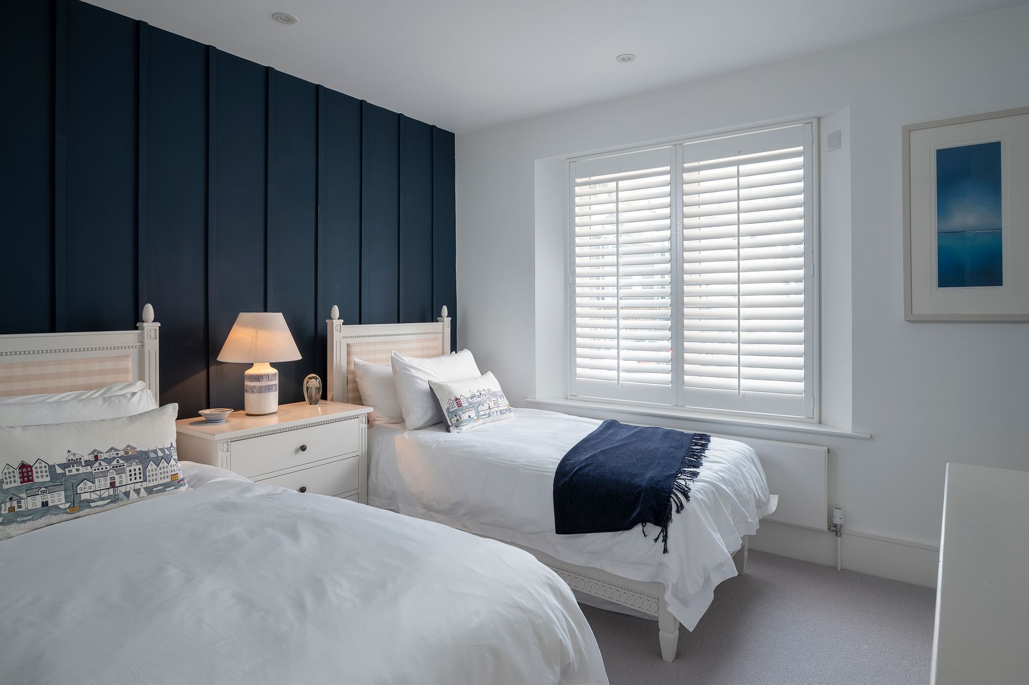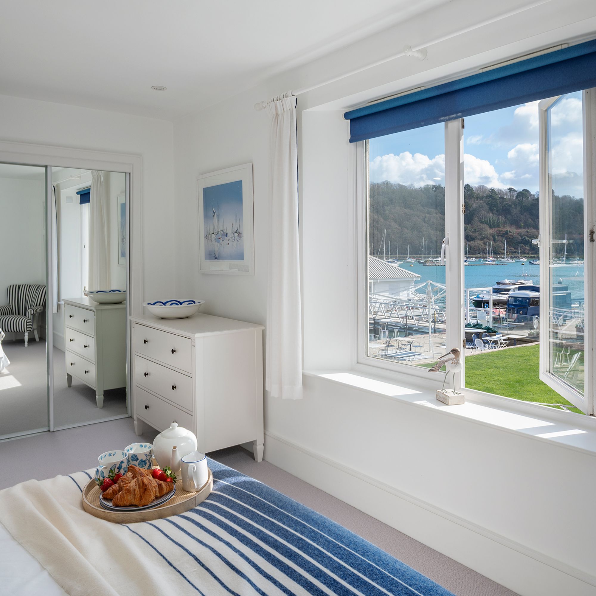 The Principal Bedroom occupies a particularly appealing position, with space for a super-king bed and windows that capture views across the neatly kept lawns towards the marina and the river beyond. It is a room that feels both restful and connected to its surroundings, where the changing light over the water marks the passing of the day.