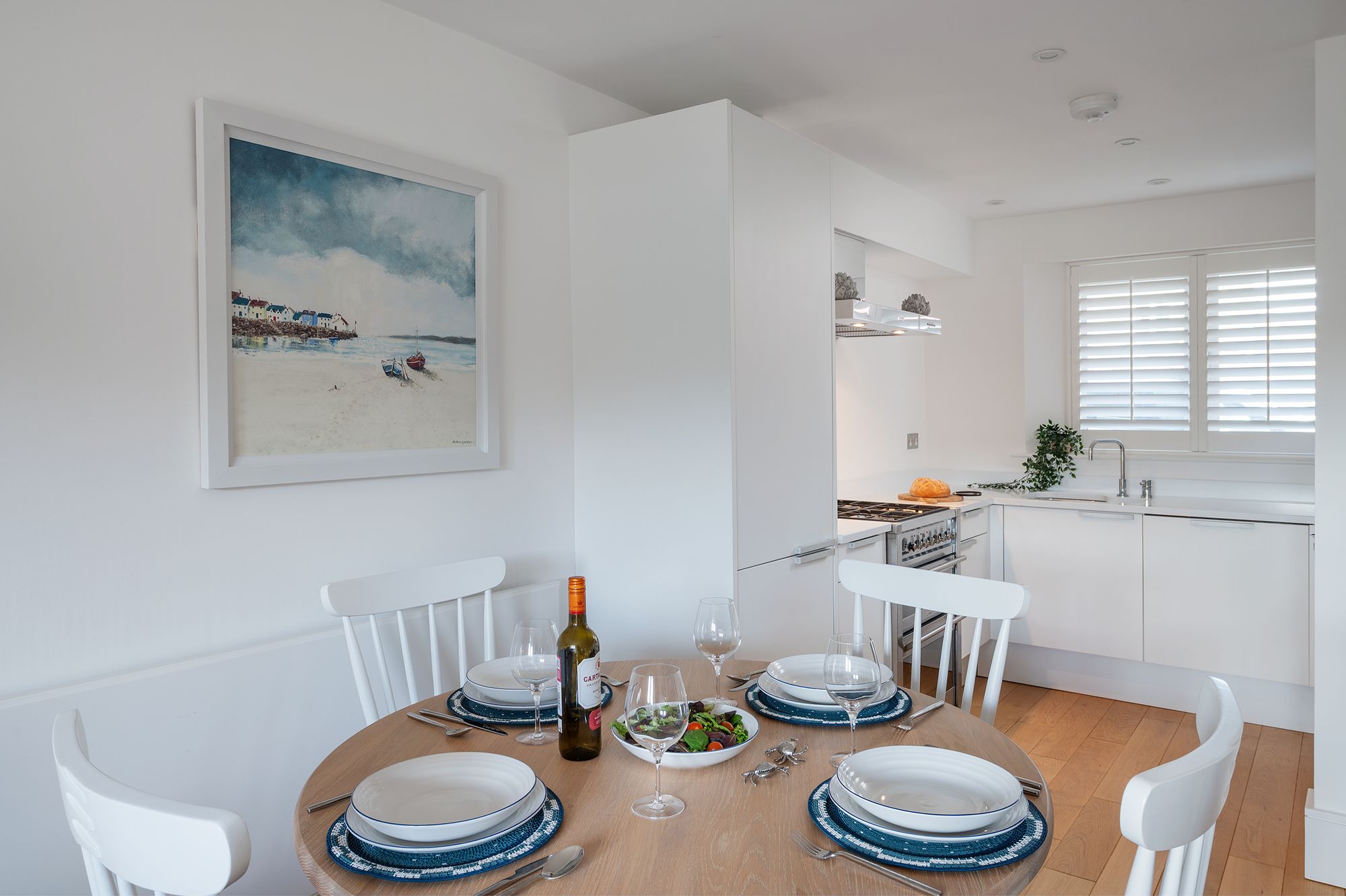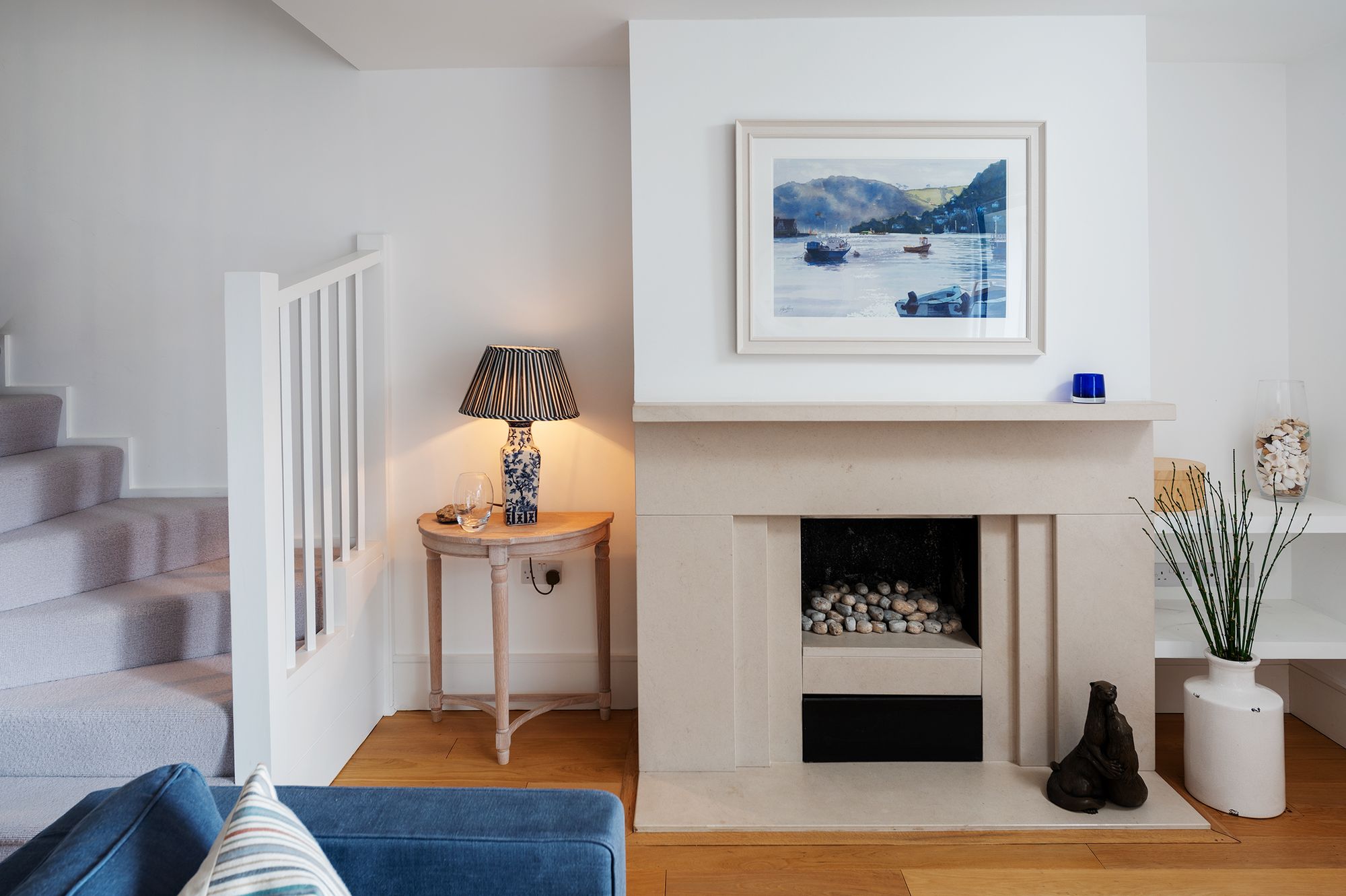 The Kitchen is positioned cleverly, forming a natural culinary hub without dominating the space. From here the cook remains part of the conversation, whether preparing supper or simply enjoying the view. There is room for a dining table comfortably nearby, creating a setting where meals are shared against a backdrop of passing boats and the quiet movement of the tide. The Living Area is arranged to make the most of the outlook, centred around a stylish contemporary fireplace that anchors the room while the French doors frame the vistas beyond.