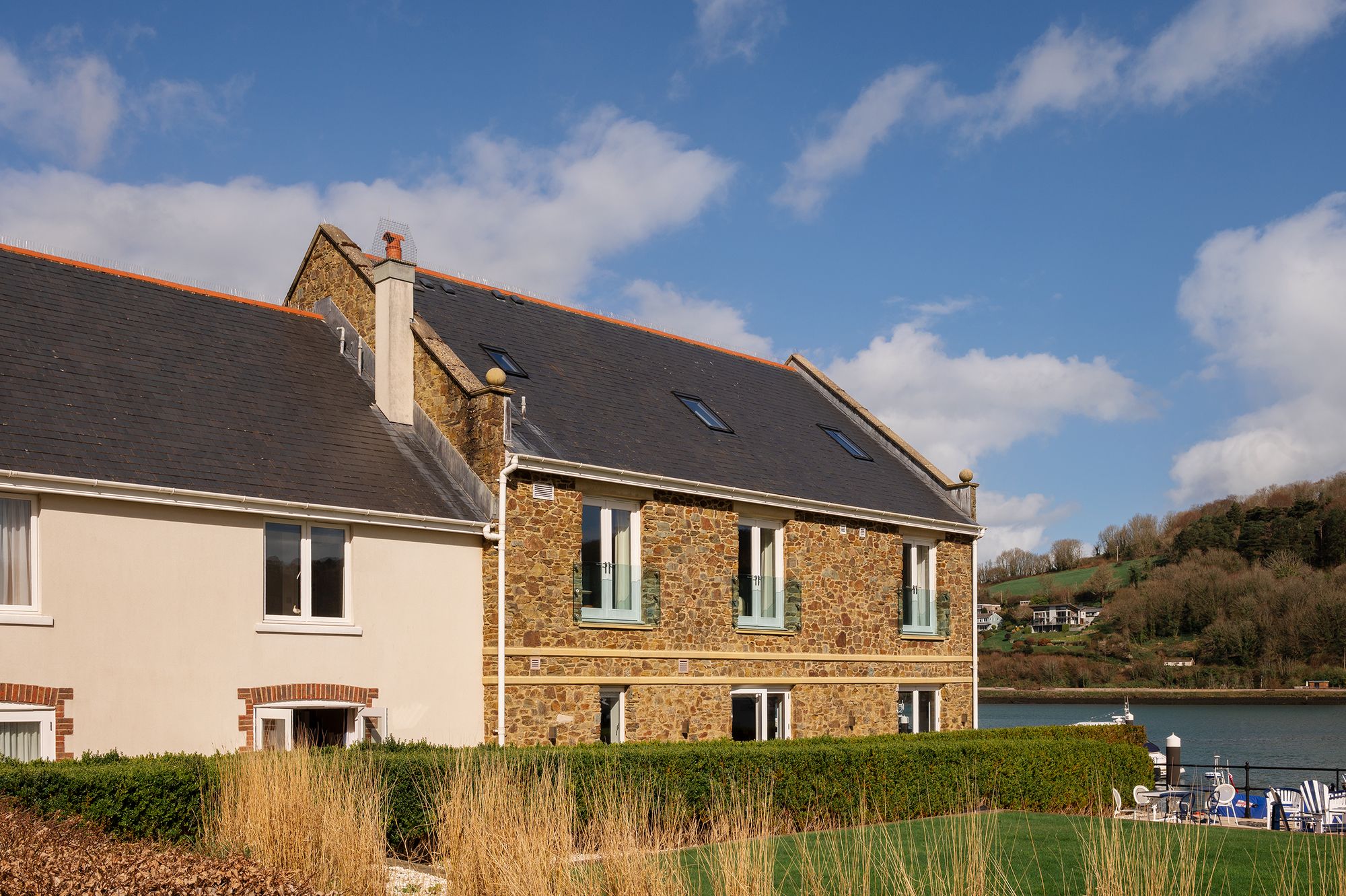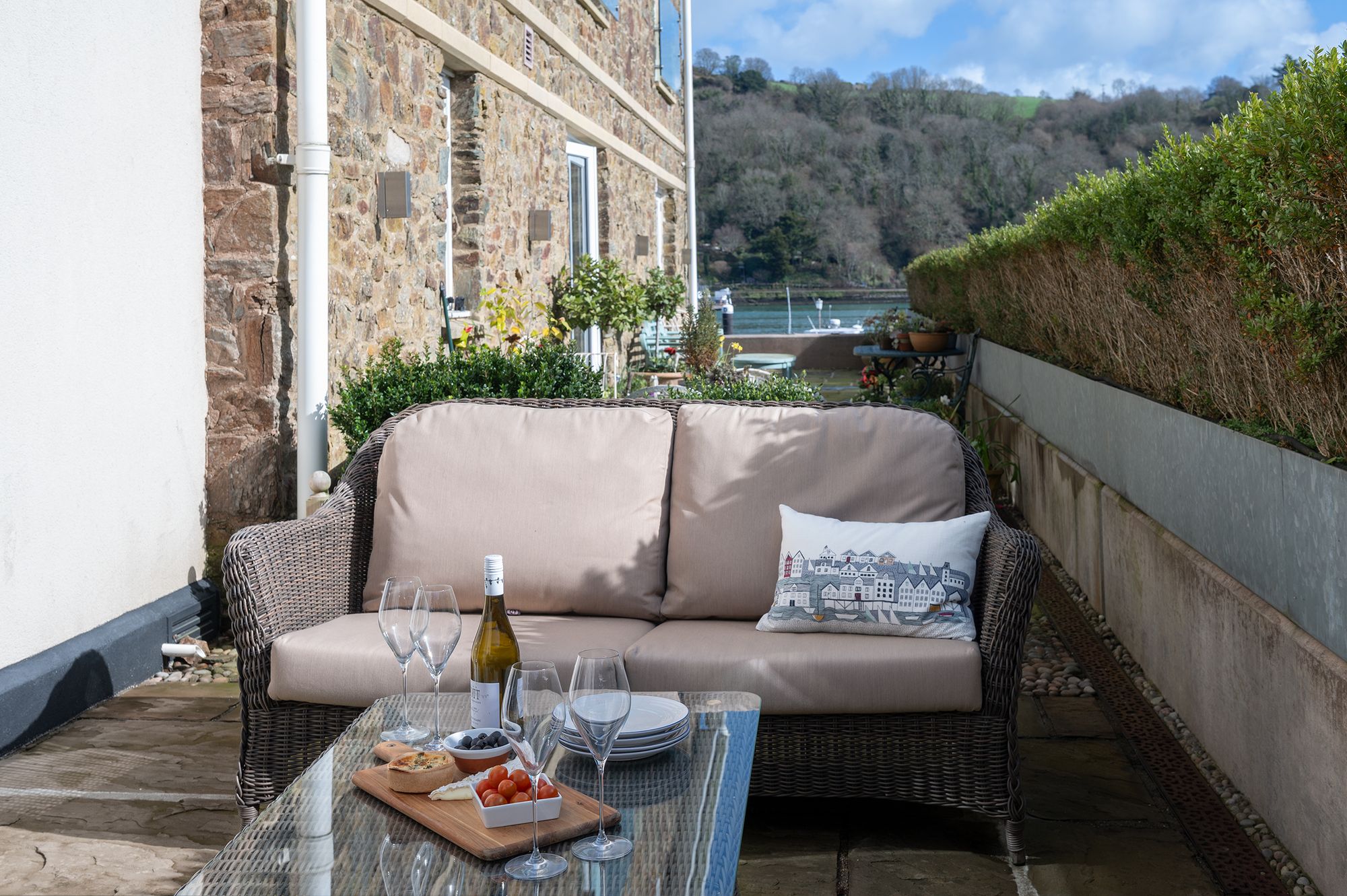 Outside, the private Terrace becomes an extension of the living space. Bathed in sunlight throughout much of the day, this sheltered space offers a tranquil vantage point from which to observe life on the river. Morning coffee is accompanied by the gentle activity of the marina, while evenings invite a slower pace. As dusk settles, the lights of Kingswear shimmer across the water, creating a quietly atmospheric setting for an aperitif shared with friends.