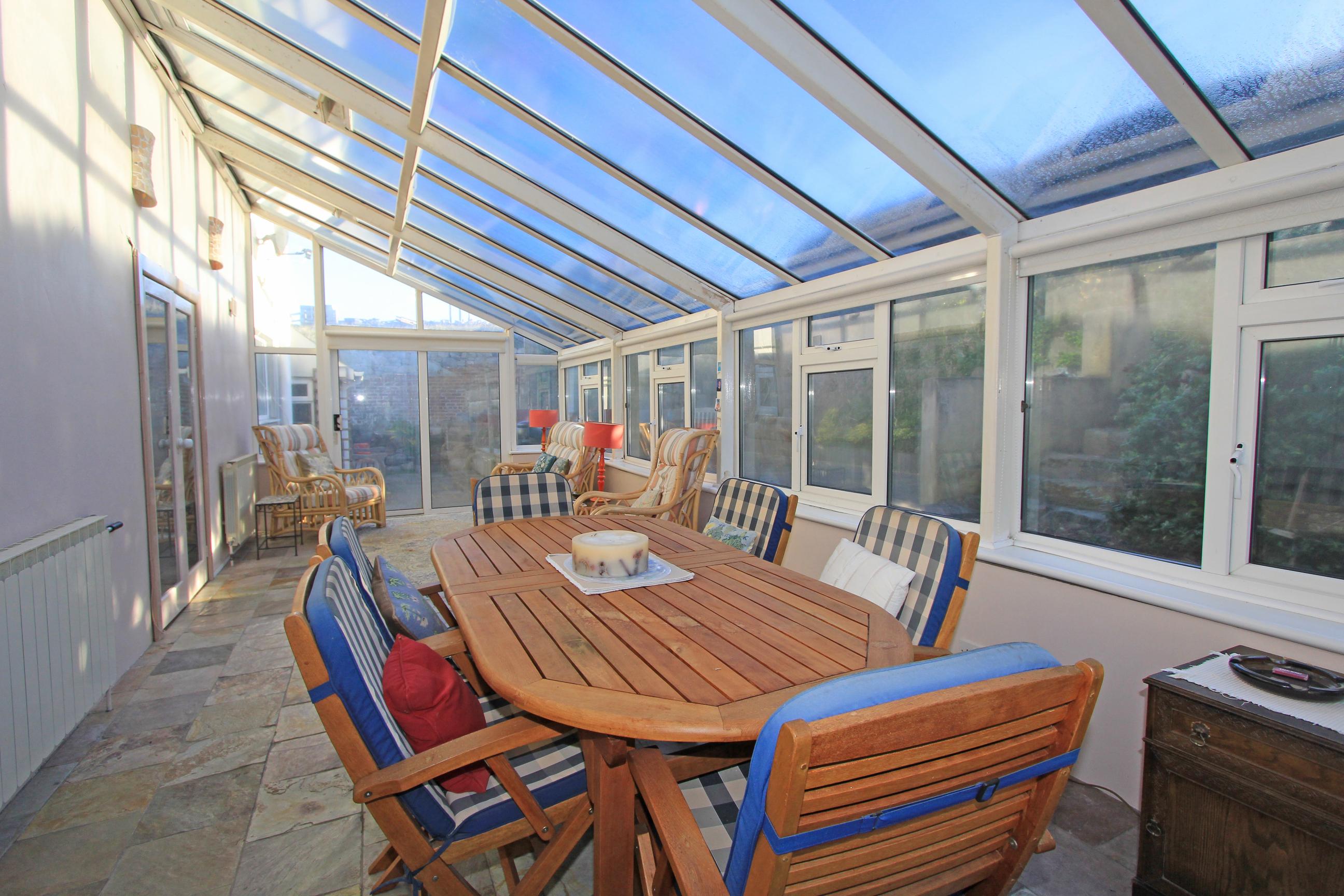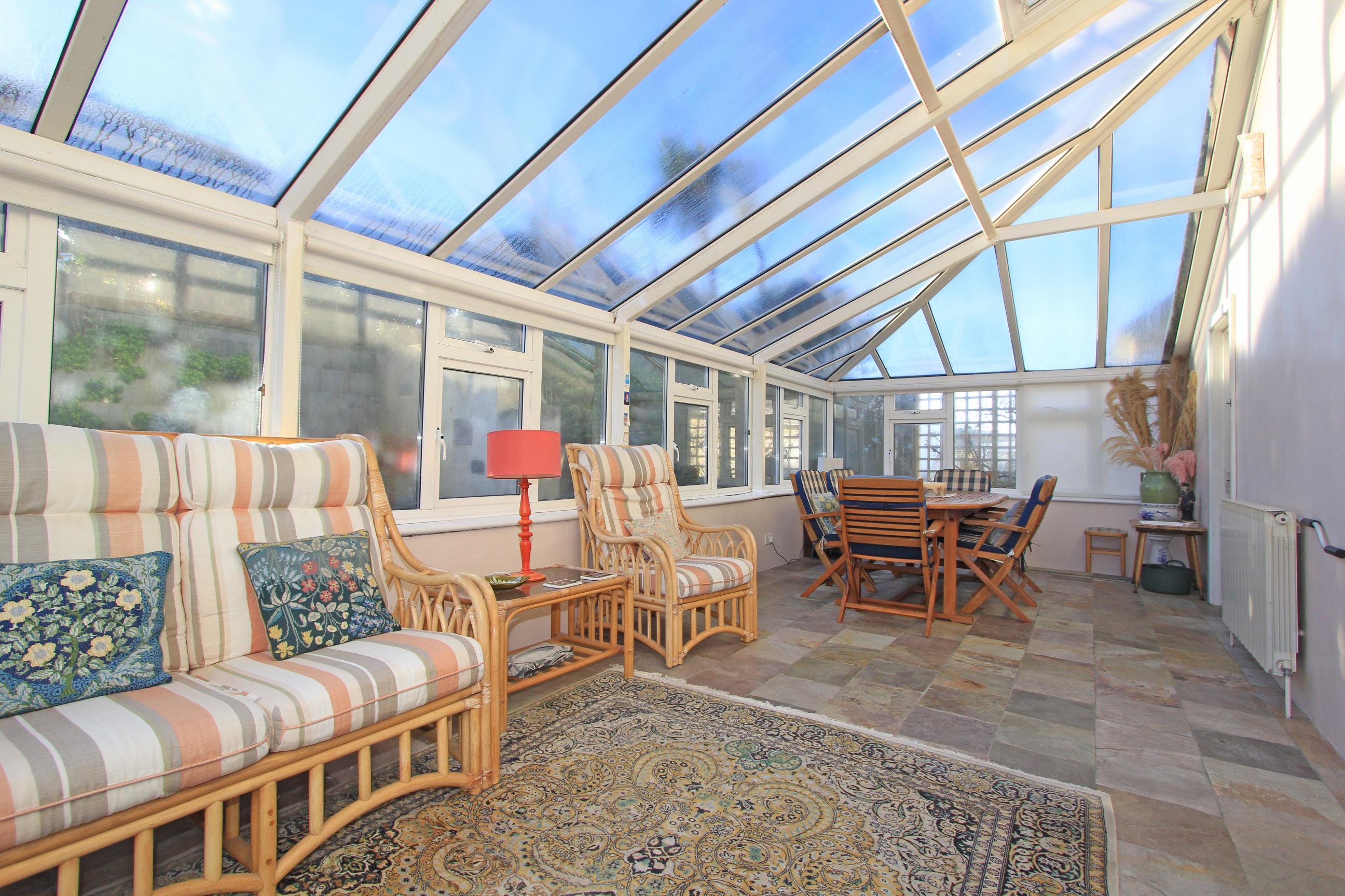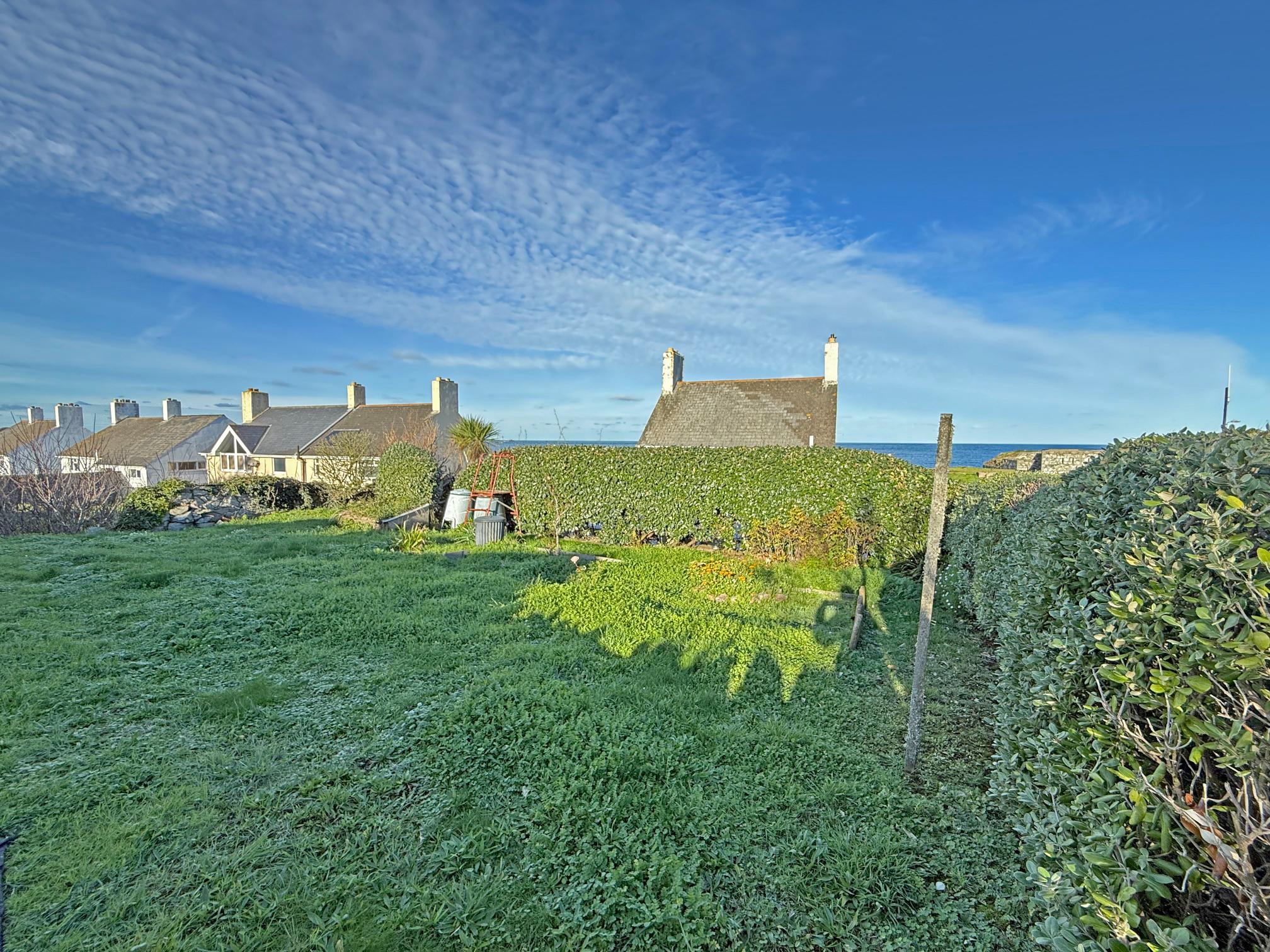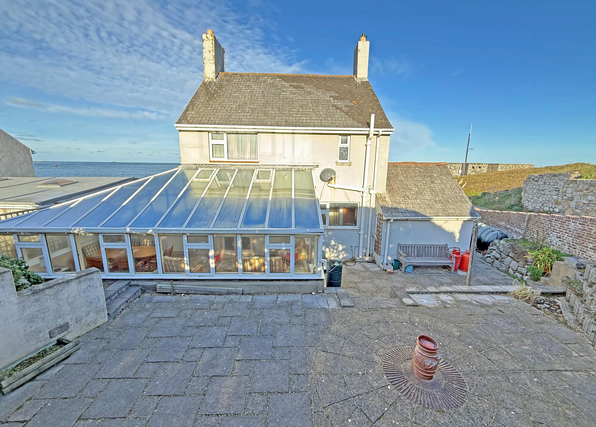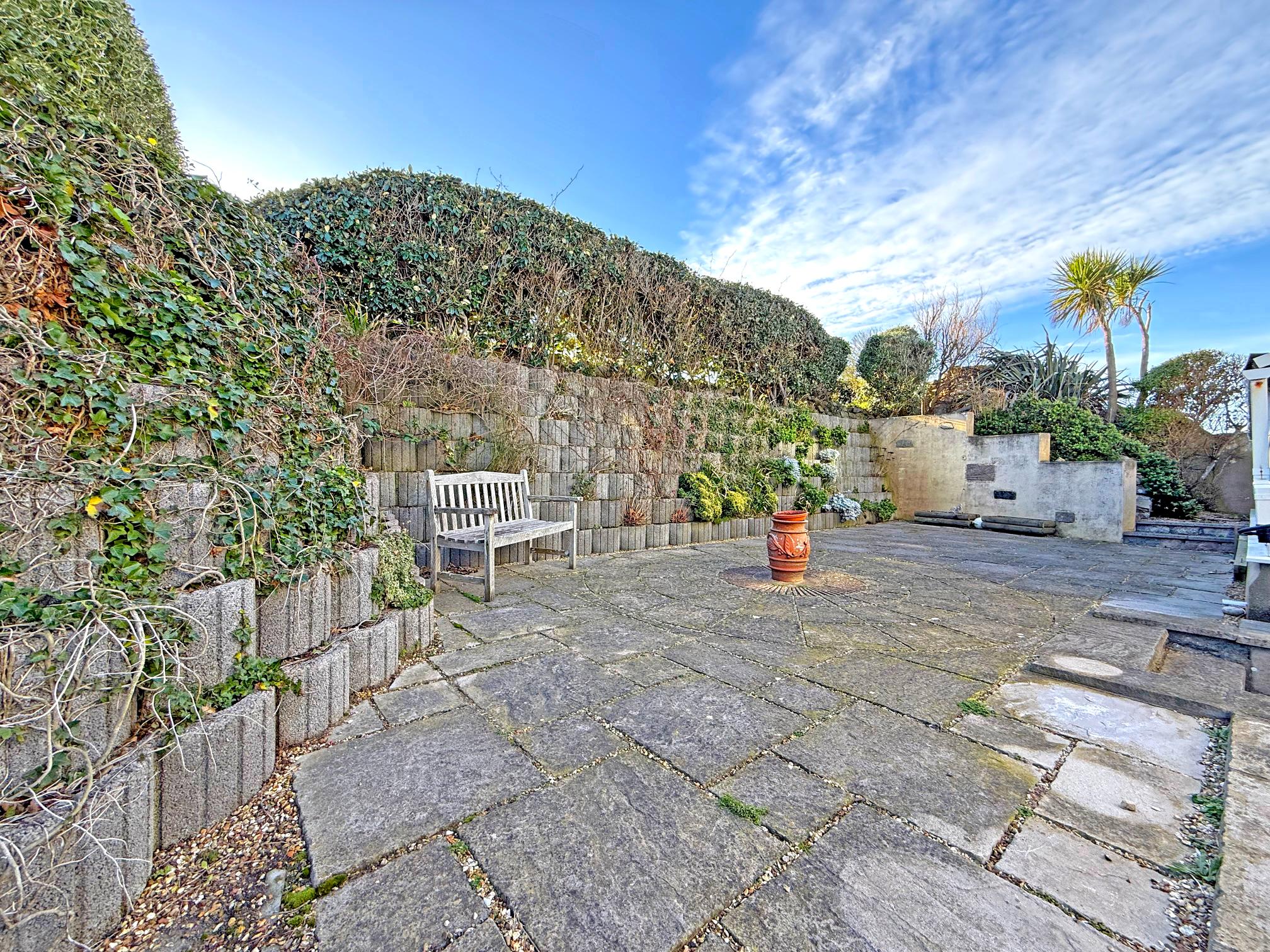To the rear, the property offers a generous patio terrace set directly off the conservatory. Steps lead up to a lawned upper garden, providing further space to grow and enjoy the coastal setting.