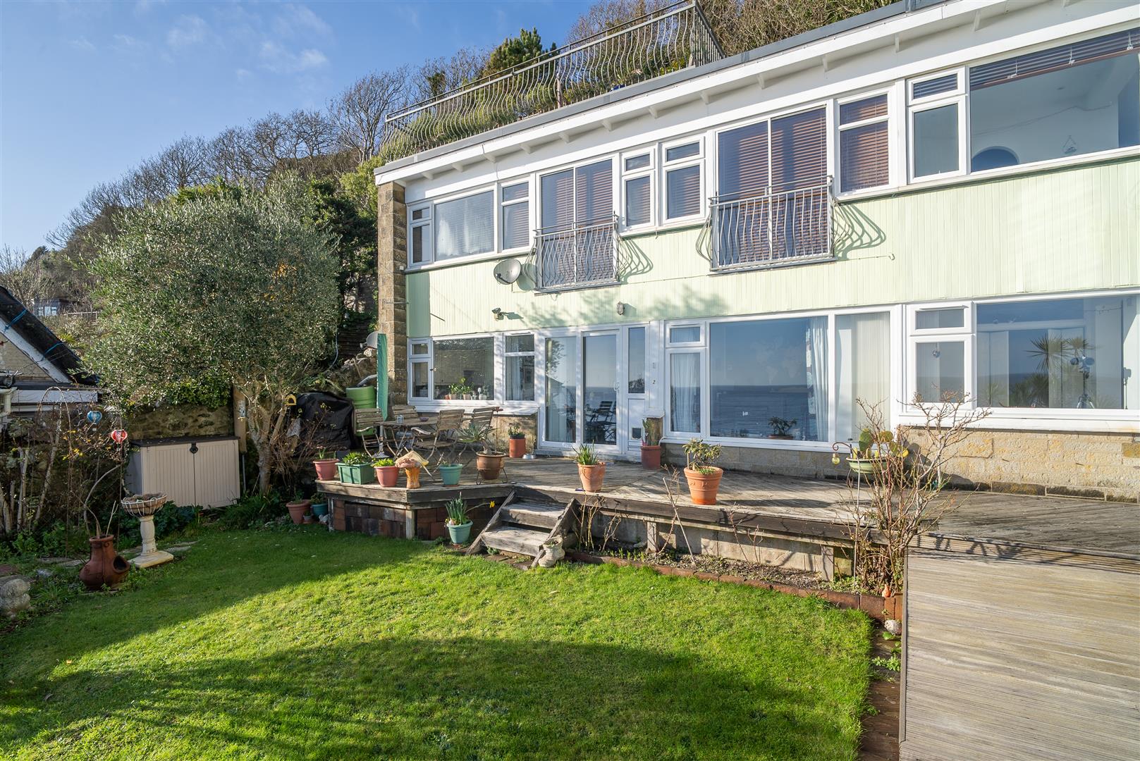 Positioned to the front of the apartment, the garden enjoys an elevated decked seating area, ideal for al fresco dining and watching boats pass along the English Channel. This exceptional vantage point also offers a front-row seat to the annual Round the Island Race. The garden continues to a lawned area with planted borders adding colour and interest. Steps lead down to neighbouring gardens, while a pathway provides direct access to Bath Road, connecting easily with the seafront and town amenities. The garden benefits from panoramic sea views and a desirable south-facing aspect, enjoying sunshine for much of the day.