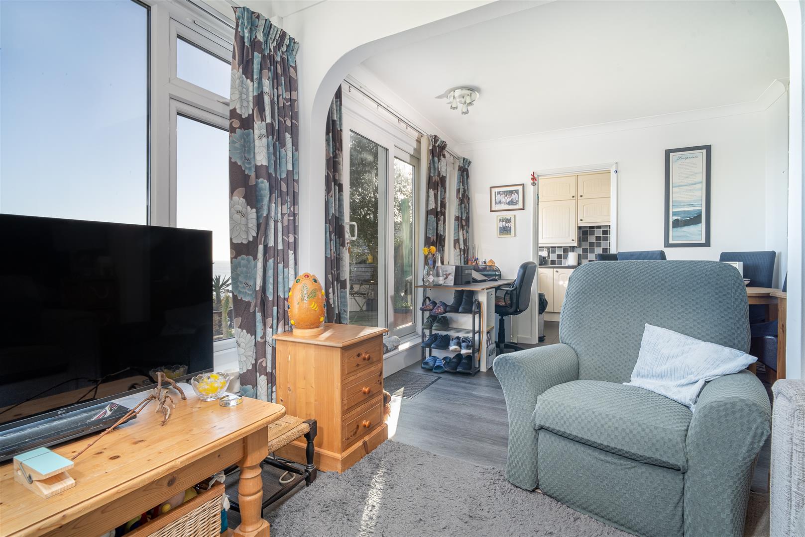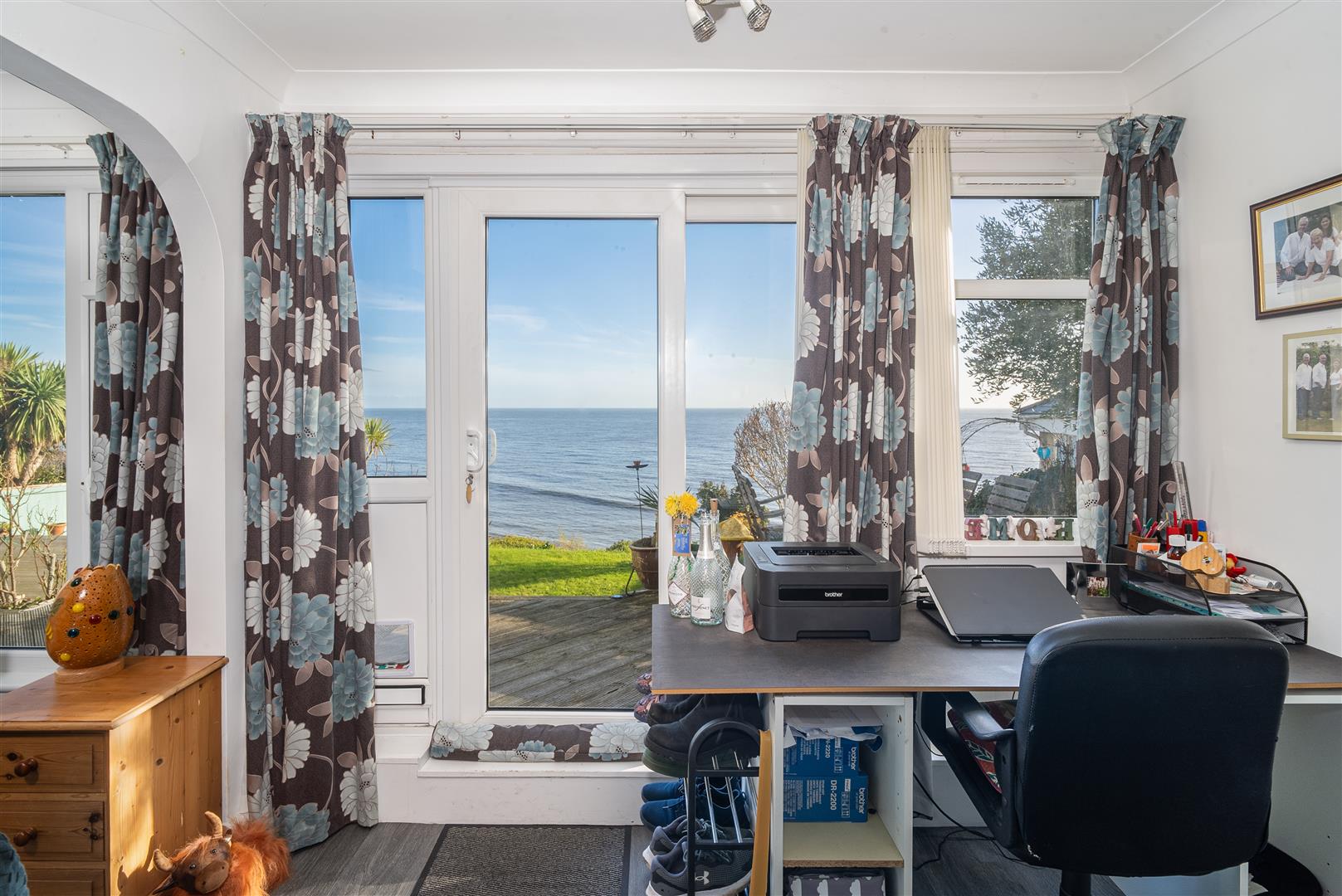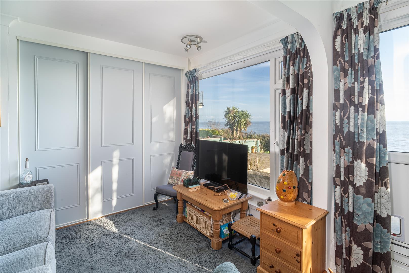 Entered via a glazed sliding door, this bright and versatile room is flooded with natural light from large front-facing windows, which frame superb sea views. Previously utilised as a second bedroom, the space benefits from built-in cabinetry and offers flexibility of use. Finished with attractive wood-effect laminate flooring and neutral décor, this style continues throughout the apartment.