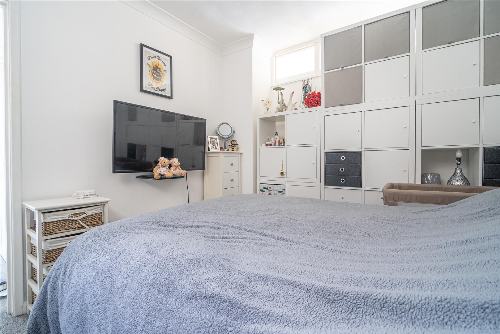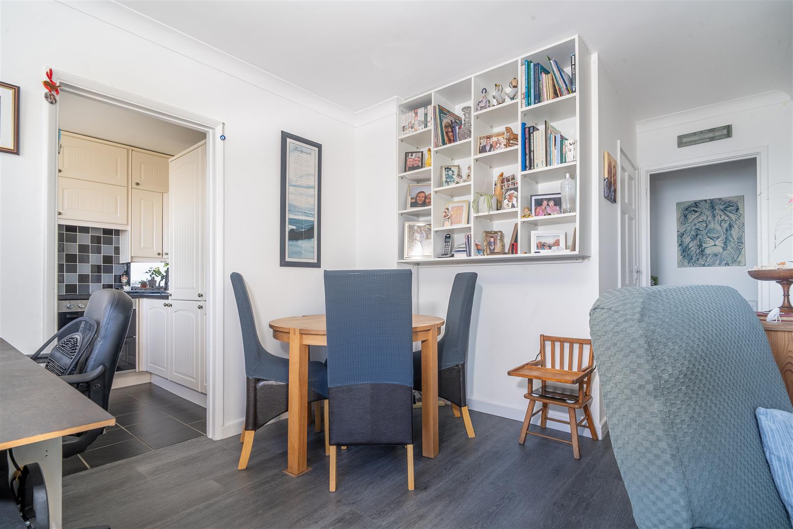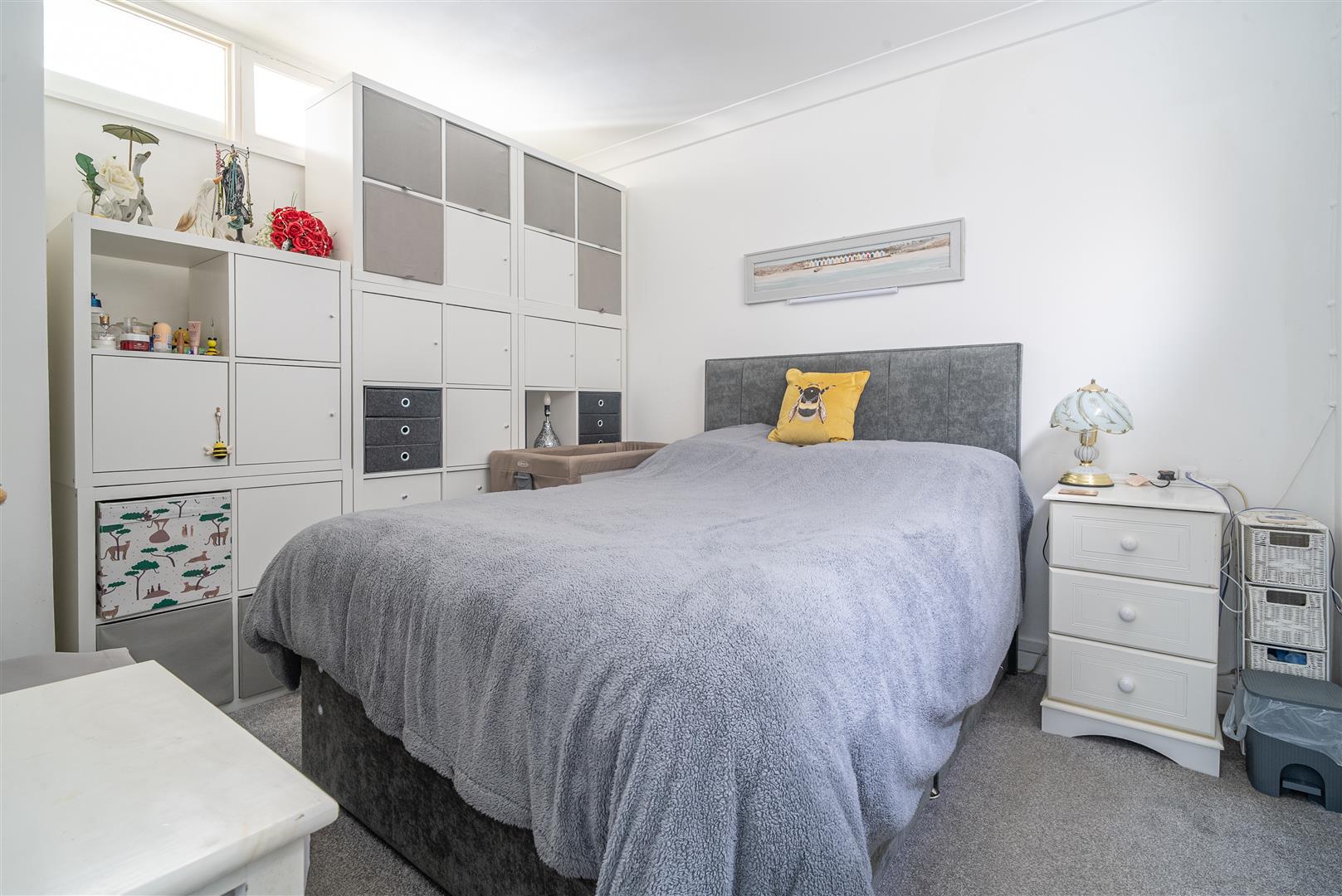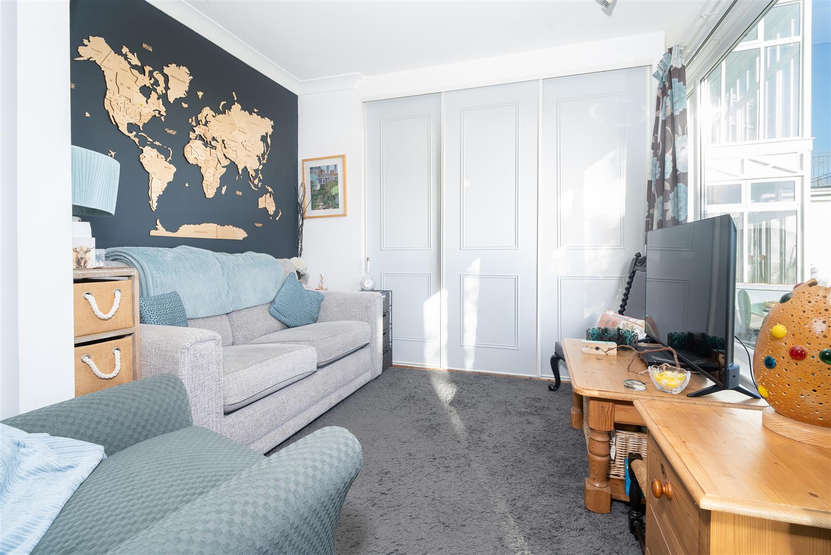 Entered via a glazed sliding door, this bright and versatile room is flooded with natural light from large front-facing windows, which frame superb sea views. Previously utilised as a second bedroom, the space benefits from built-in cabinetry and offers flexibility of use. Finished with attractive wood-effect laminate flooring and neutral décor, this style continues throughout the apartment.