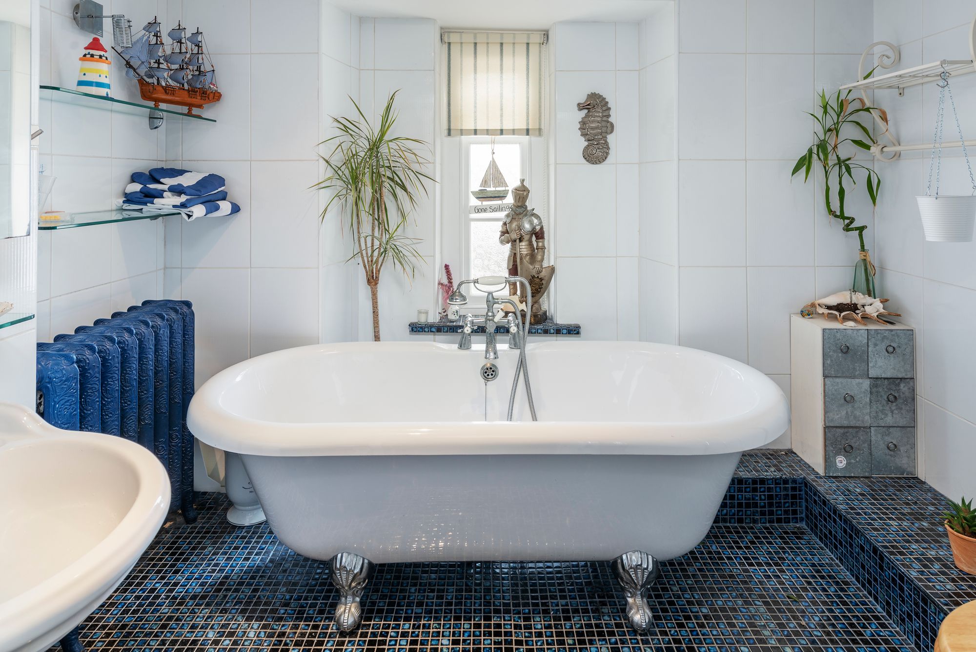 The 3 Double Bedrooms are cosy and comfortable, providing a restful night’s sleep after a day wandering the South West Coastal Paths or out on the river. You can even watch your boat moored on the marina or pick your choice of craft from those you can see from each of the Bedroom windows. And just look at that tub in the family Bathroom - contemporary with its mosaic tiles, yet encapsulating the stylish period touches with the clawfoot bath - ideal for a long soak.