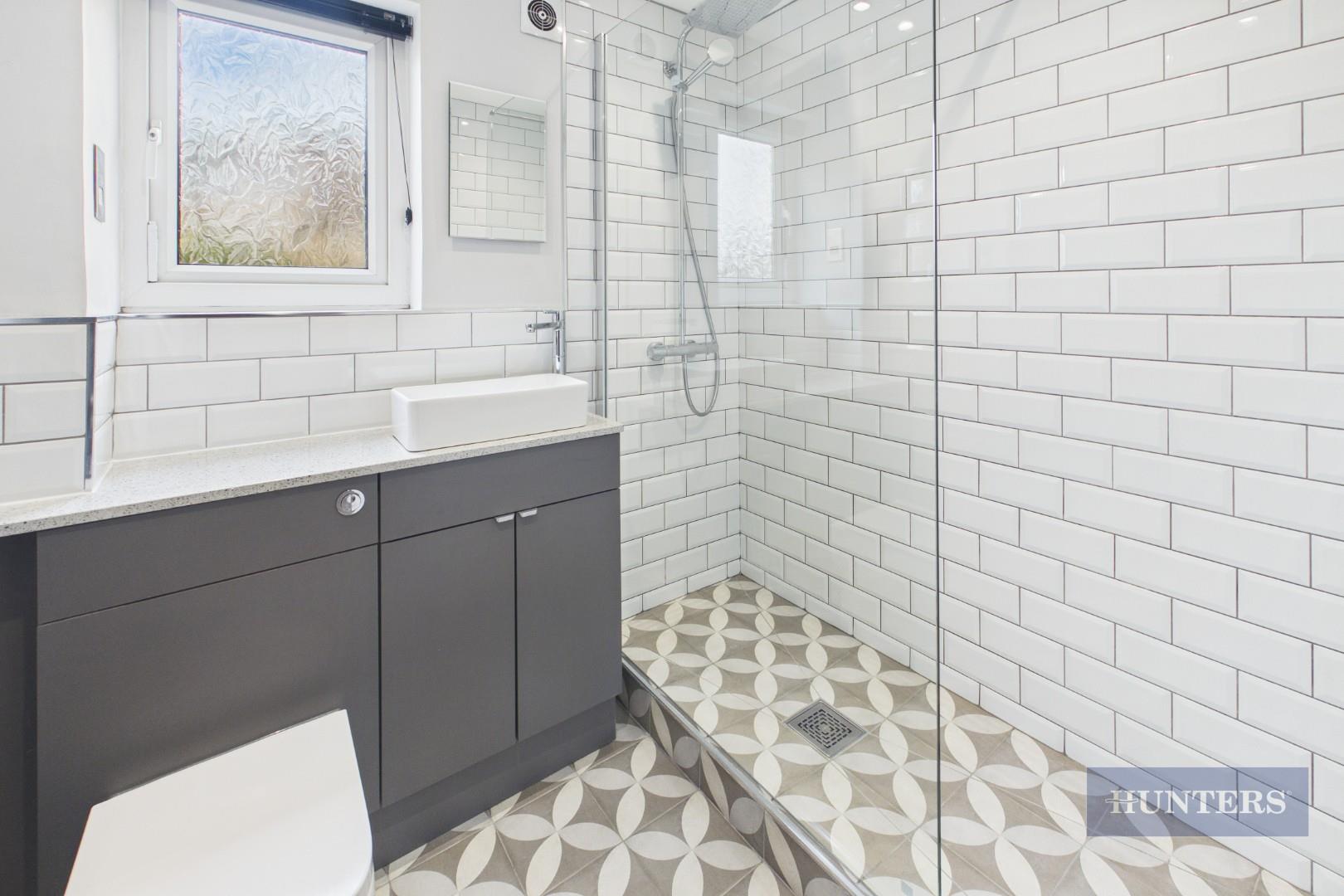 A modern bathroom featuring a walk-in shower, underfloor heating, and a sleek tiled finish completes the interior.