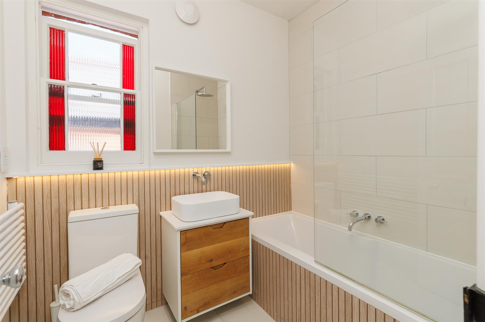 The generously sized principal double bedroom has arched windows looking over the fore of the property, smart panelling behind the bed and pocket doors that open to the ensuite shower room. This well designed area has a fully tiled shower cubicle and a convenient pir light. The final room is a modern family bathroom that has a tiled floor and partly tiled walls, a wc and basin with the bath having an overhead shower.