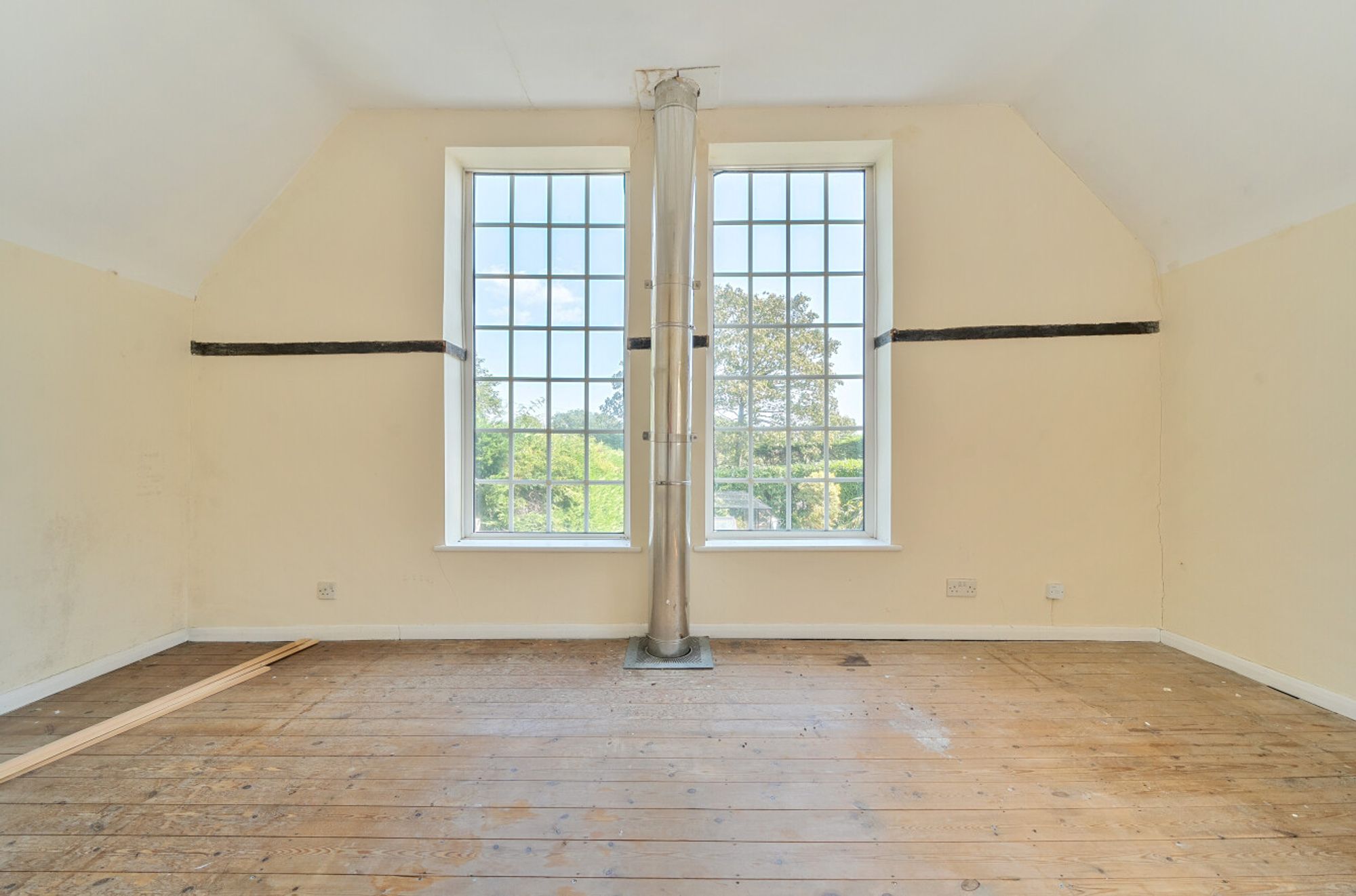 The ground floor includes a cosy sitting room with a feature log burner and triple-aspect windows, allowing natural light to flood the space. The kitchen/dining room is a good size and retains character details such as exposed beams, ideal for those who wish to blend traditional features with contemporary updates.