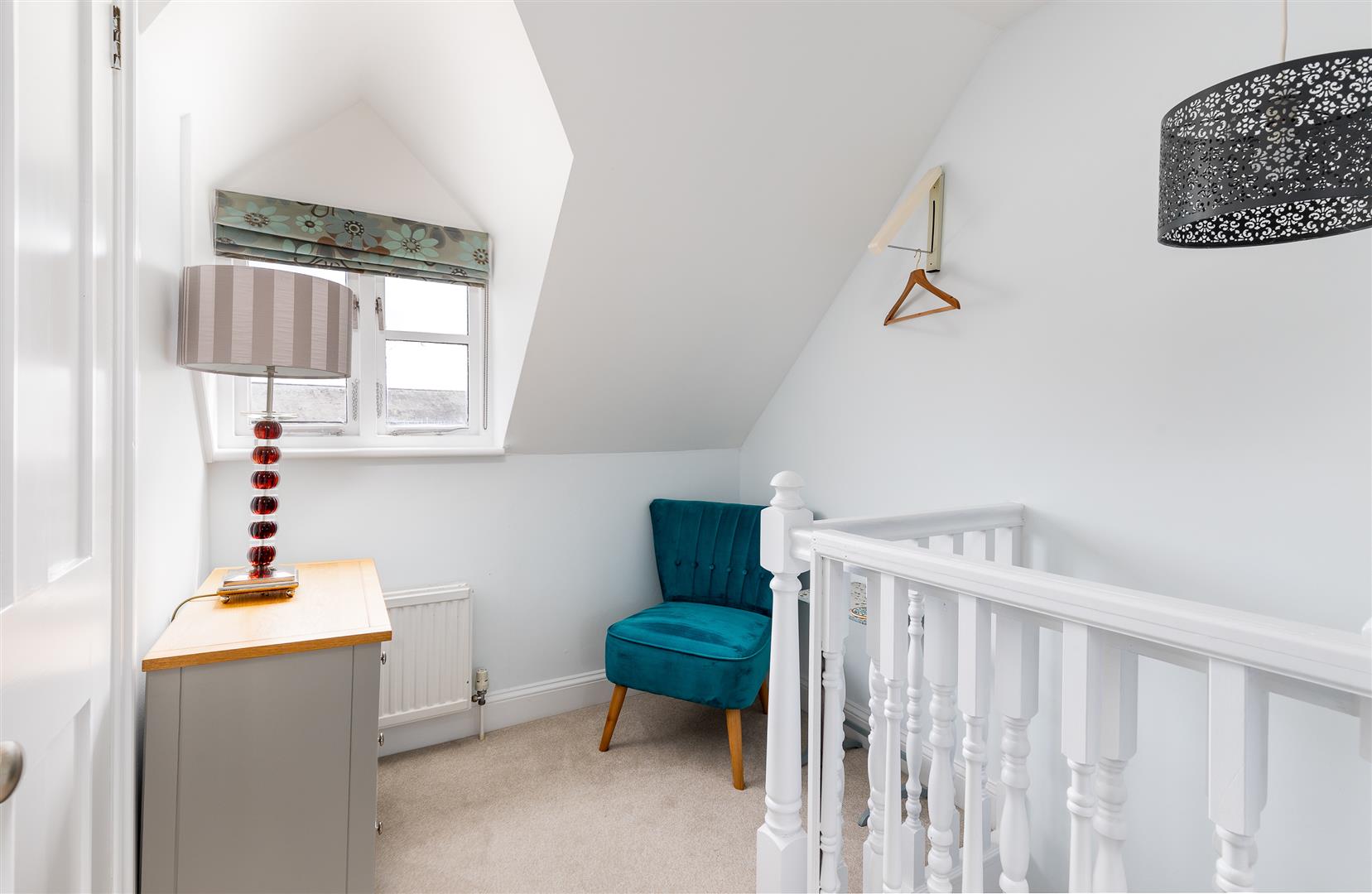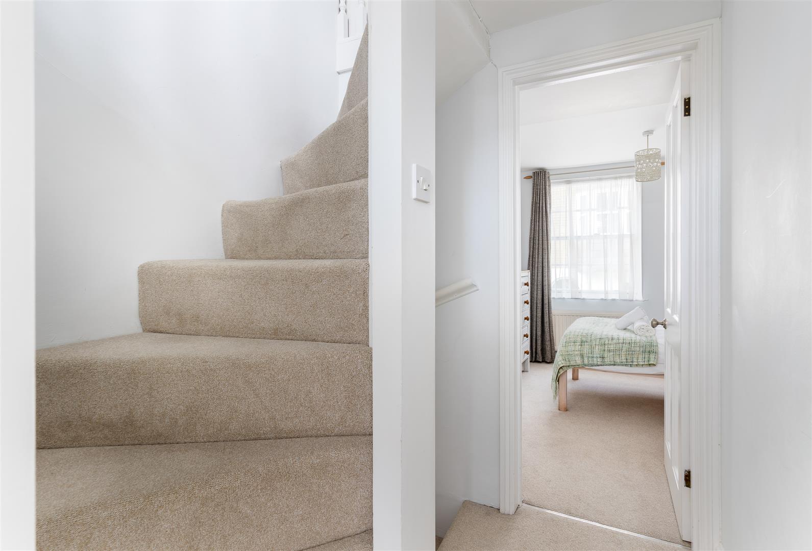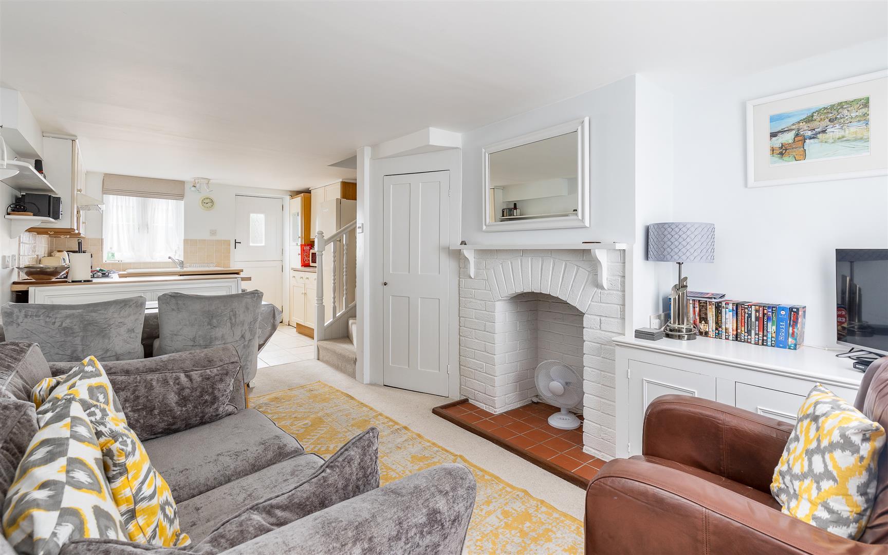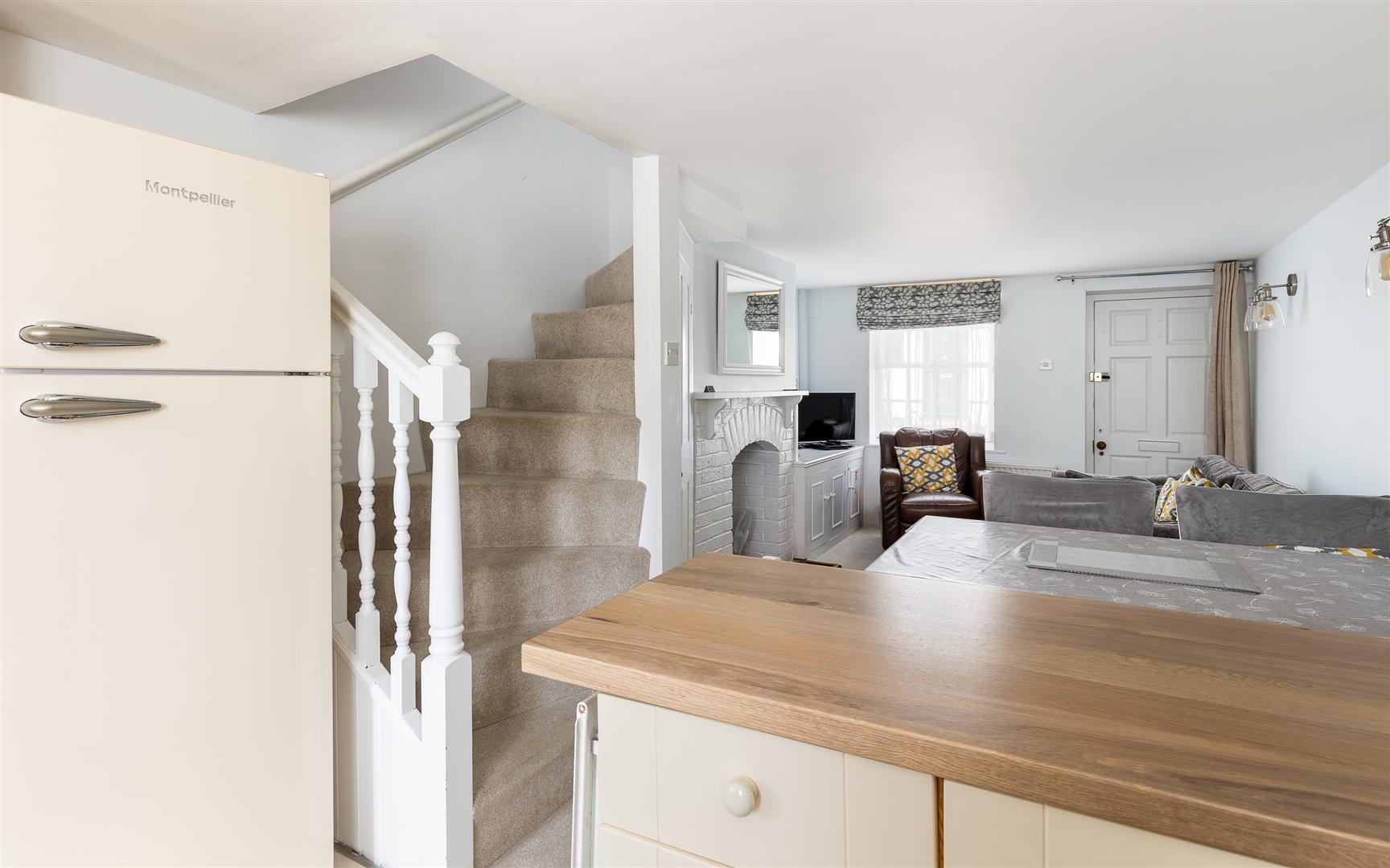 This open plan level is charming and cosy. The sitting and dining area has a whitewashed feature fireplace with terracotta tiled hearth, built in low level cupboards as well as an understairs cupboard.
