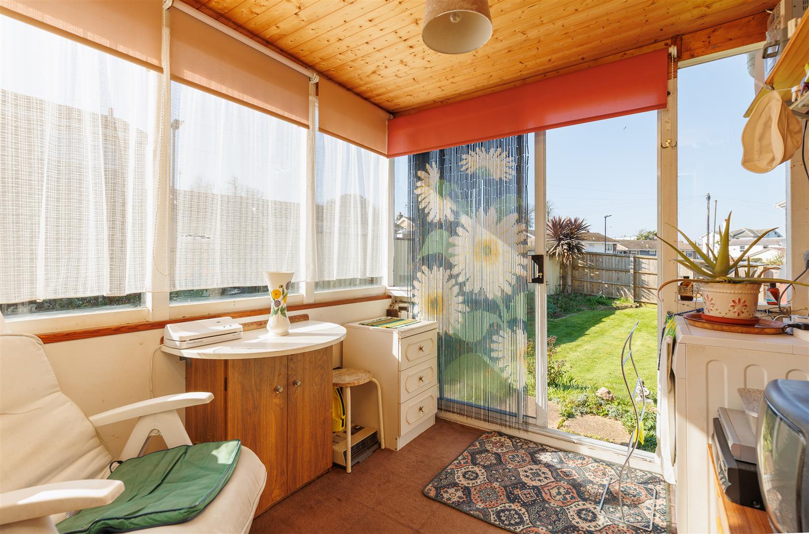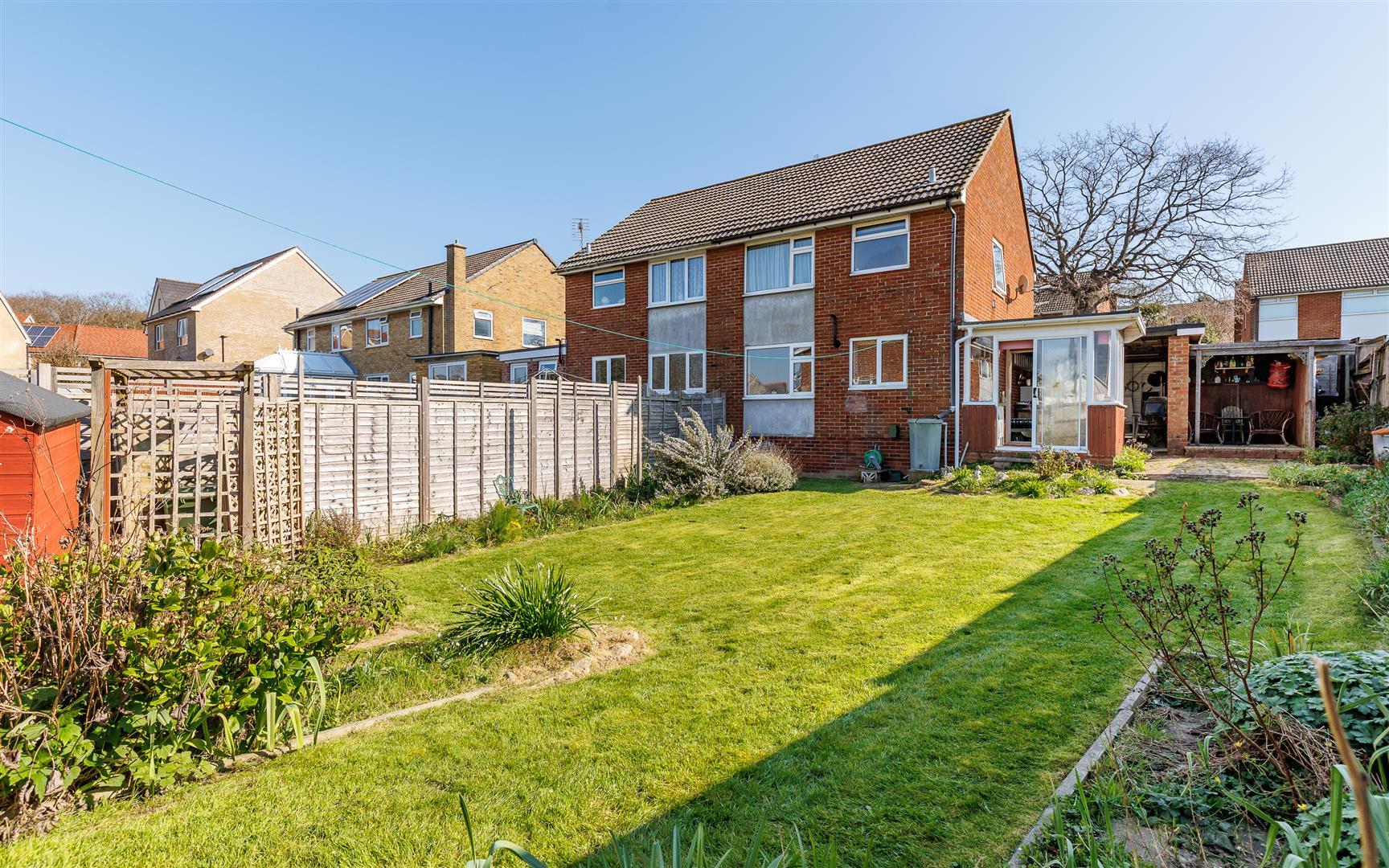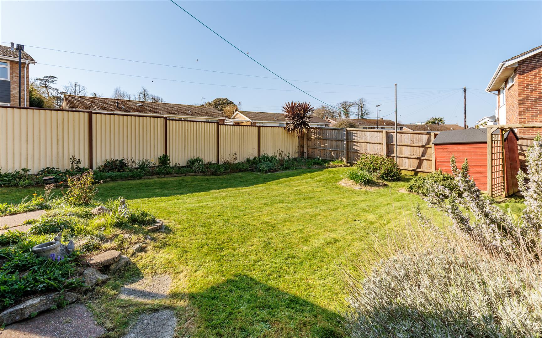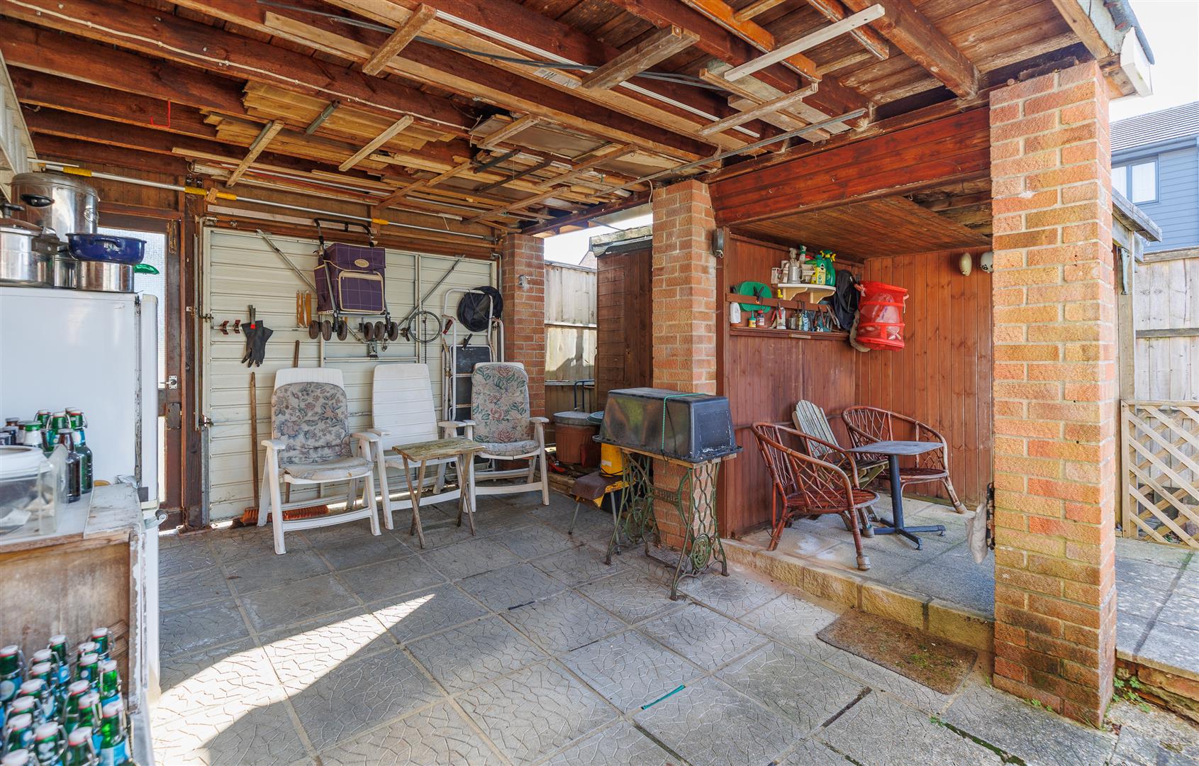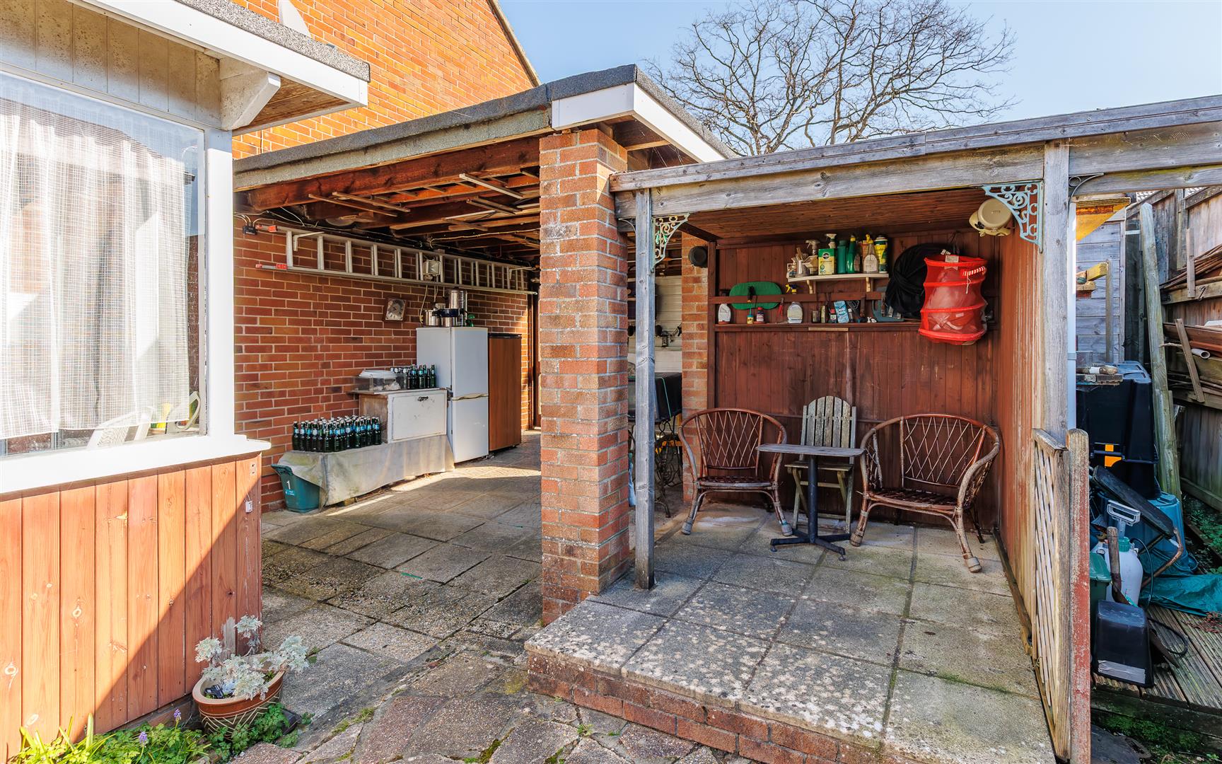The rear outside space, that is kept in sunshine from late morning, is mainly lawn with mature borders that includes lavender bushes. The car port has been adapted into an open covered area, perfect for outside hobbies or a workshop as well as there being a separate sheltered seating space to enjoy the peace and quiet. Additionally, within this secluded garden there are two garden stores.