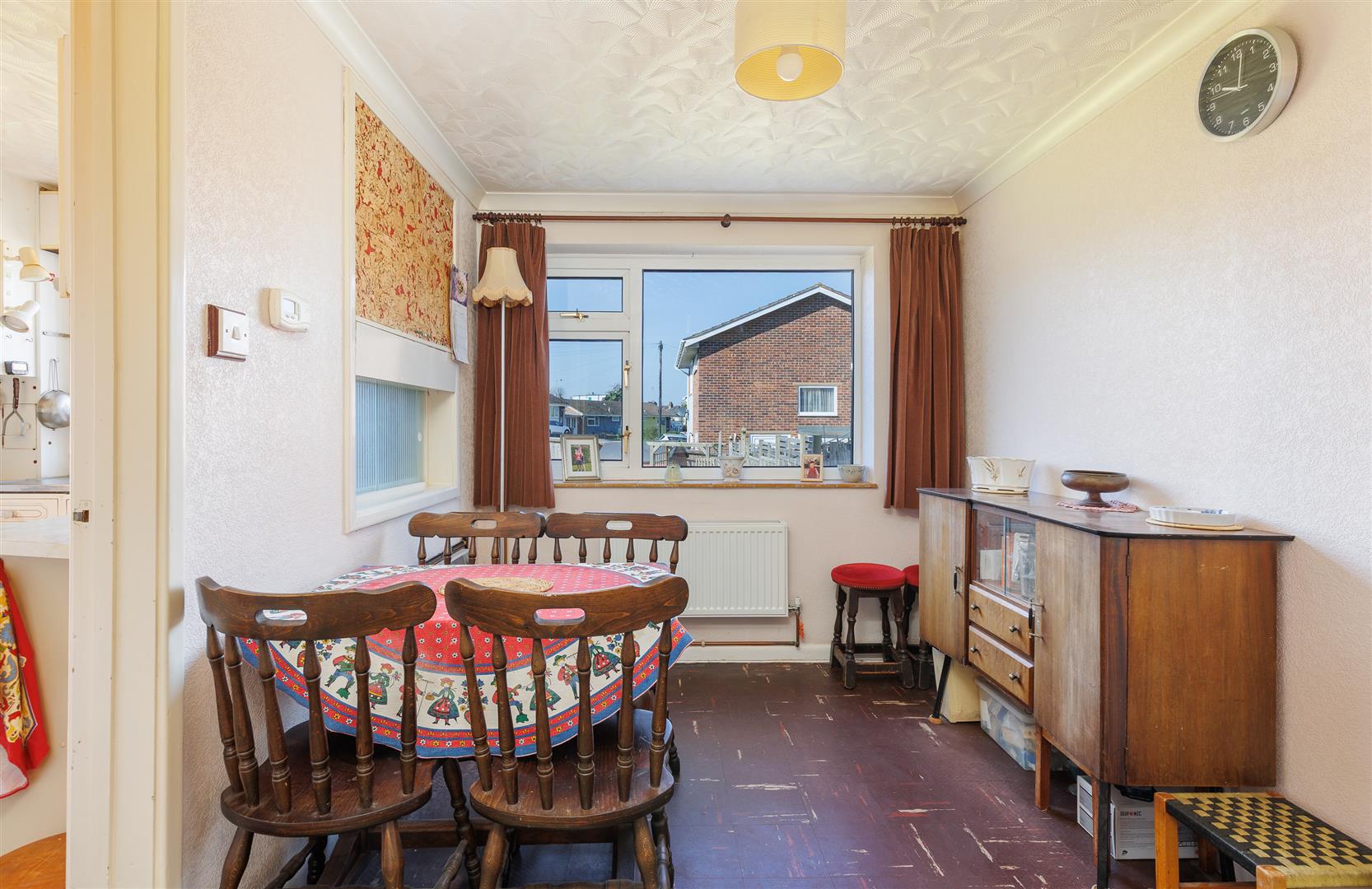 The hallway has the flight of stairs leading to the upper floor and gives access to the good sized sitting room with its large window that allows the room to be bathed in daylight. This room, with a large understairs cupboard, has an electric fire upon a terracotta tiled hearth and flows through to a dining area with views out to the garden and a useful glazed hatch to the kitchen.