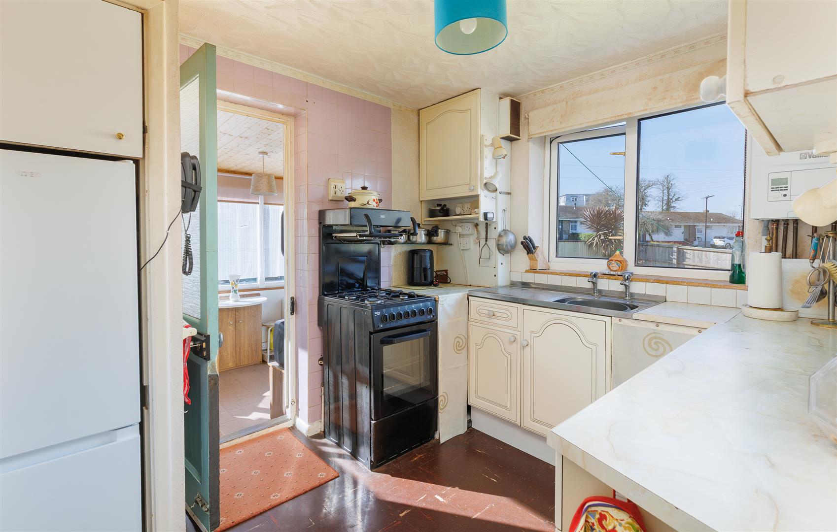 The kitchen, with its cream wall and base units and space for a freestanding cooker and a fridge freezer, follows through to the sun room with sliding doors to the garden.