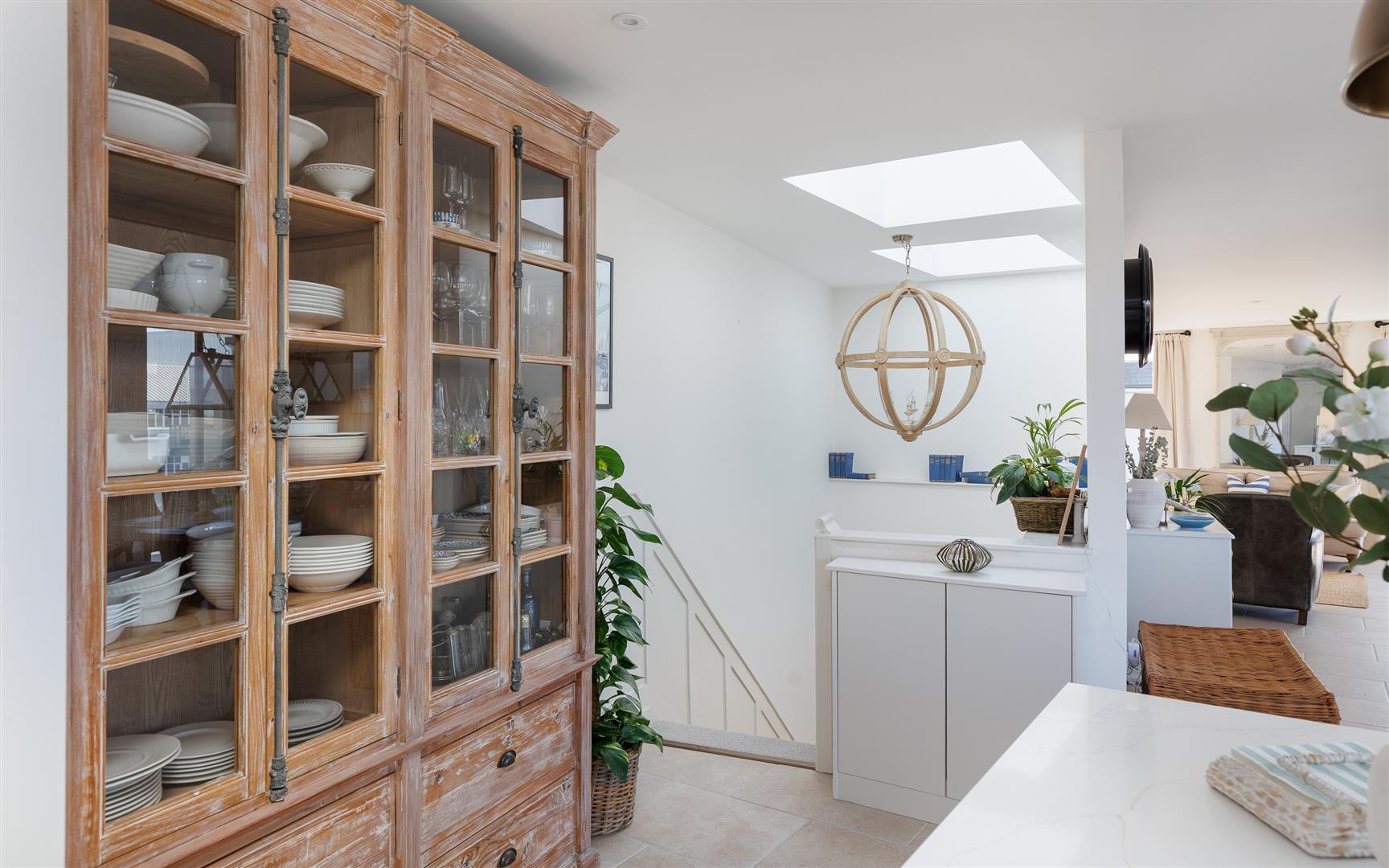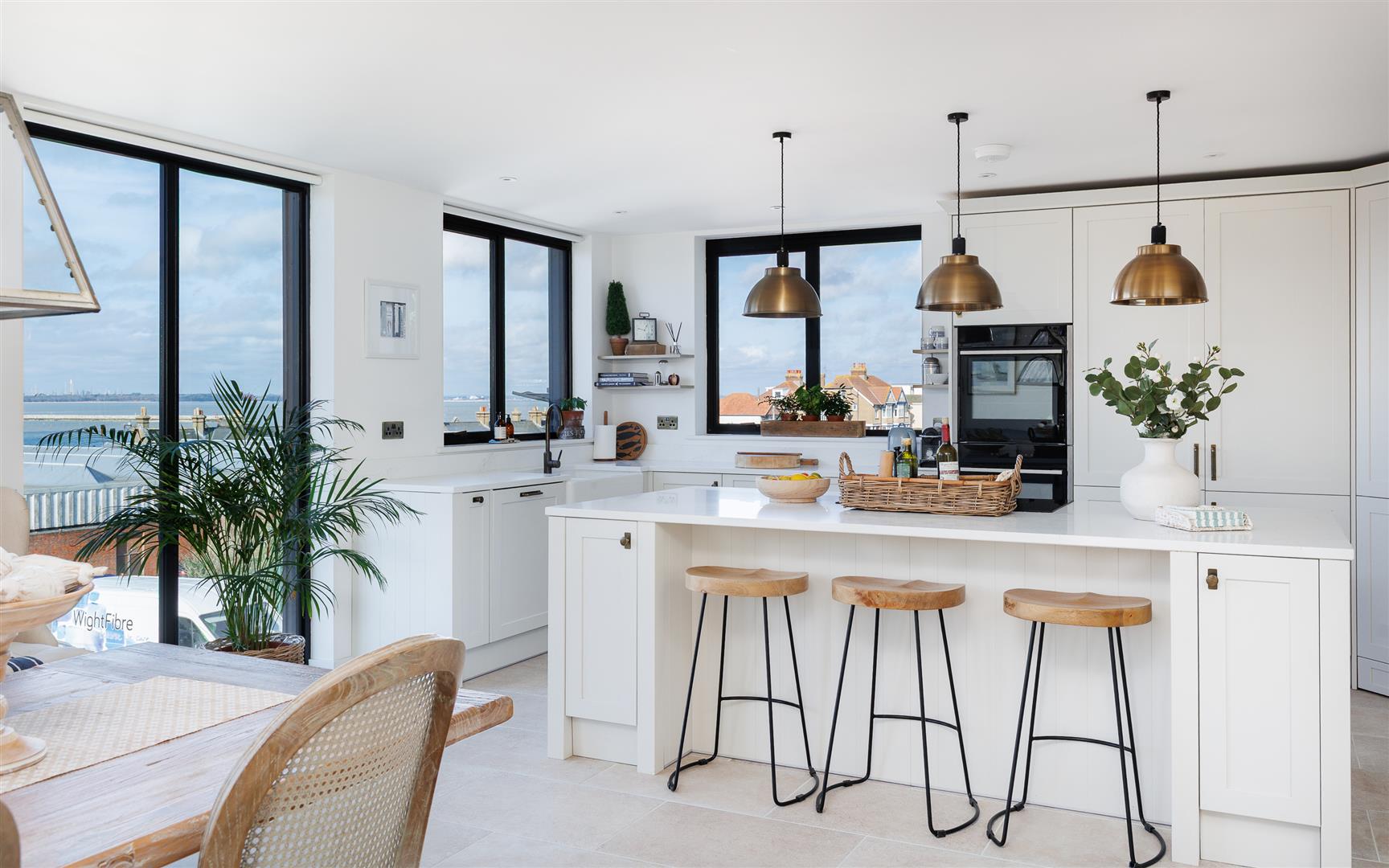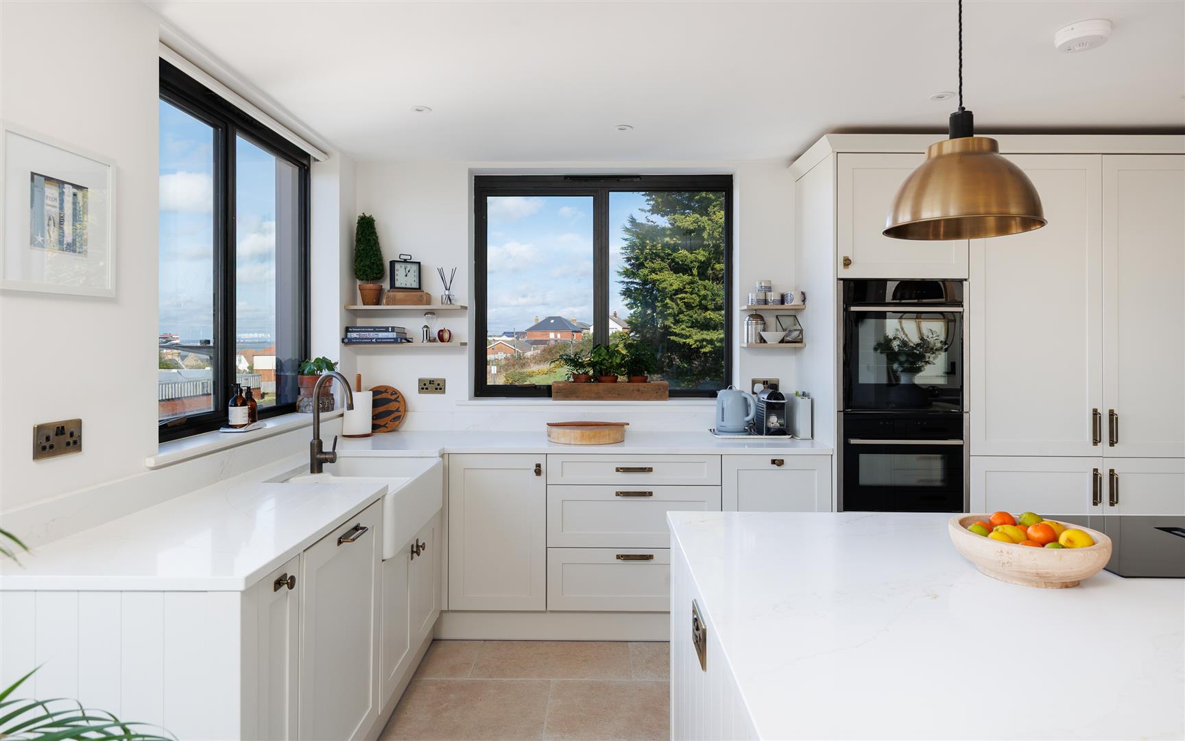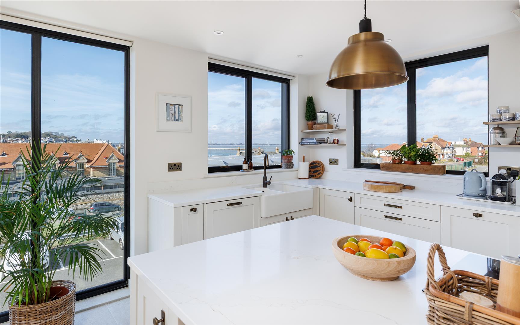 This pristine home is bright and airy throughout and has been thoughtfully created to maximise the views and use of space with plenty of storage and easy maintenance. It is decorated in soft neutral tones with light stone tiles flowing through the hallway and the open plan first floor, both with underfloor heating.