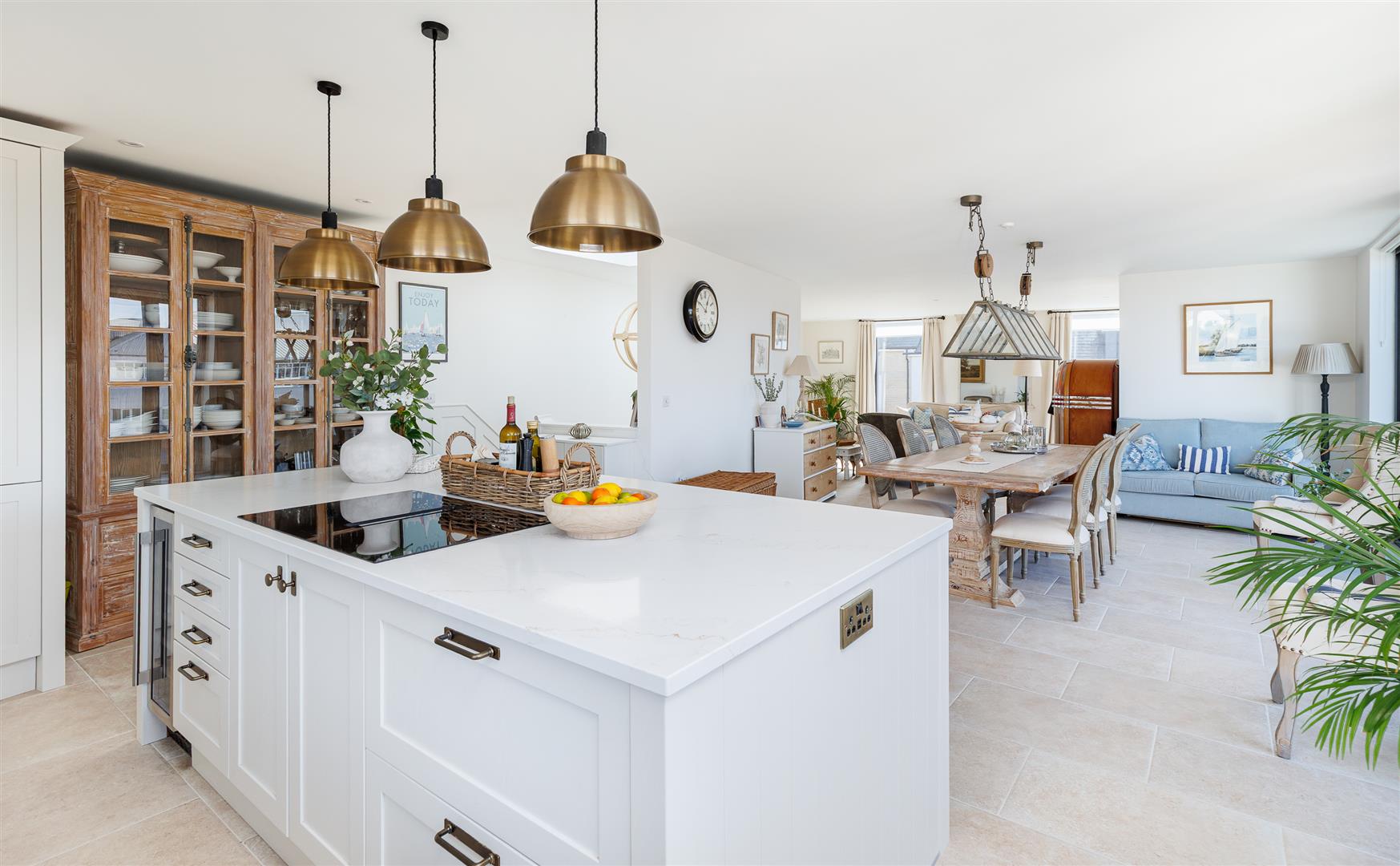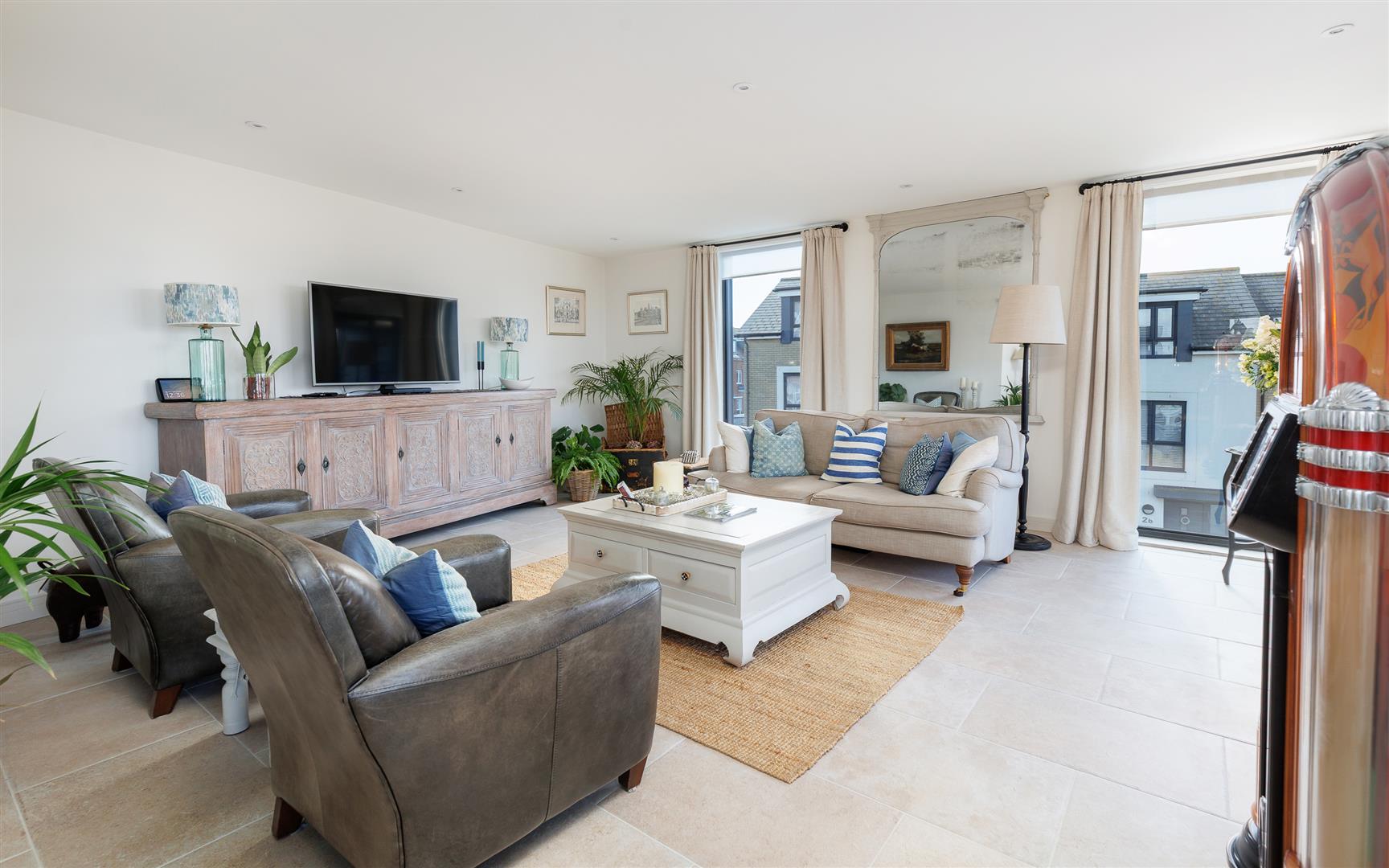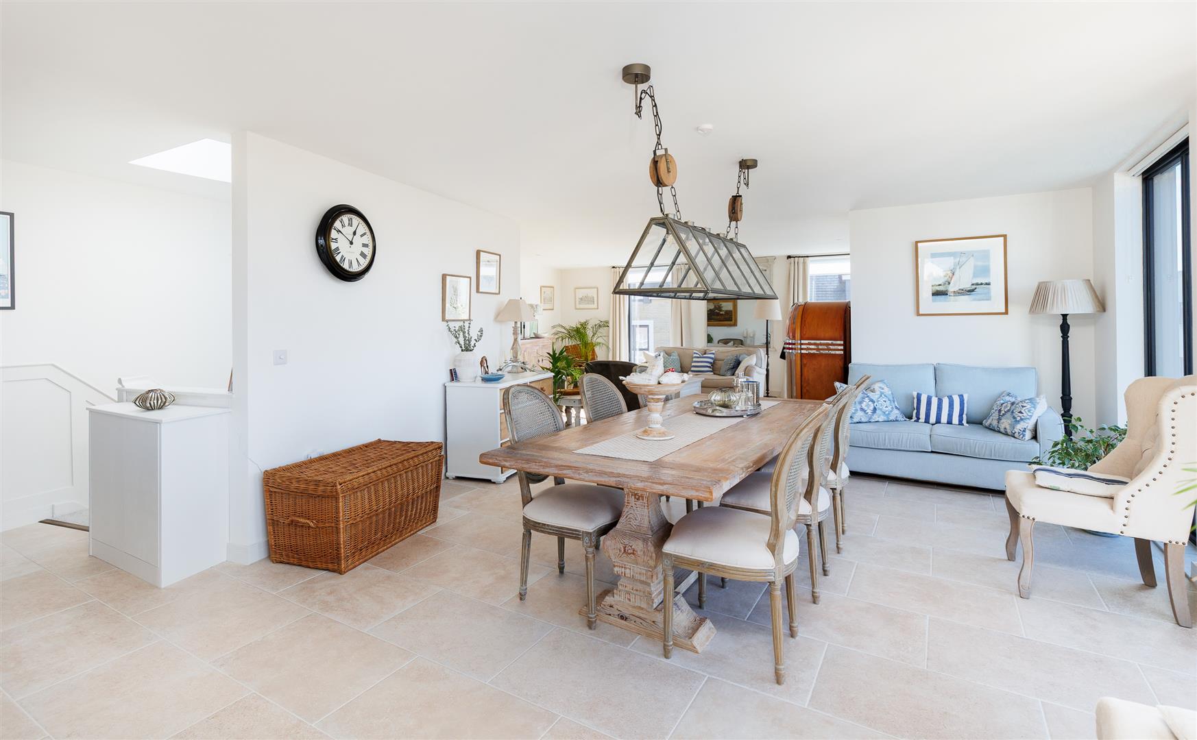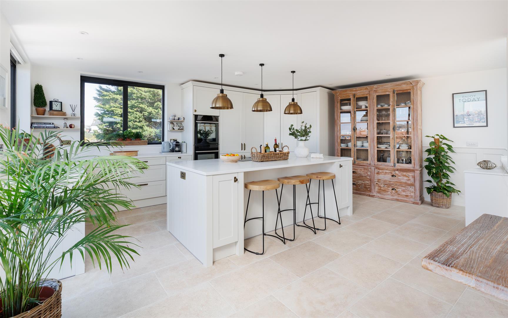 This pristine home is bright and airy throughout and has been thoughtfully created to maximise the views and use of space with plenty of storage and easy maintenance. It is decorated in soft neutral tones with light stone tiles flowing through the hallway and the open plan first floor, both with underfloor heating.