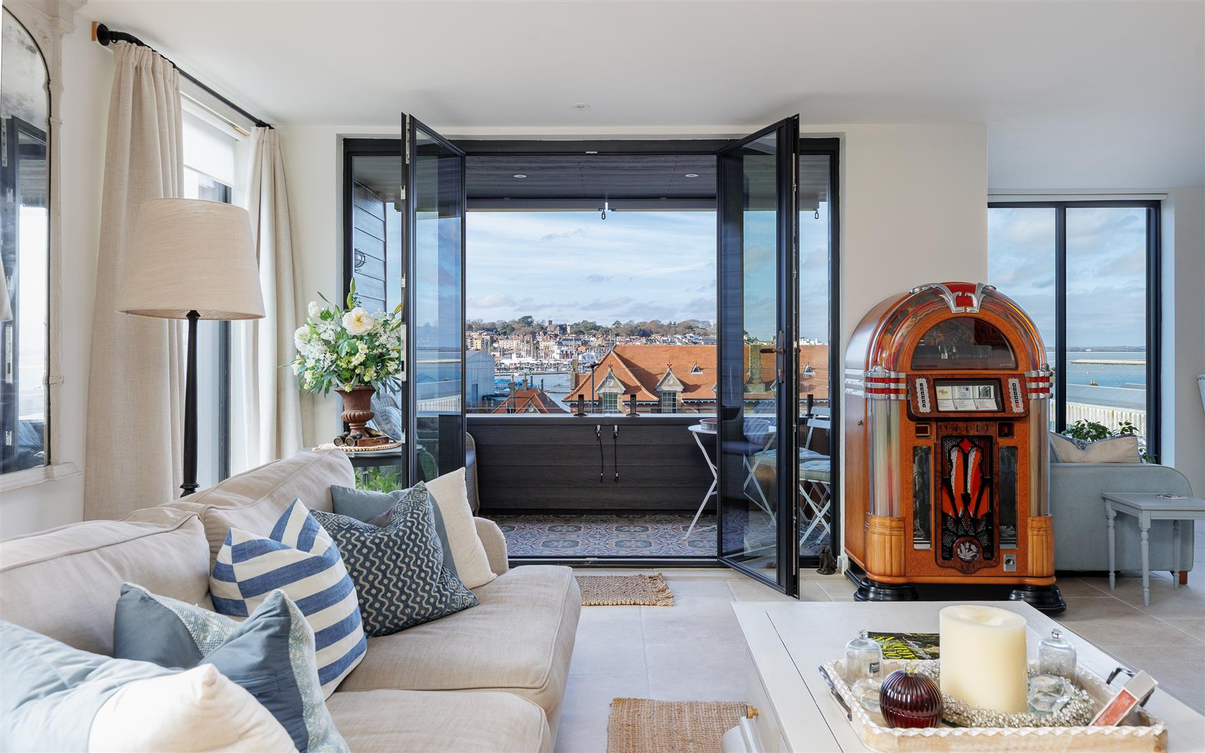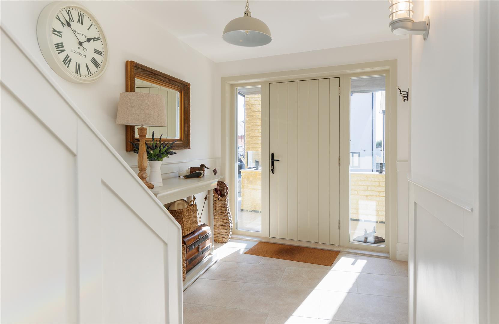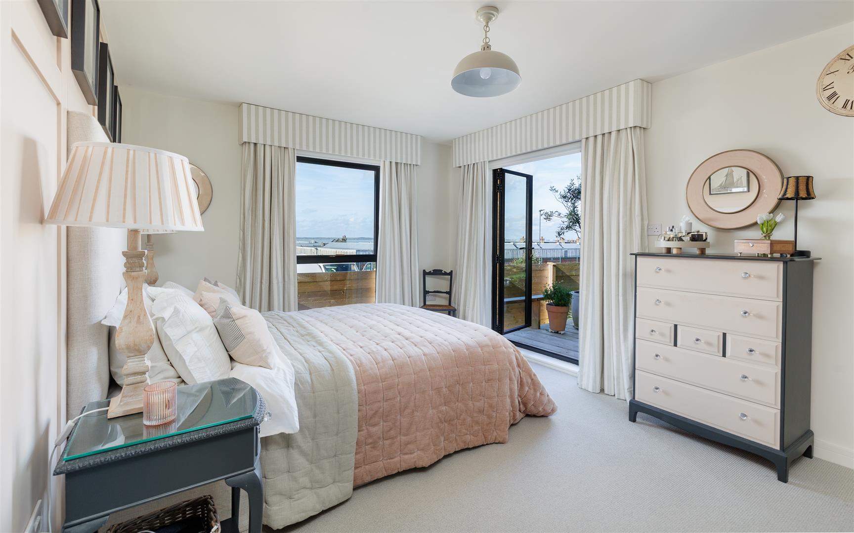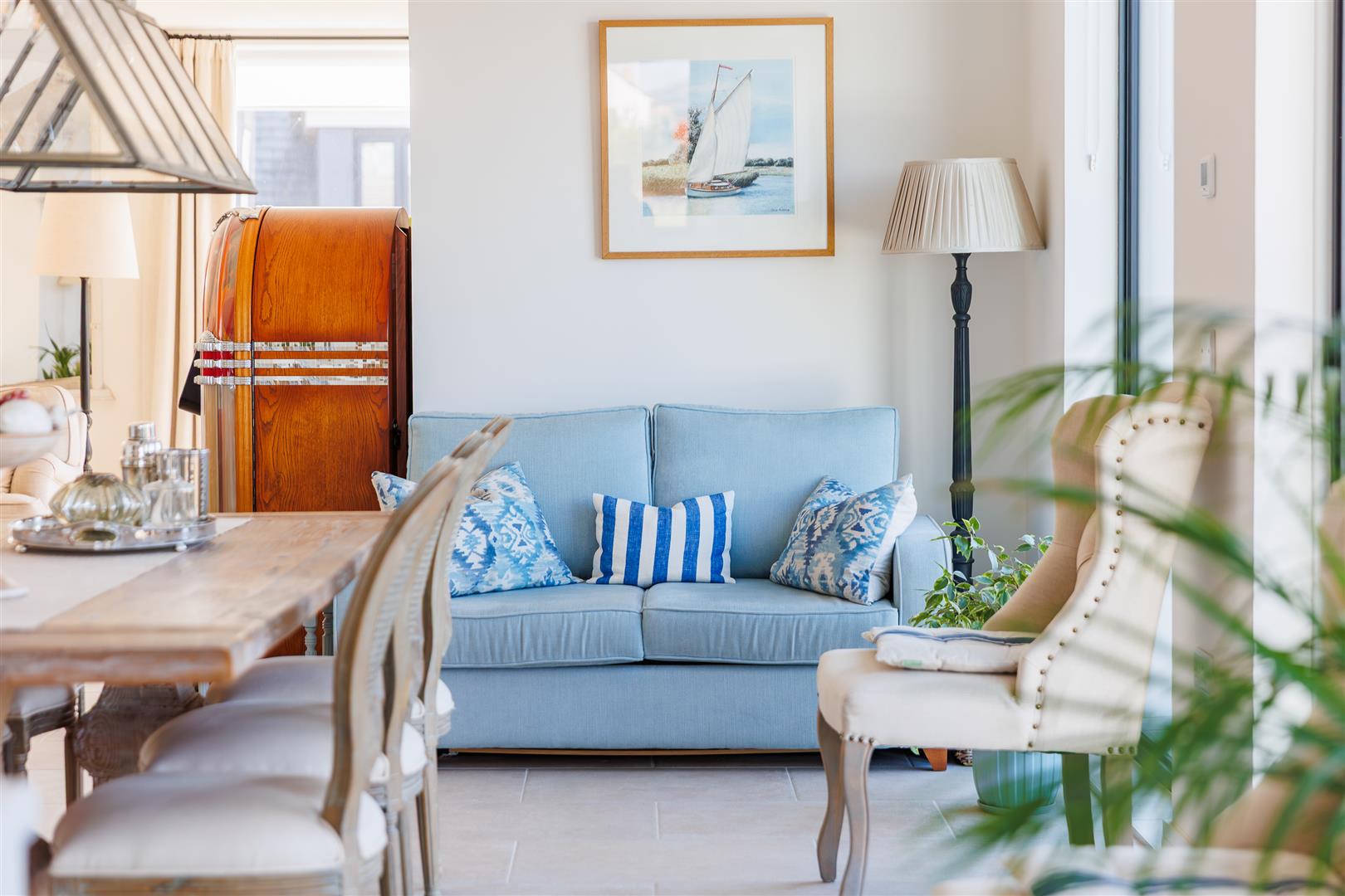 This pristine home is bright and airy throughout and has been thoughtfully created to maximise the views and use of space with plenty of storage and easy maintenance. It is decorated in soft neutral tones with light stone tiles flowing through the hallway and the open plan first floor, both with underfloor heating.