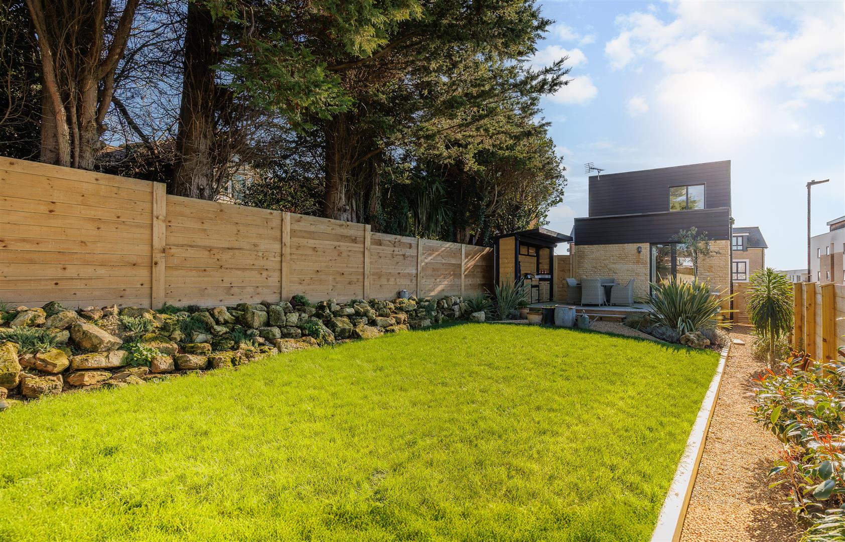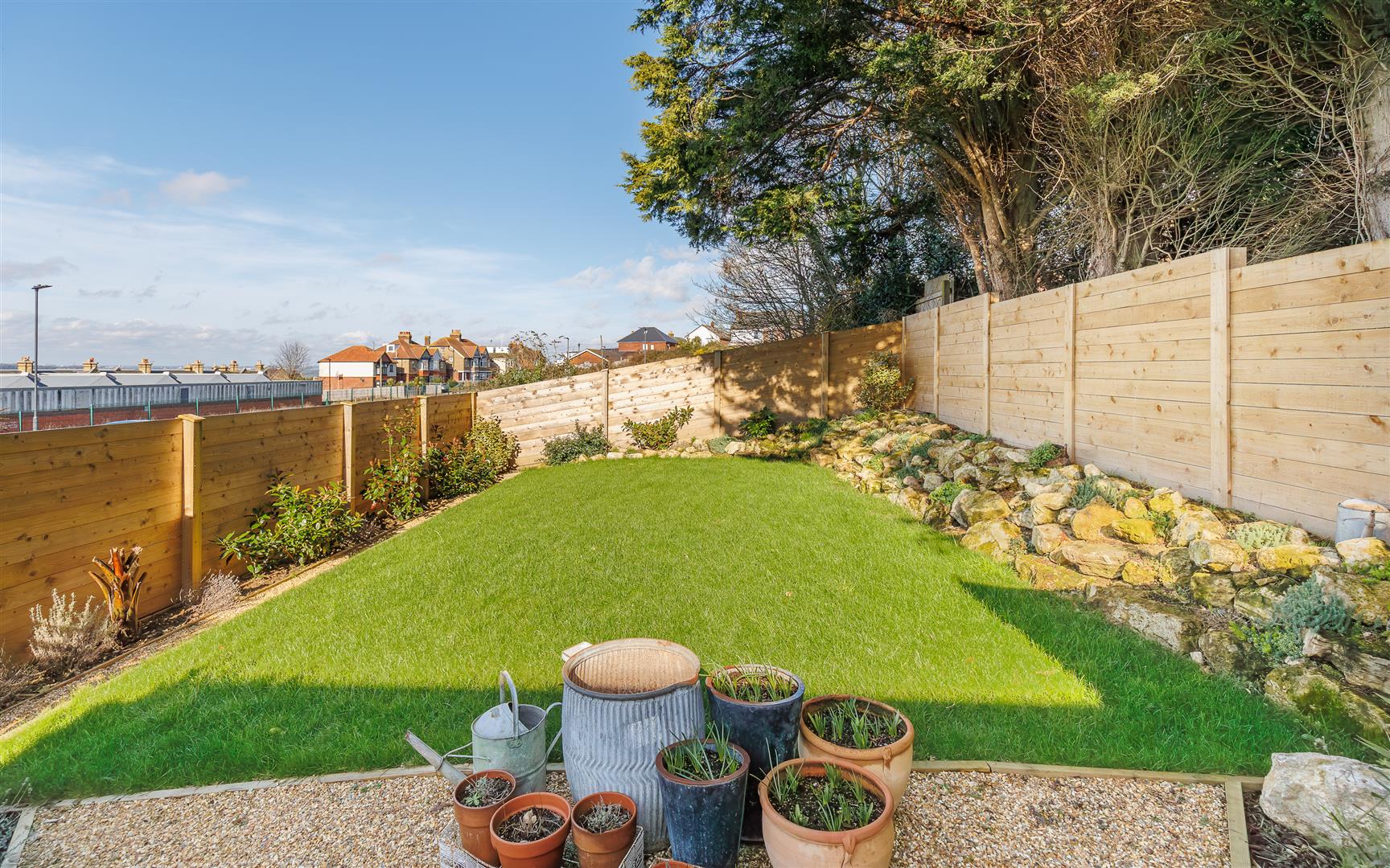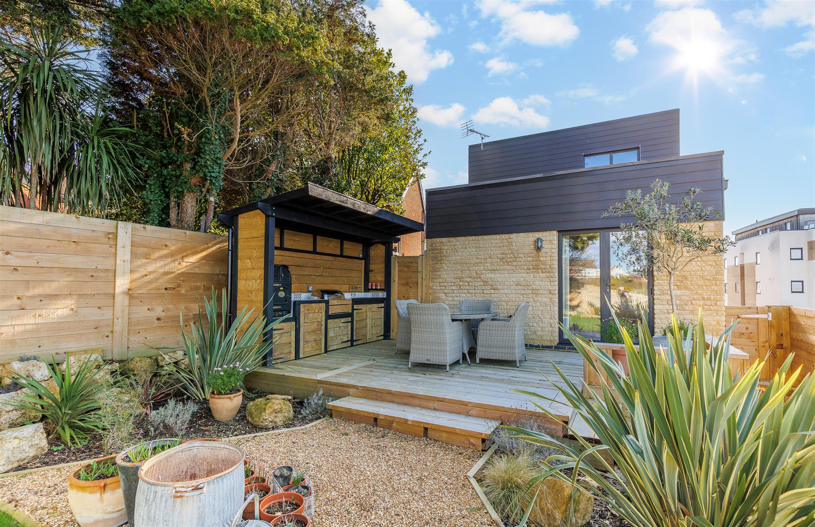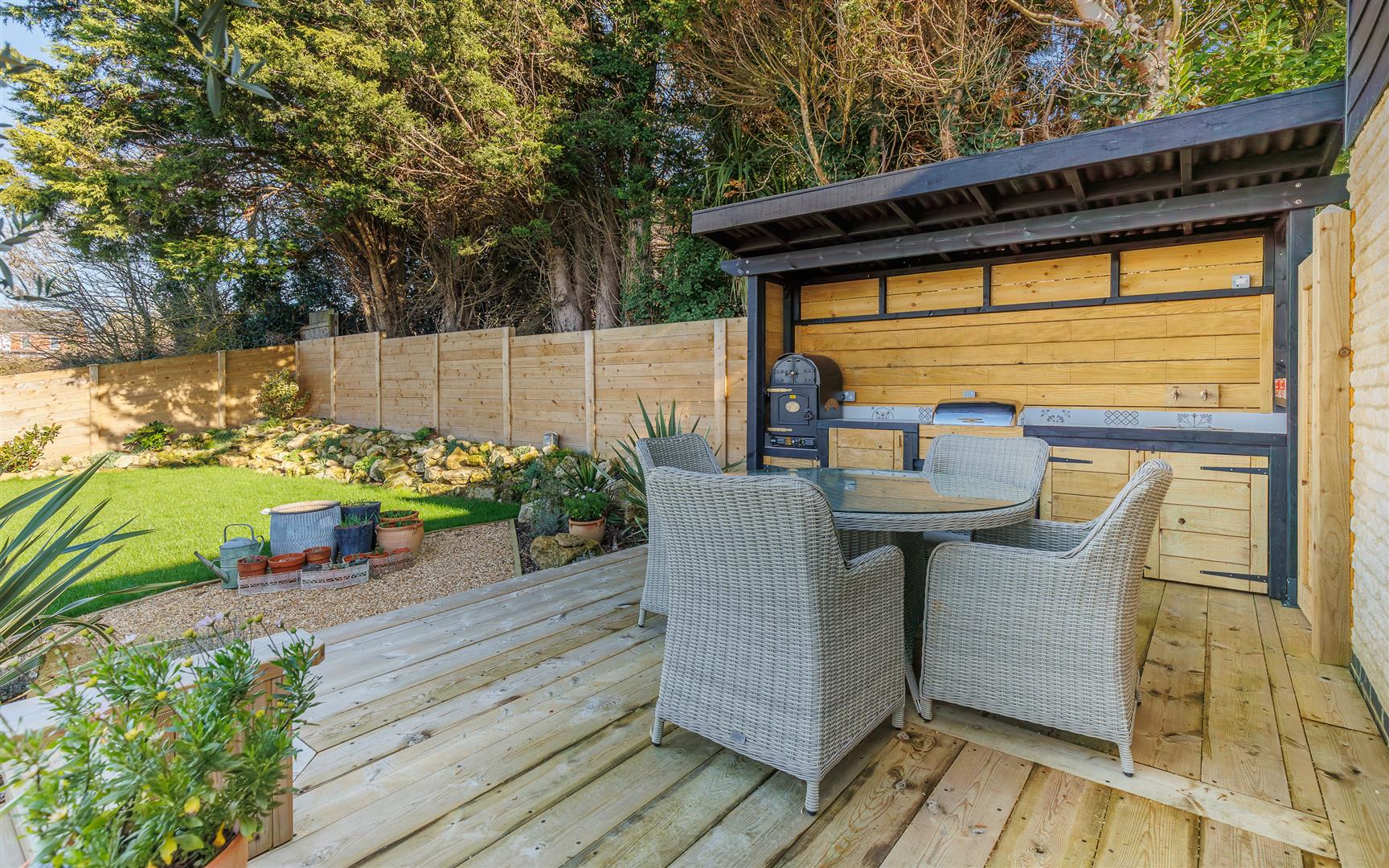 This beautifully maintained landscaped garden has wooden fencing on all sides and contains a lawned area, rockery garden, mature plants and a fabulous decked area where the gorgeous sun sets can be enjoyed. Adjacent to this pretty area is a wonderful outdoor bespoke kitchen containing a bbq grill, sink, fridge and oven - absolutely everything you need to enjoy outside living and socialising.