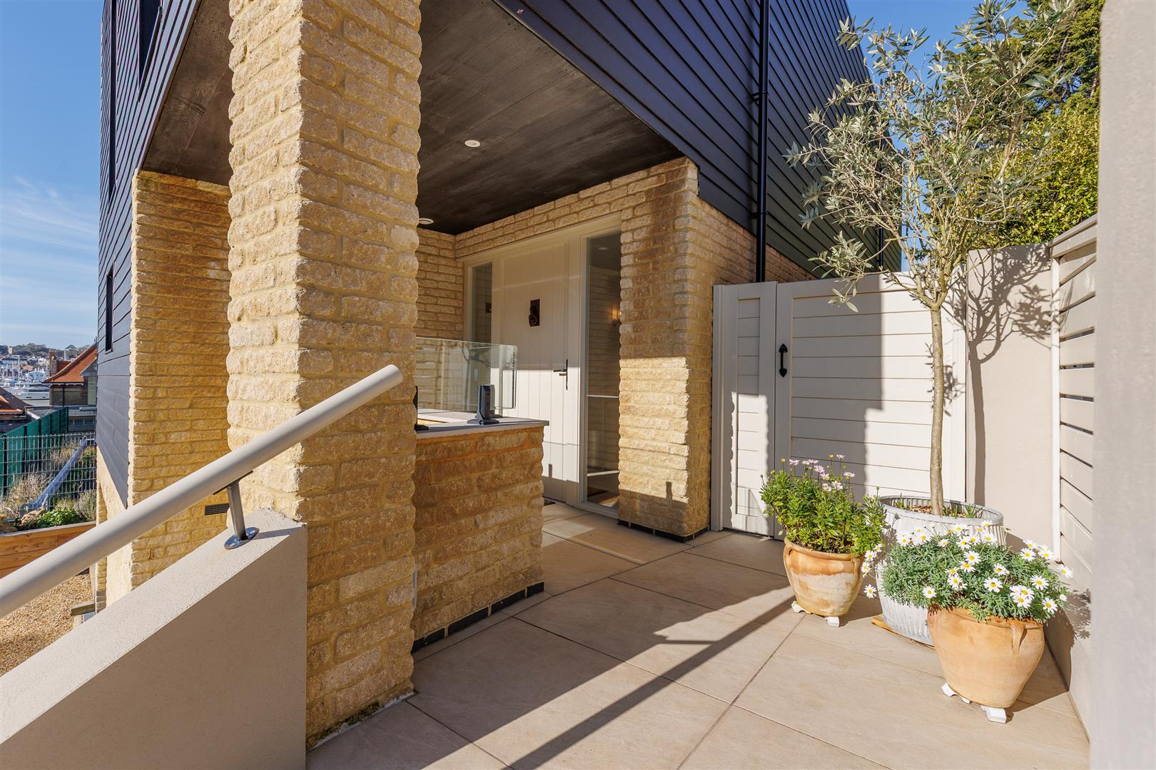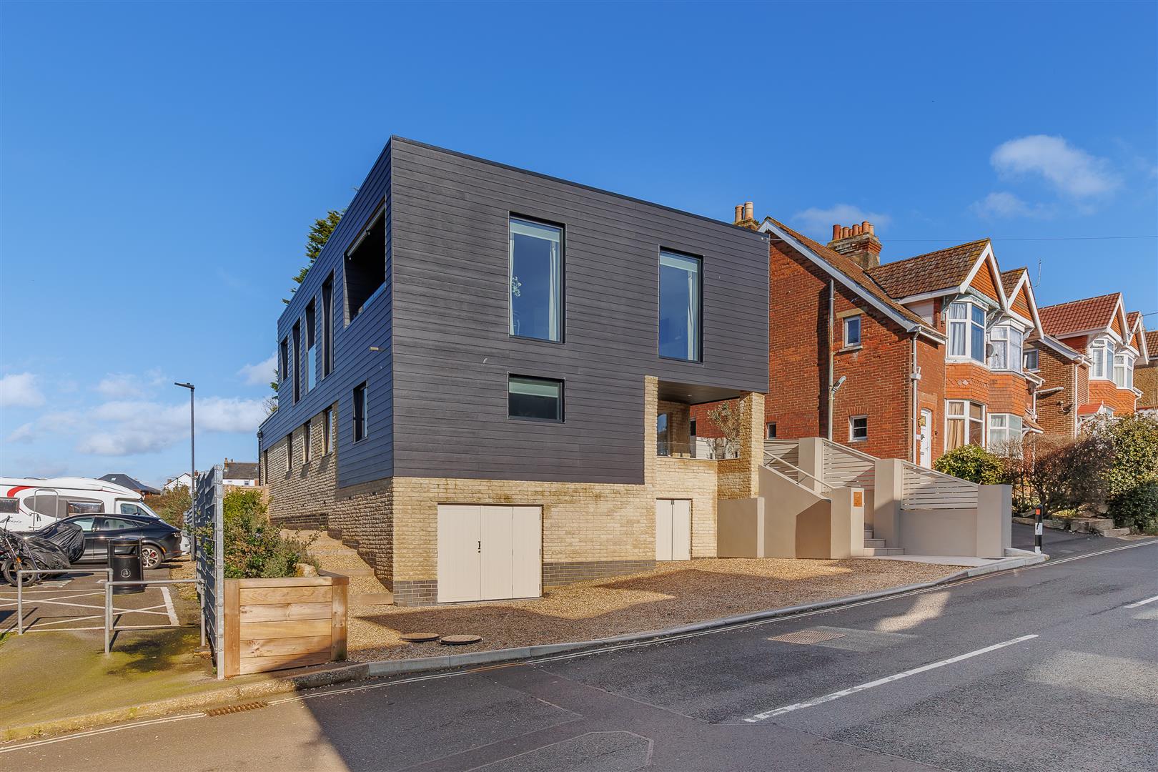 This impressive contemporary house rises up on its elevated aspect and has unrestricted views out to sea across interesting rooftops. There is a shingle driveway for three vehicles along with a secure bin store and a garage/workshop/storage for dingeys and water sports equipment, hidden beneath the building. A small flight of steps, with outdoor lighting, leads up to the entrance door that is shielded from the elements. There is access either side of the building, with shingle paths, leading to the rear garden.