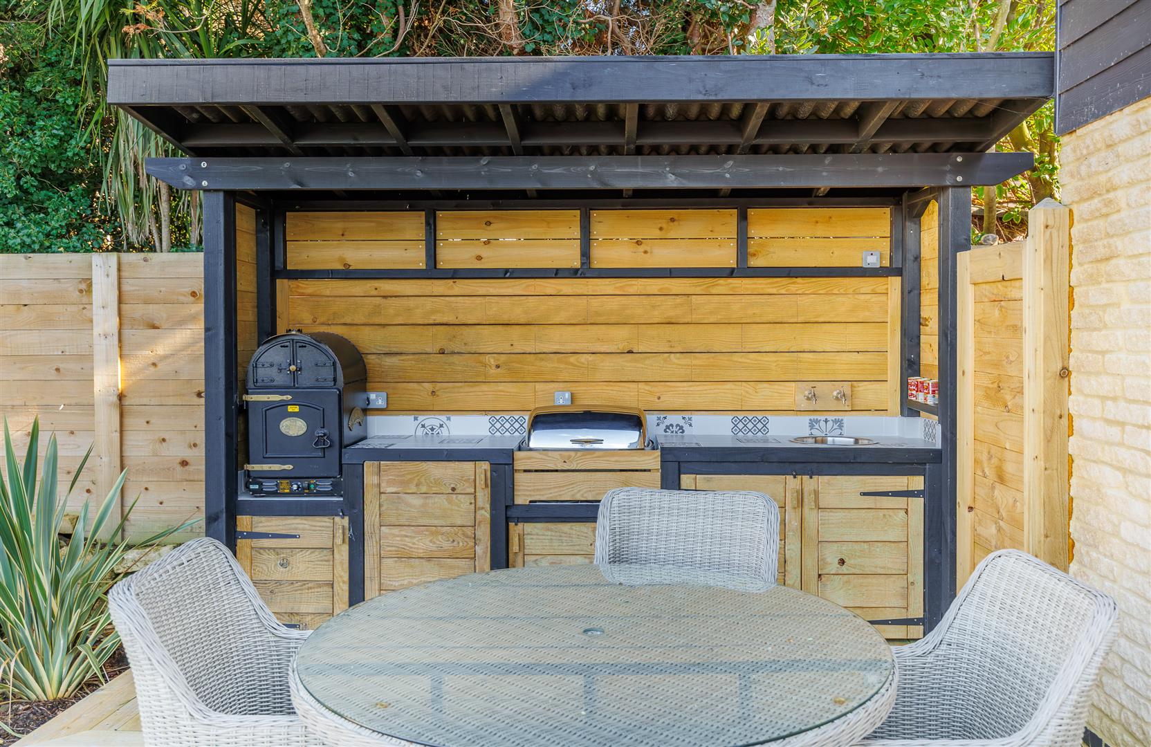 - Bespoke outdoor kitchen including oven, sink and grill