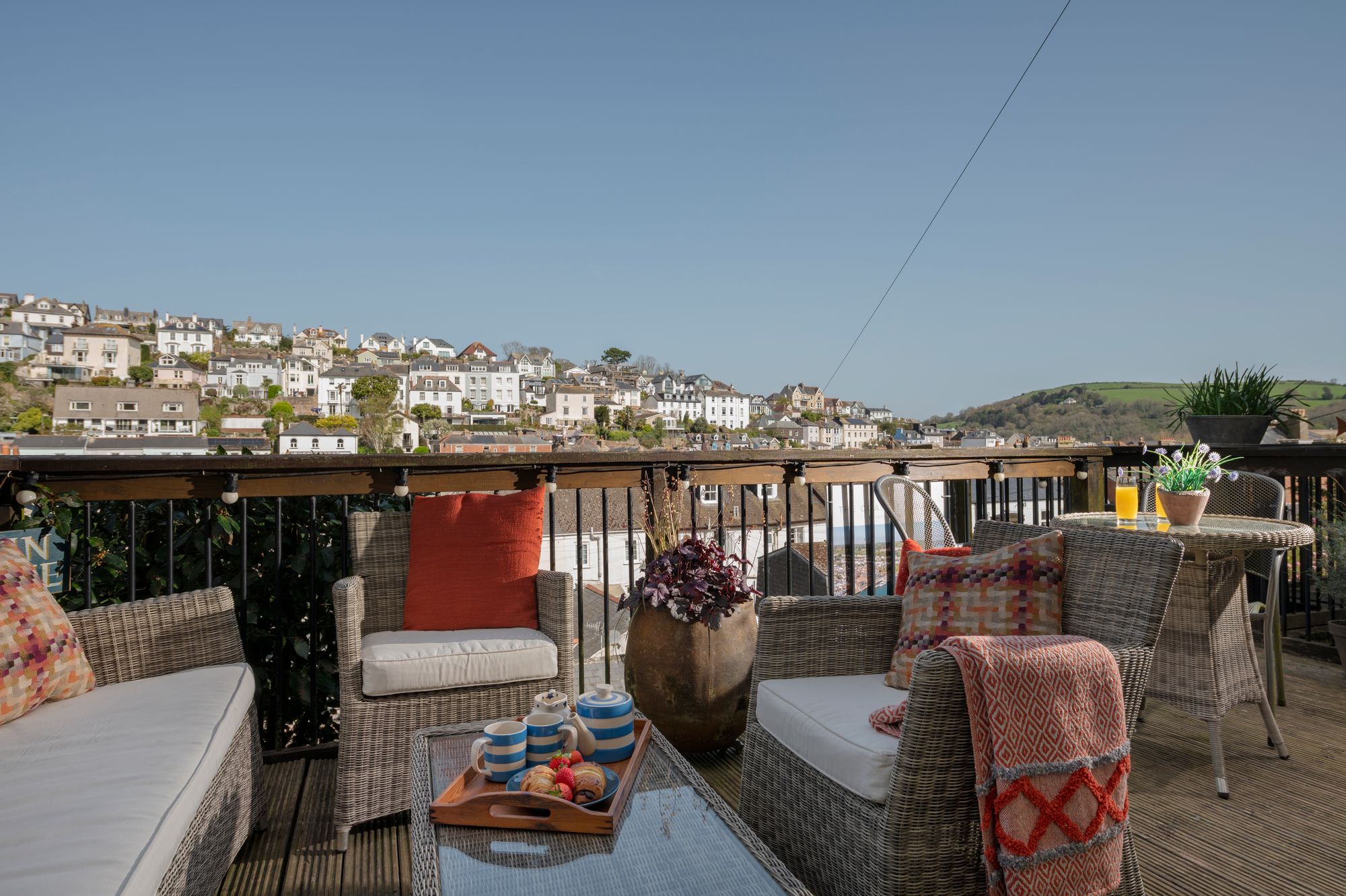 One floor below, the home opens fully into a striking open-plan Kitchen/Dining Room that spans the width of the home. The coastal palette of the cabinetry feels perfectly suited to Dartmouth’s maritime character, complemented by a generous range cooker and another distinctive Fireplace. This is a space designed for conversation, for long breakfasts and for gatherings that drift naturally towards the outdoors. A glazed door leads directly onto a wide Decked Terrace that benefits from the sun for much of the day. Below this, two further Patio areas provide room for a lovely garden or outdoor storage.