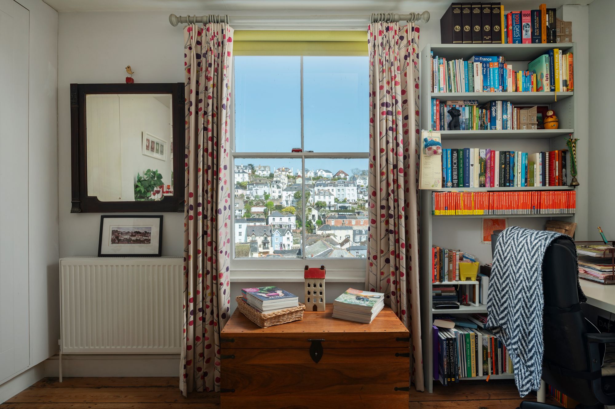 The Entrance Hall sets the tone with its graceful staircase, drawing the eye upward to the characterful stained glass window, before guiding you through to the Living Room. This elegant space enjoys a classic bay window that rises above the town, allowing the soft coastal light to settle across the room during the day. A feature Fireplace brings warmth and presence, while to the front, a once modest Snug has been transformed into a charming adjoining Library area where the owners bookcases and a piano create a cocoon for reading or quiet reflection. A Shower Room and useful storage complete this level.