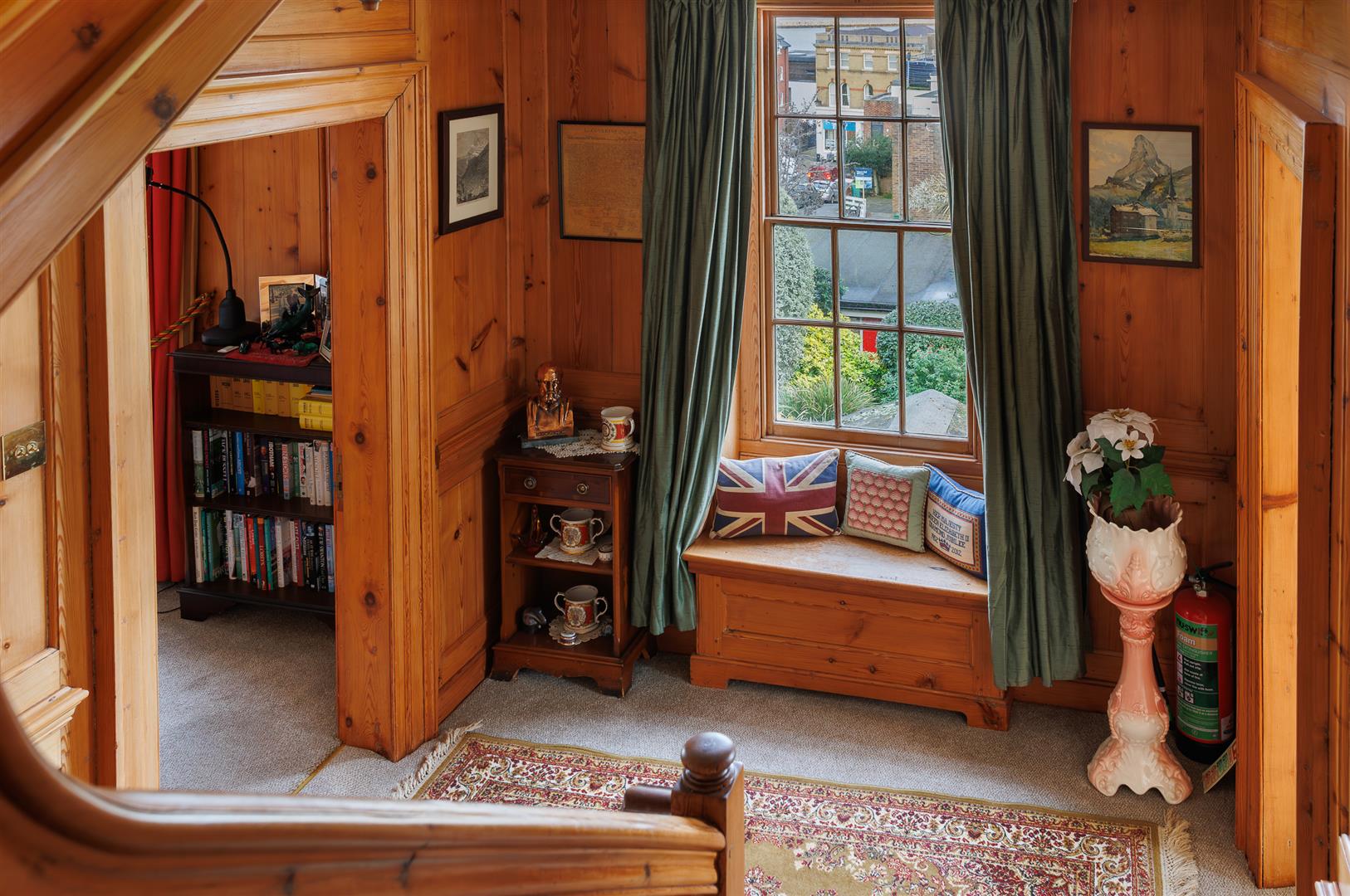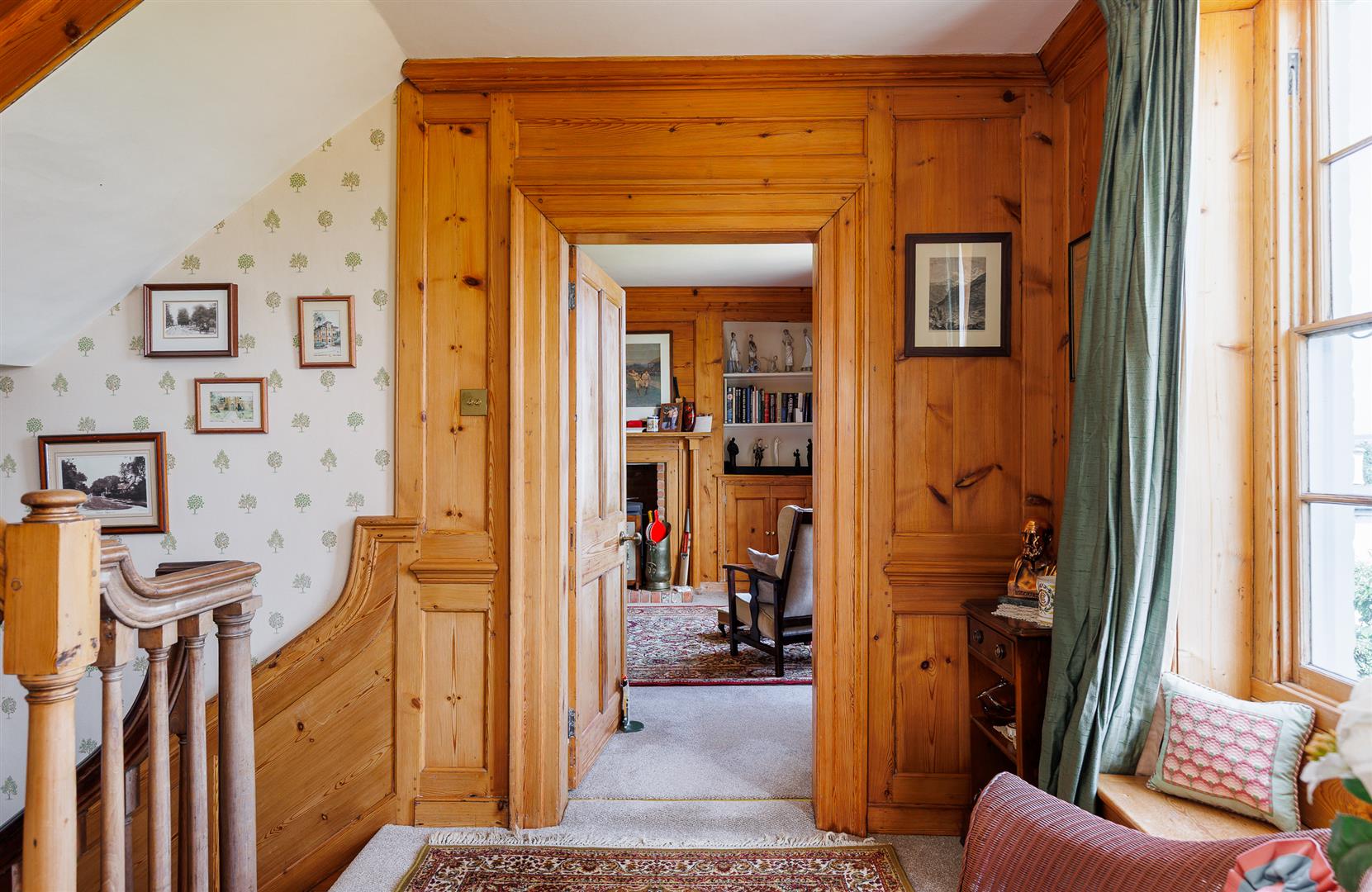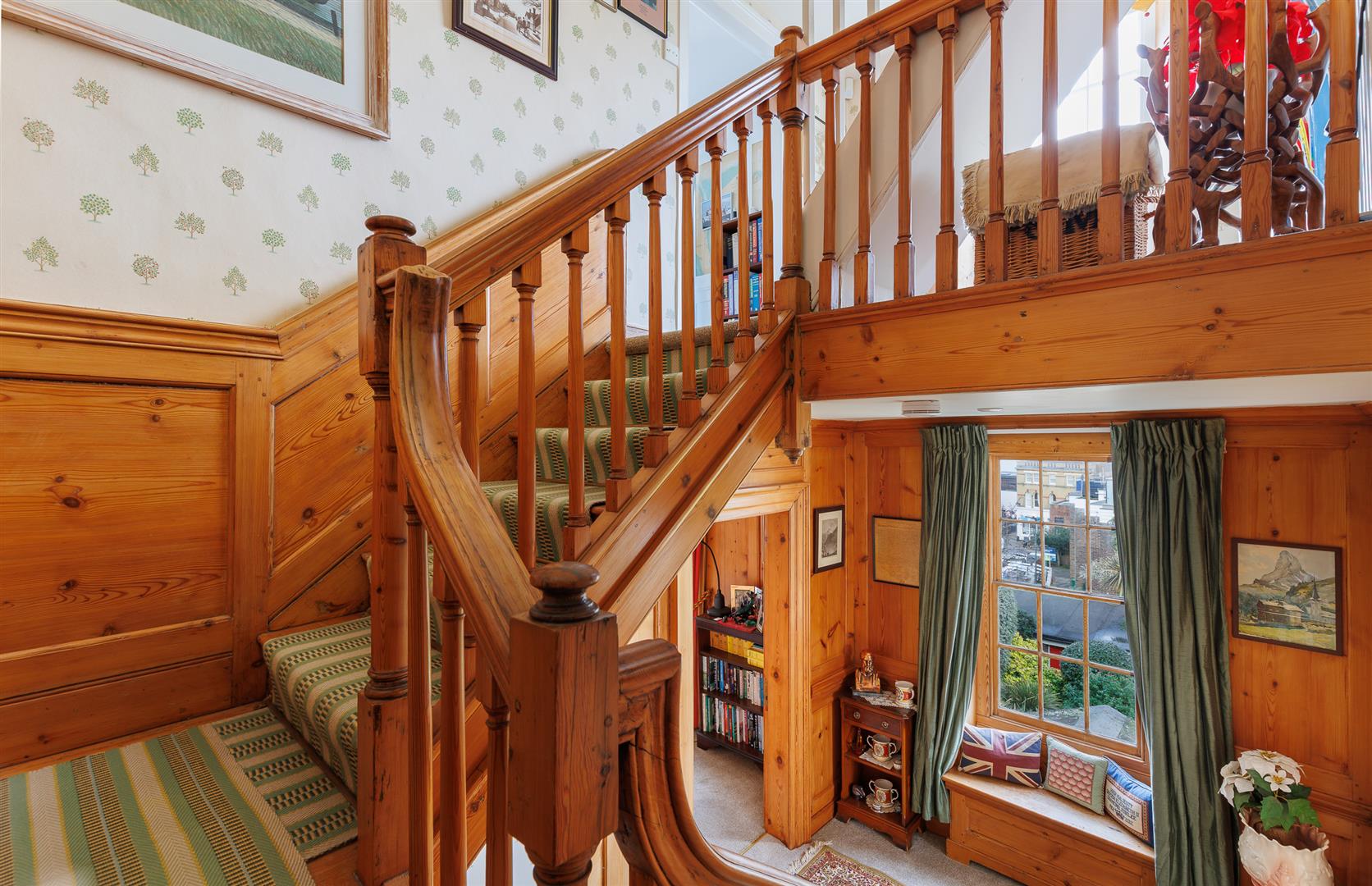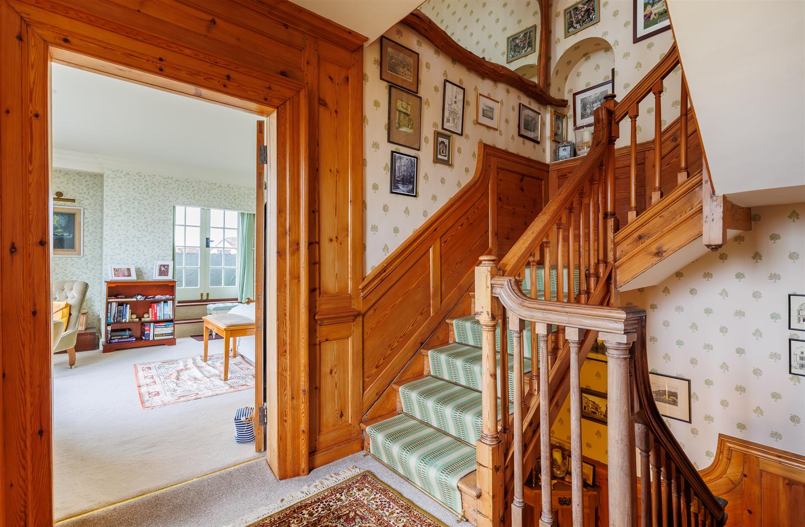 The imposing entrance door, with its magnificent door lock, opens to an impressive staircase with a beautifully carved mahogany banister and panelled walls. This curves up towards the upper floors and has storage cupboards beneath and within this entrance hallway is the original butler’s bell. From here, to your right, is the dual aspect cosy drawing room with a fireplace that has exposed brickwork within.