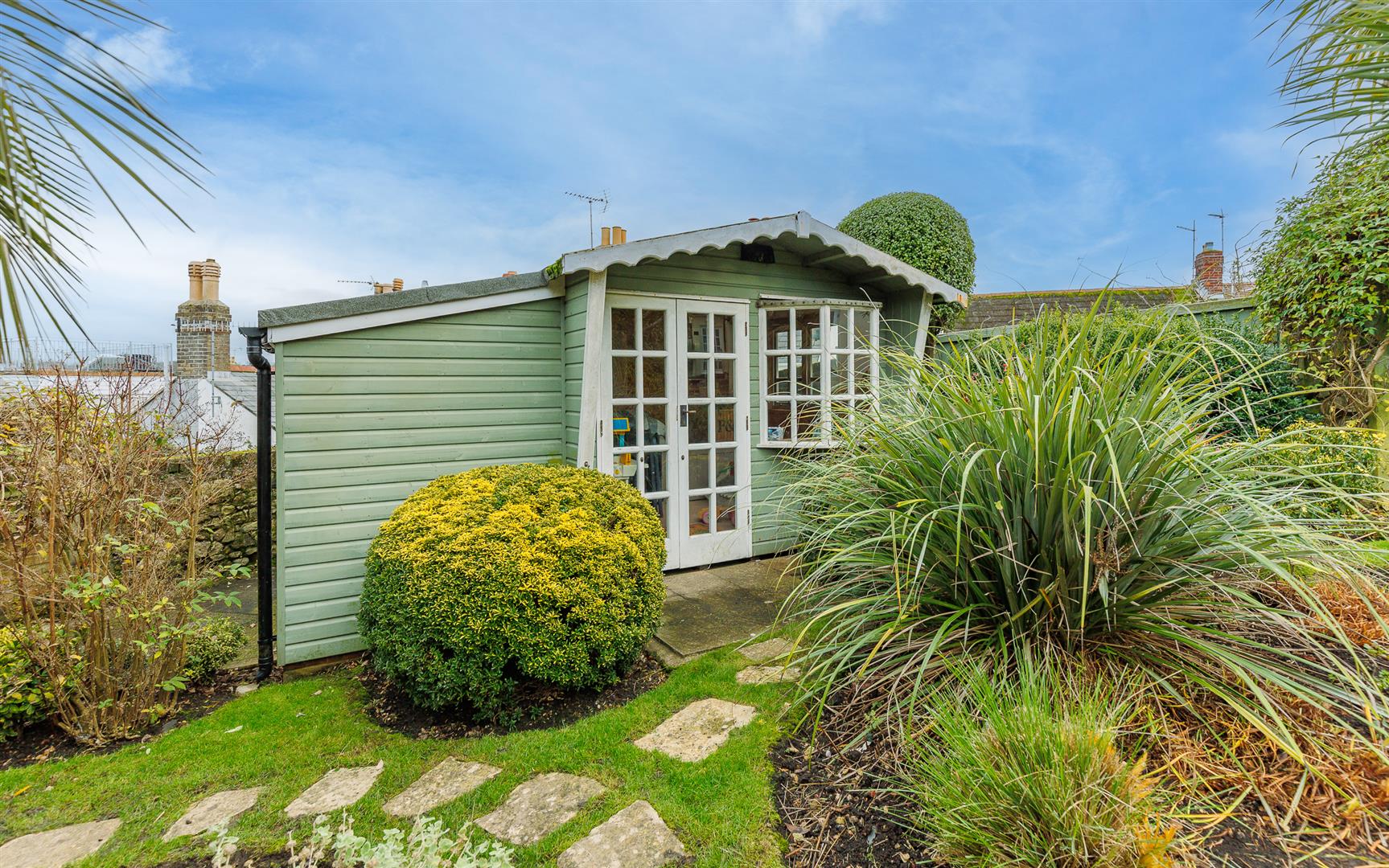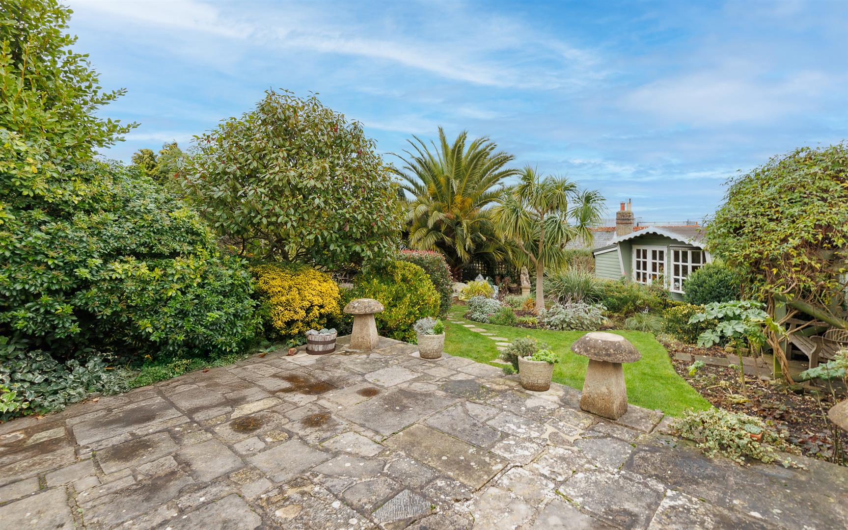 Set within this peaceful garden the charming summerhouse has a wooden-panelled interior. With power and lighting already in place, it offers an ideal space for quiet relaxation or, alternatively, could serve as an excellent garden office.