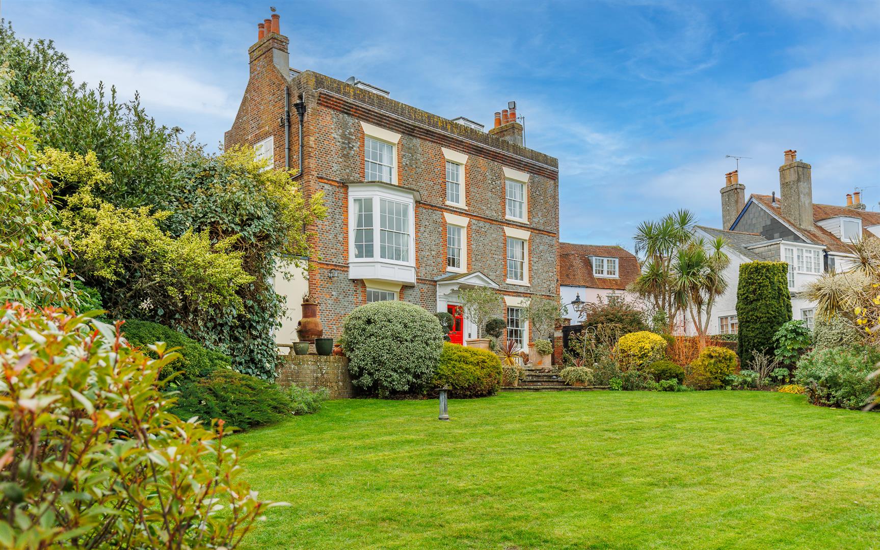 A distinctive wooden gate opens into the gardens, approached via a short flight of steps and framed by attractive curved red brick walls, with a lantern above, believed to have originally been gas lit. Beyond lies a wide paved terrace extending across the full width of the house, leading to Mulberry Cottage and abutting the expansive lawn and gardens, from where there are truly wonderful views across the Solent.