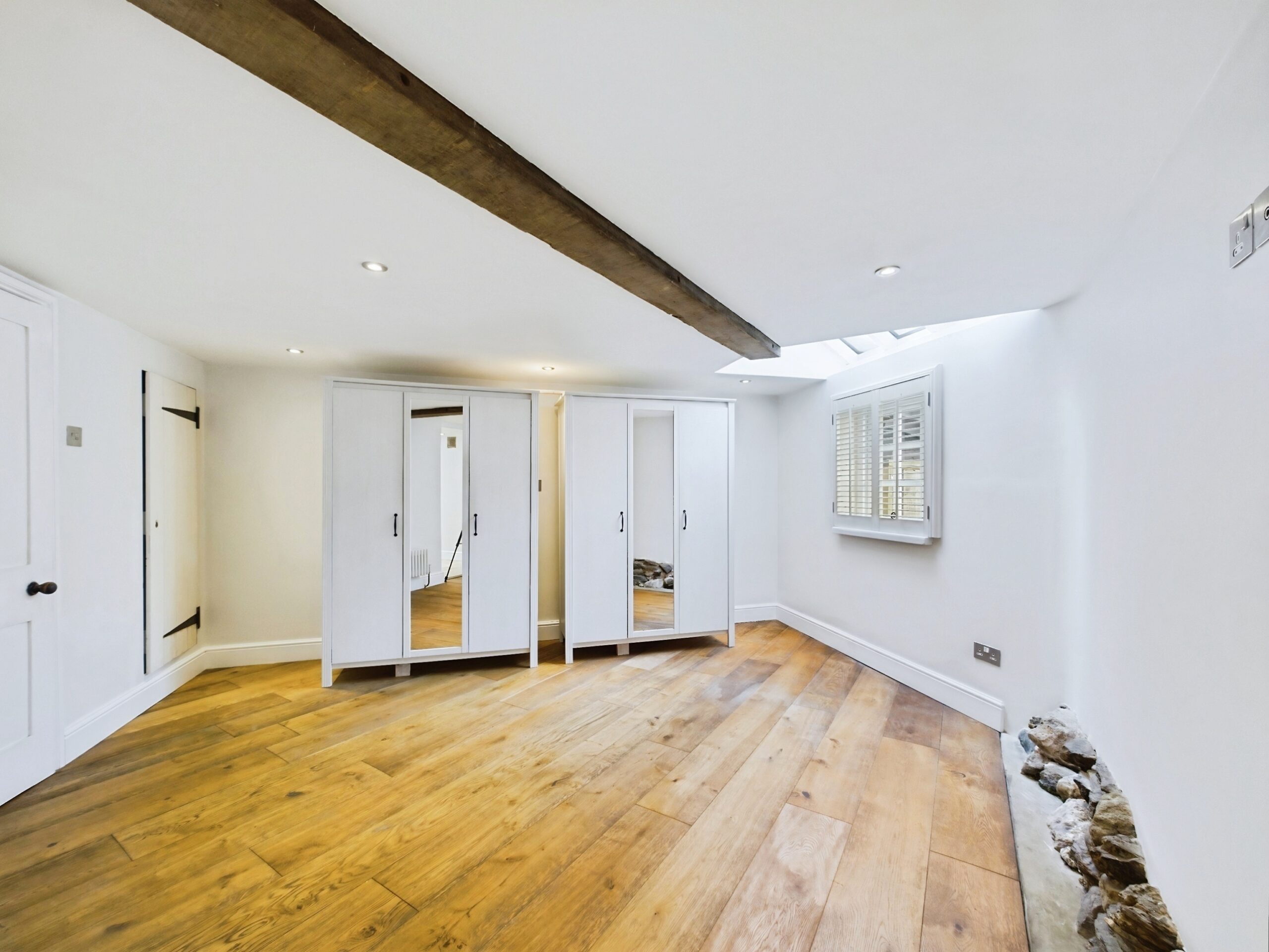 Bedroom One: Georgian style, double glazed wooden window with fitted plantation shutters and a vaulted skylight window above. Area of exposed original stonework. Oak flooring. Radiator and ample power points. Built-in storage cupboard. Smooth plastered ceiling with recessed spotlighting and an exposed beam. Door to: