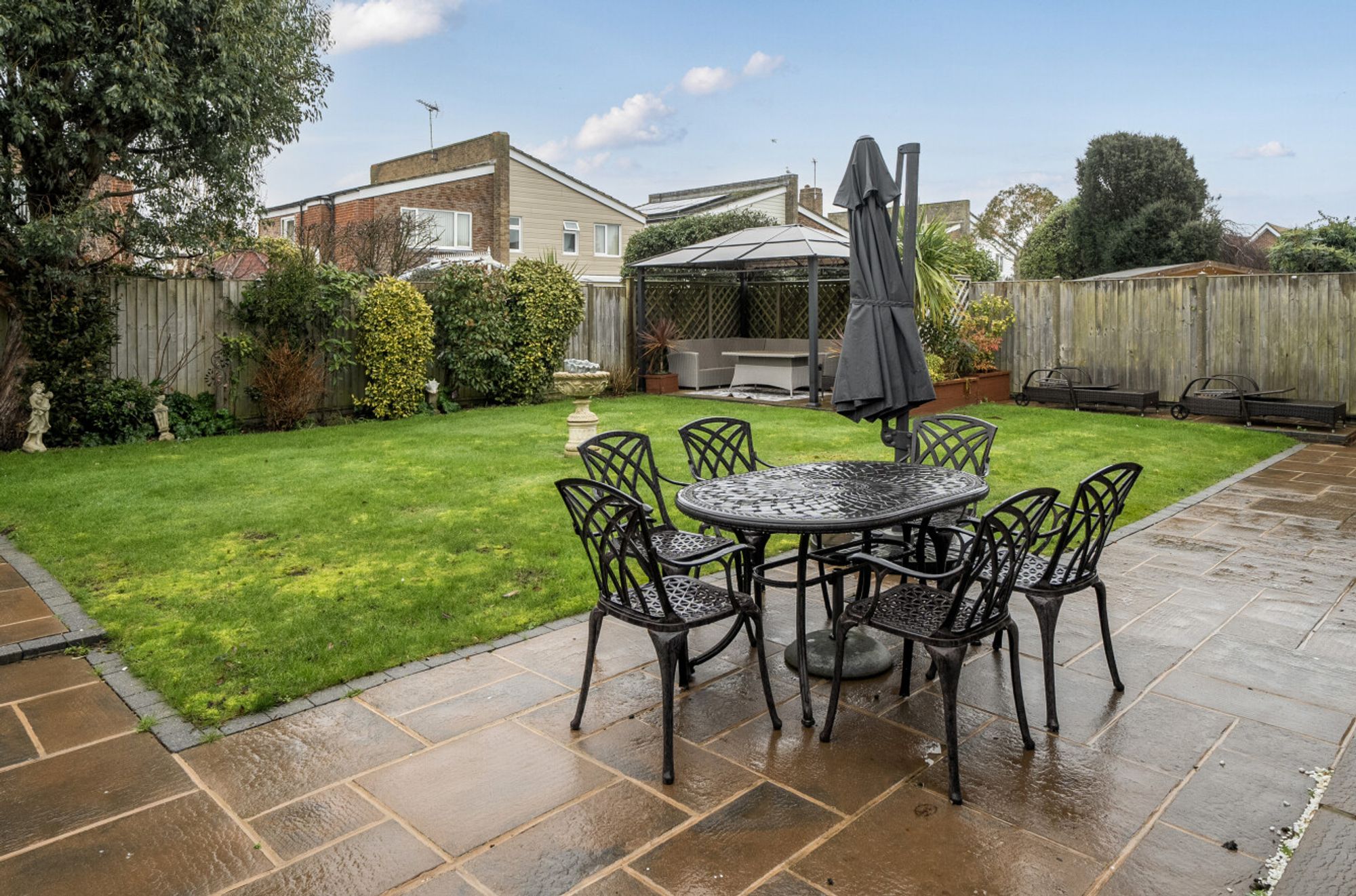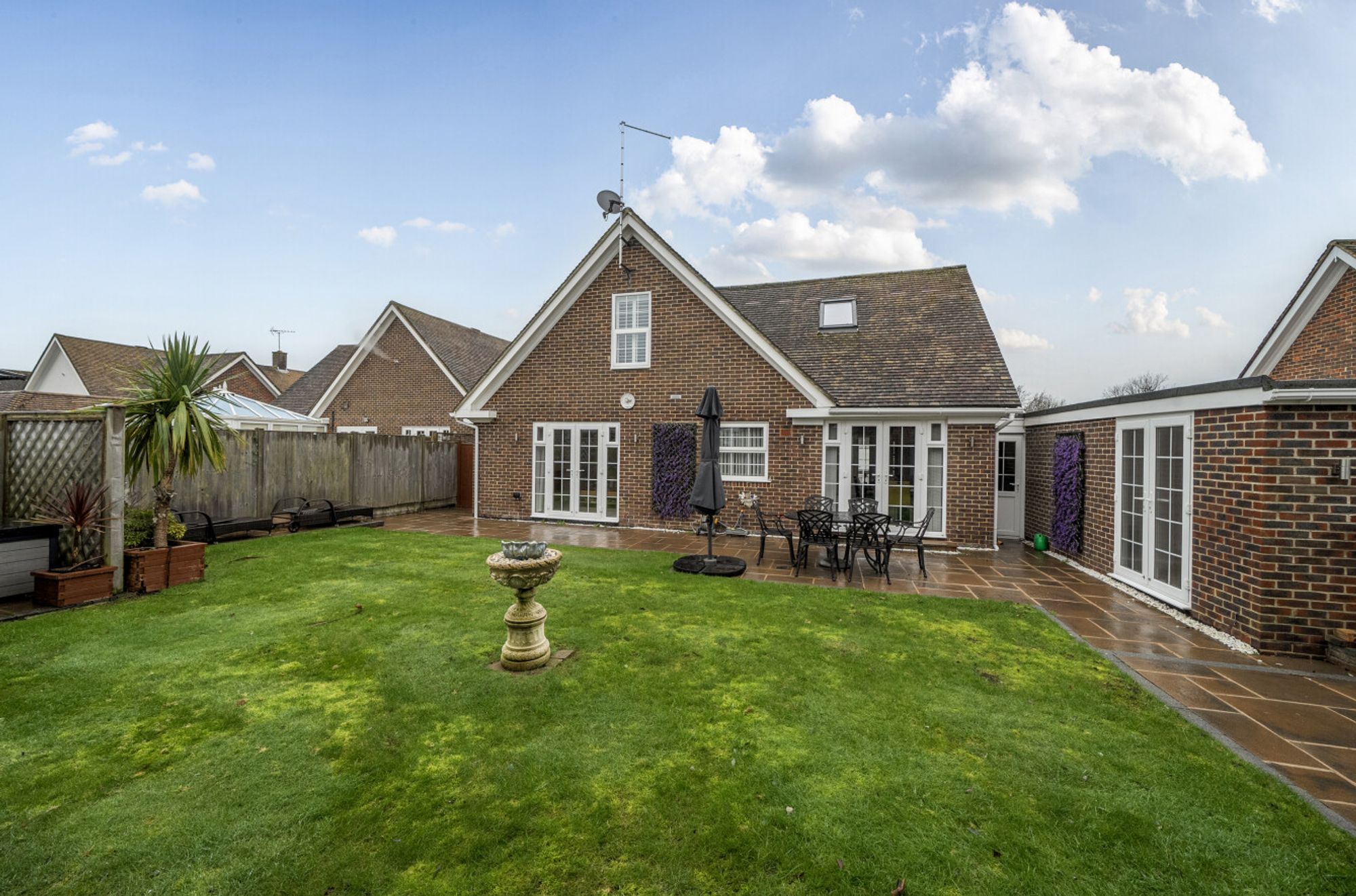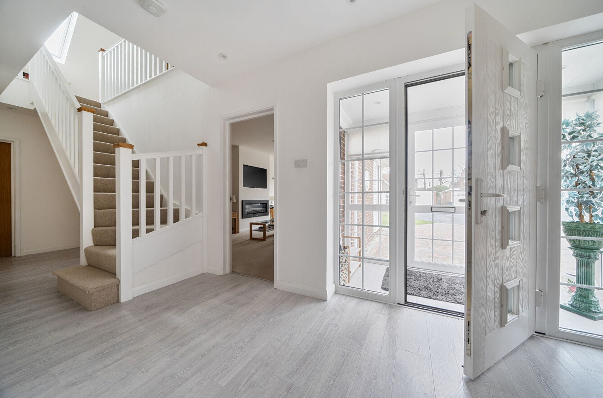 Outside, the rear garden is mainly laid to lawn, manicured borders with established trees and shrubs, two patio areas and a garden room. The block paved driveway provides parking for several vehicles and leads to the double garage with electric up and over door.