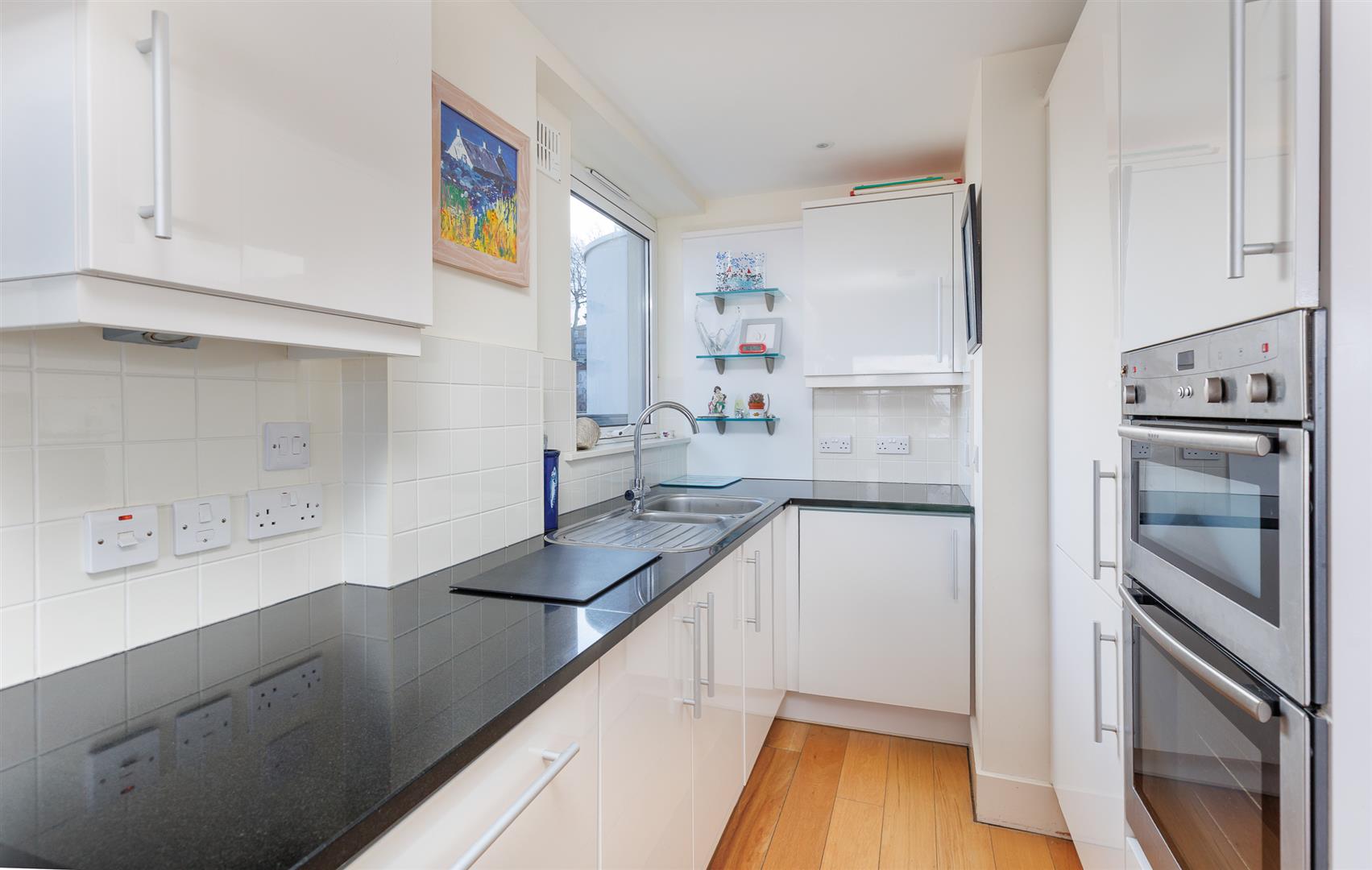 Within the very well appointed kitchen, with its white gloss wall and base units and contrasting dark granite worksurface, are integrated appliances including a NEFF four zone hob, oven, grill, fridge freezer, washing machine and dishwasher.