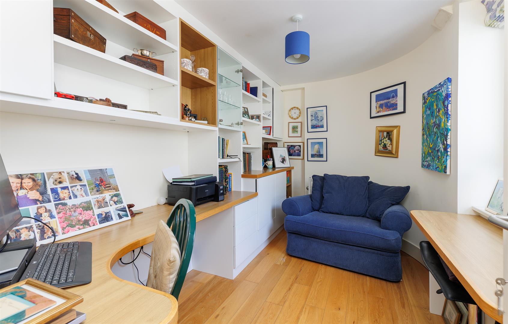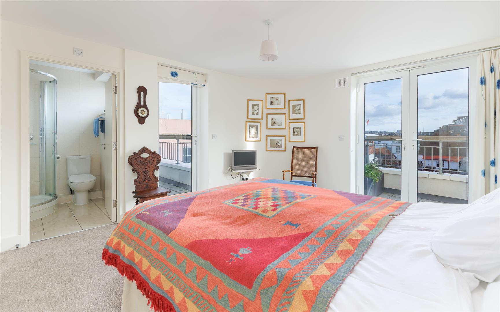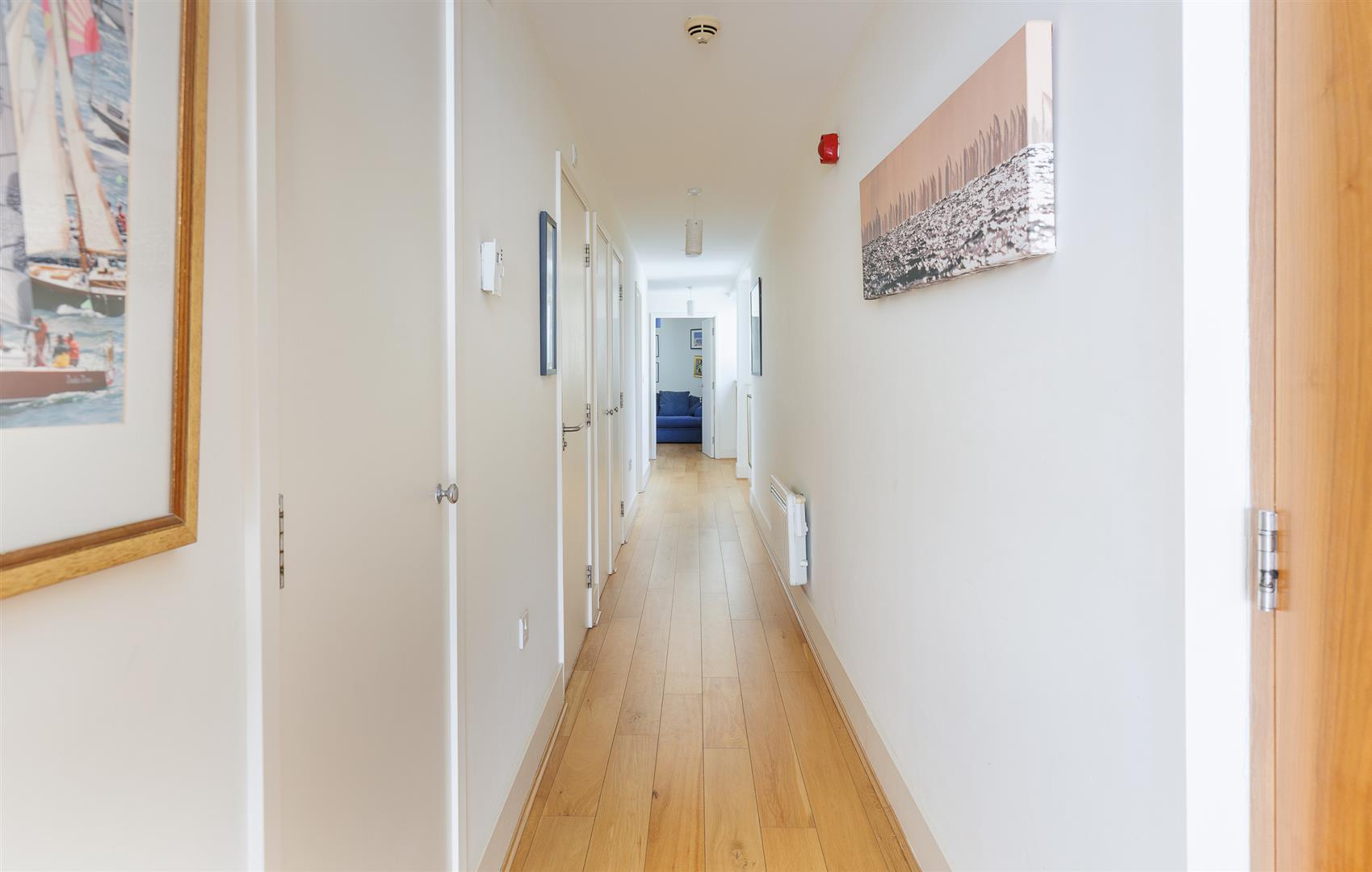 The entrance door opens to a long hallway with several convenient storage cupboards and gives access to a modern bathroom with bath and overhead shower, wc and basin. The two double bedrooms are generously sized, with large built in wardrobes and both have fully tiled ensuite shower rooms. The principal bedroom has a single door to the front balcony and patio doors to the side balcony, as does the second bedroom. The third bedroom is a versatile space and is currently set out as an office with bespoke built in desk and shelving.