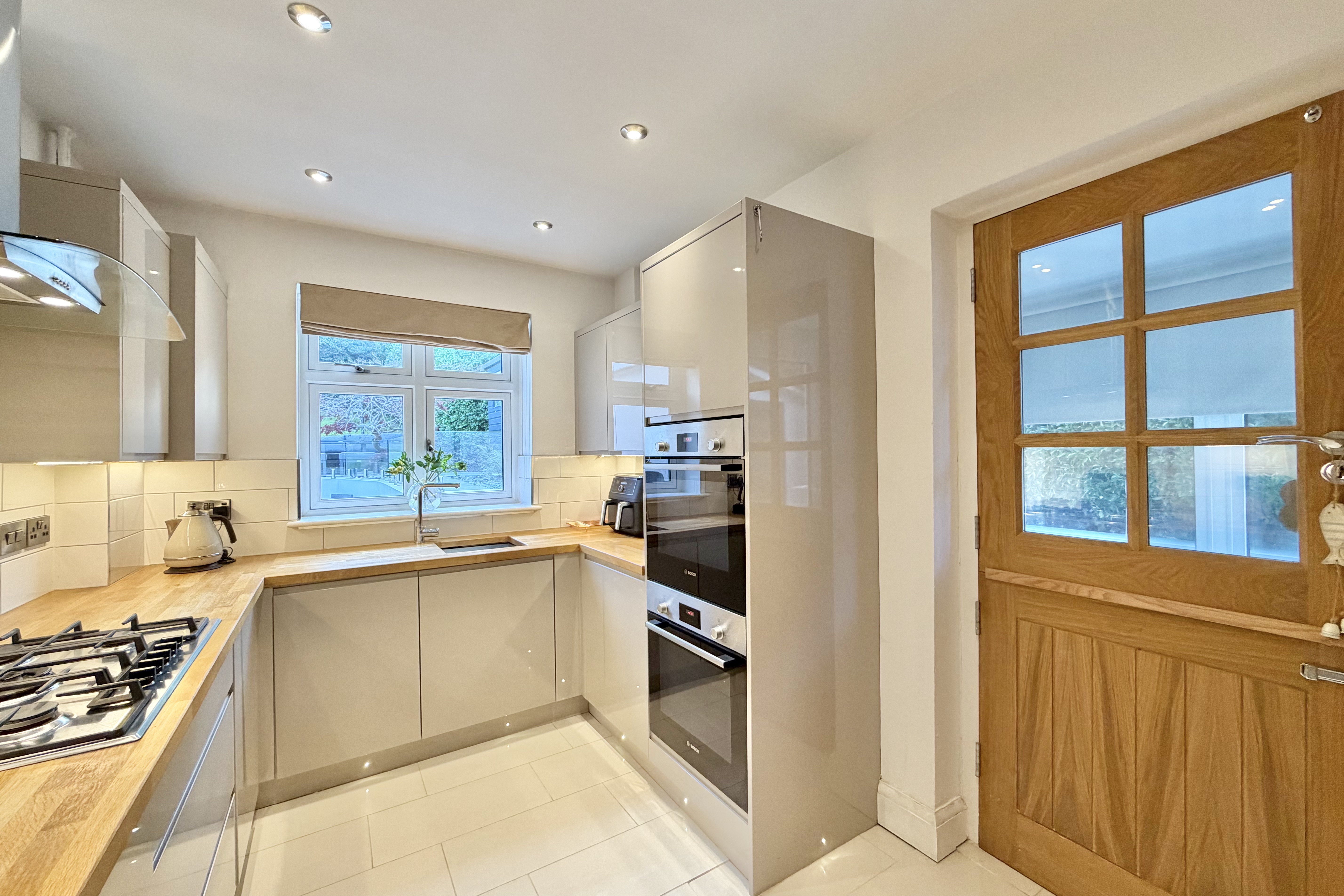 with sliding solid oak door, modern tiled flooring, electric underfloor heating, a selection of high and low level modern gloss cabinets with lighting under high units, plinth lighting, solid wood worktops, integrated fridge freezer, five ring gas hob with extractor fan over, localised tiling, integrated dishwasher, inset one bowl stainless steel sink with mixer tap over, uPVC double glazed window overlooking rear garden, integrated double ovens, opening into