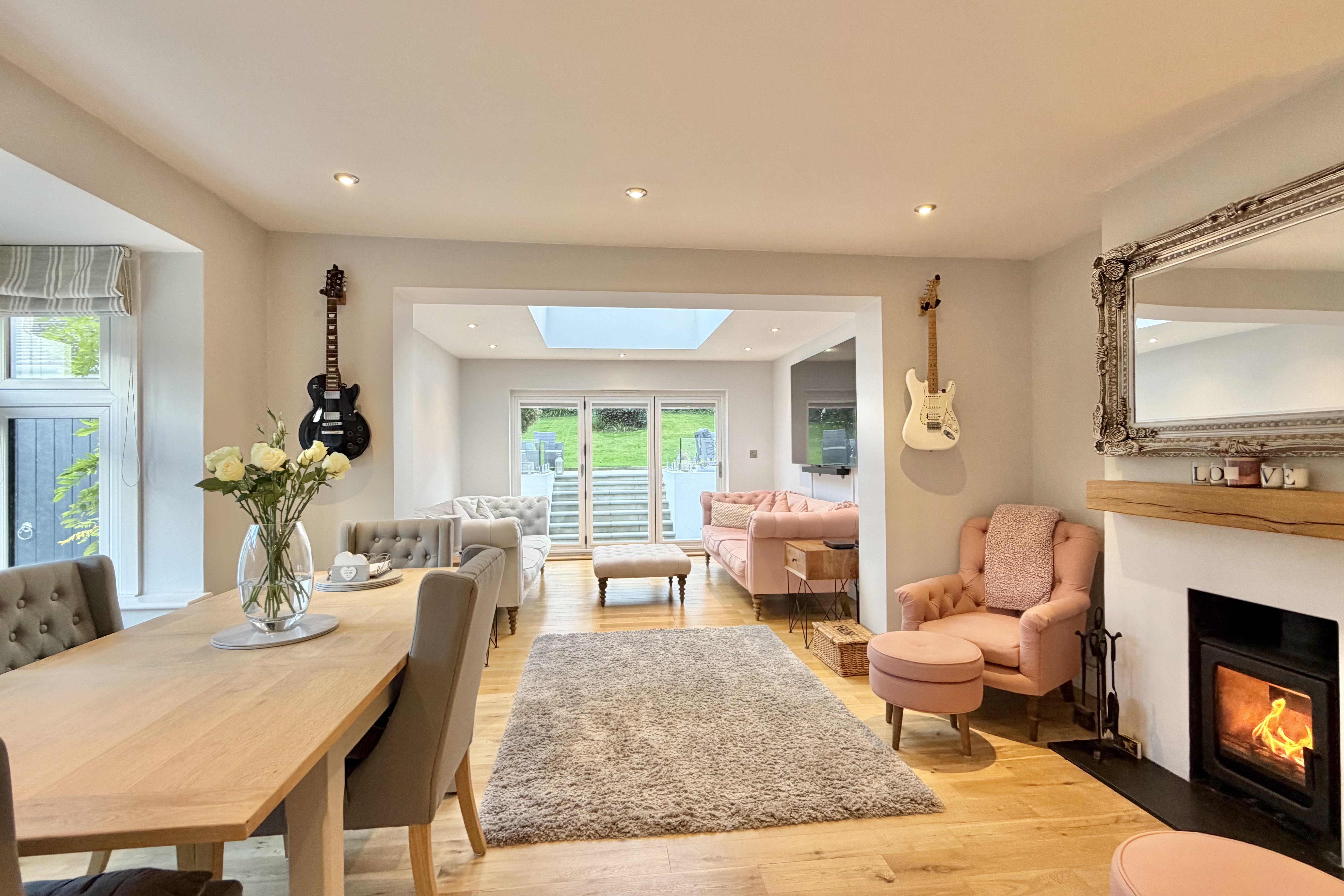 with a mixture of solid oak flooring and engineered oak flooring, uPVC double glazed bay window to front, log burner with slate hearth and oak mantle over, radiator, large skylight with build in electric black out blind, double glazed bifold doors leading to rear garden with bespoke fitted blinds, electric underfloor heating to the garden room area
