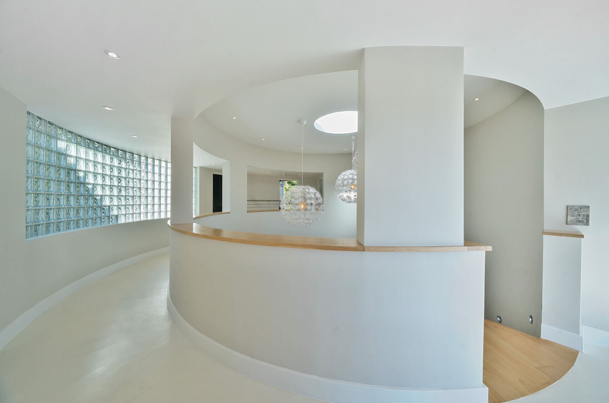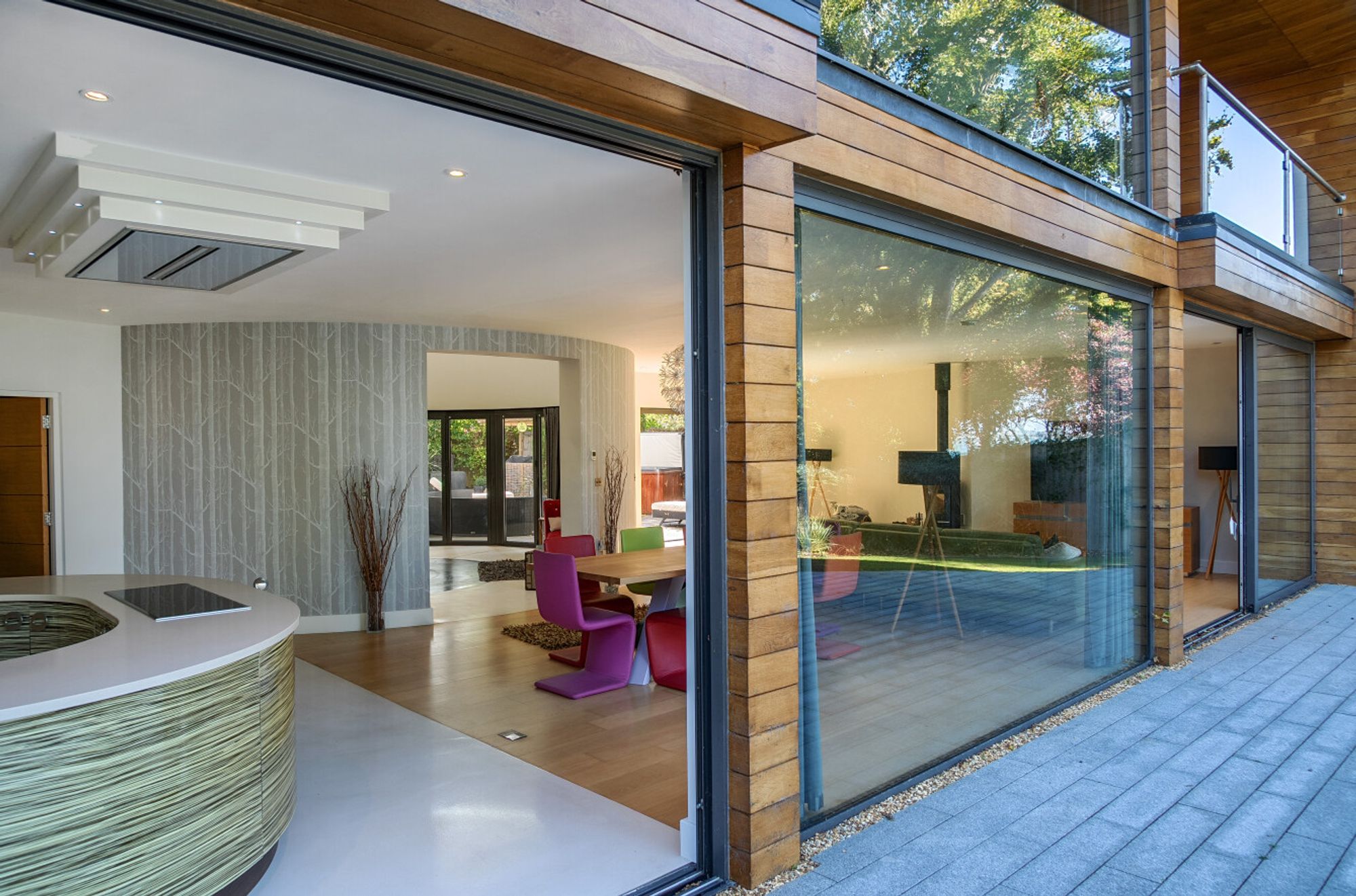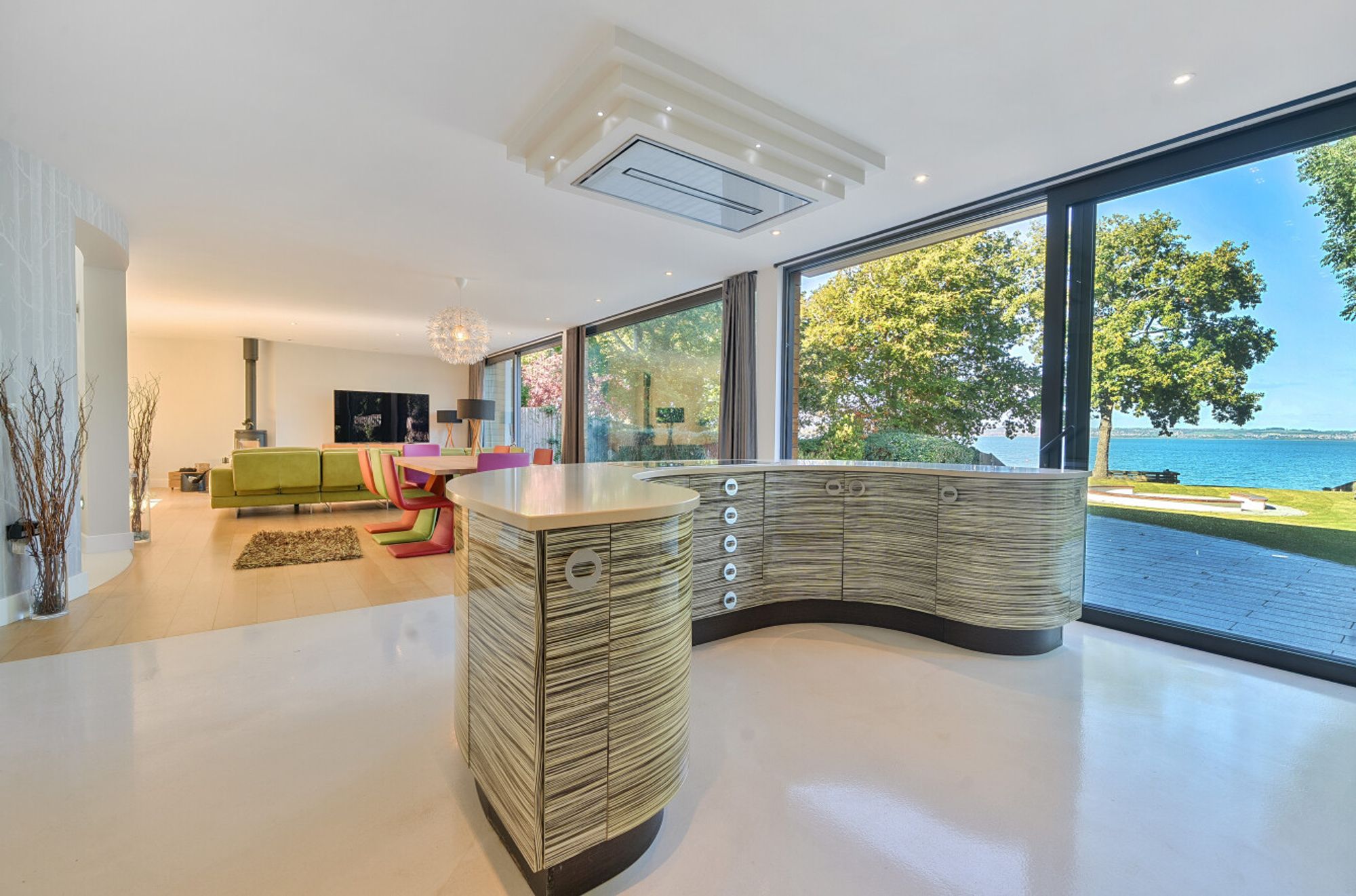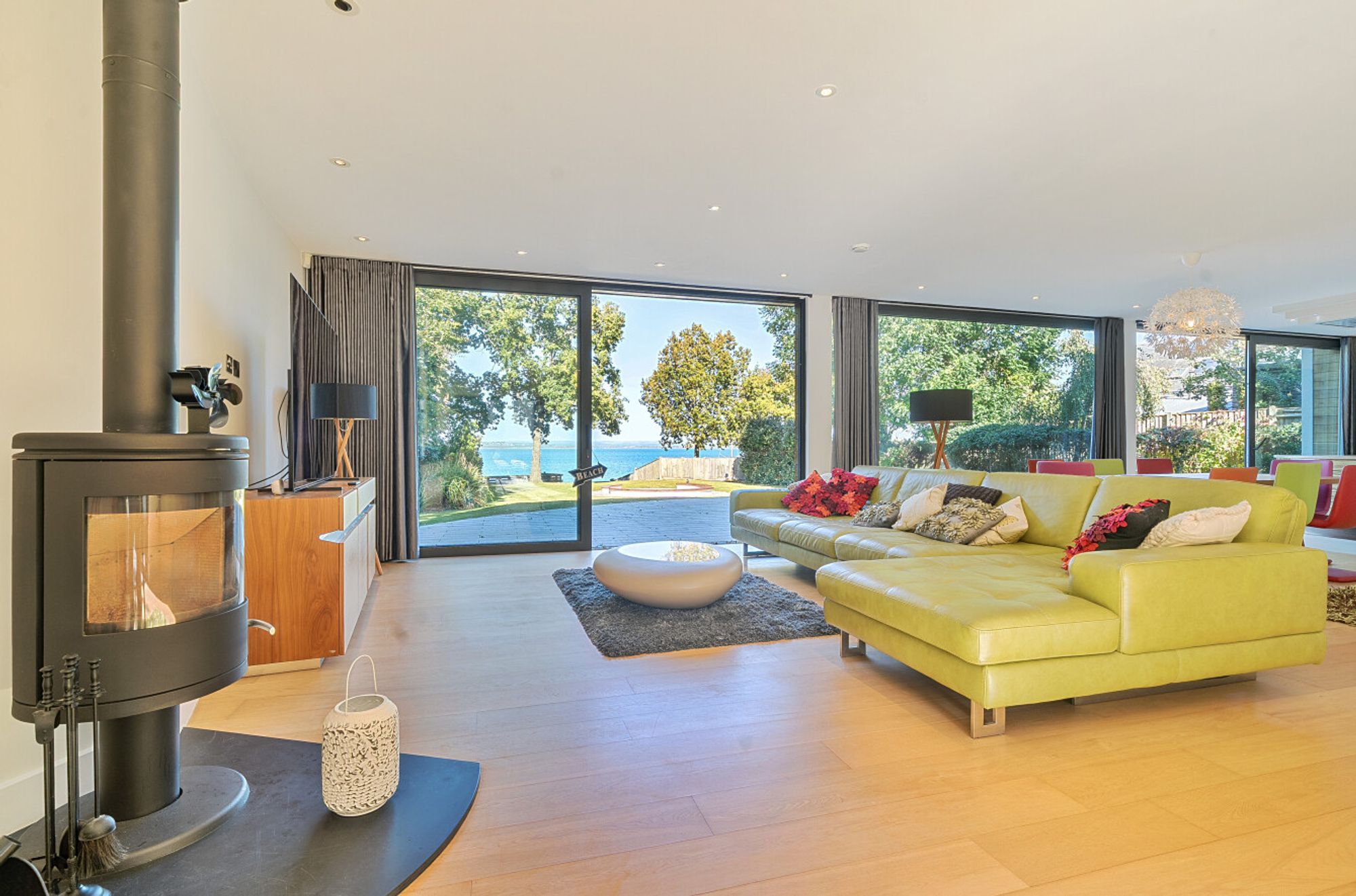 Extending to over 4000sqft the accommodation is centred around a dramatic double-height atrium with sweeping circular staircase — an architectural focal point that sets the tone for the entire house. At its heart, a spectacular open-plan kitchen, dining, and living area opens onto sun terraces and gardens, with floor-to-ceiling glazing ensuring the ever-changing seascape is a constant presence. The addition of a log burner brings warmth and character to the modern design.