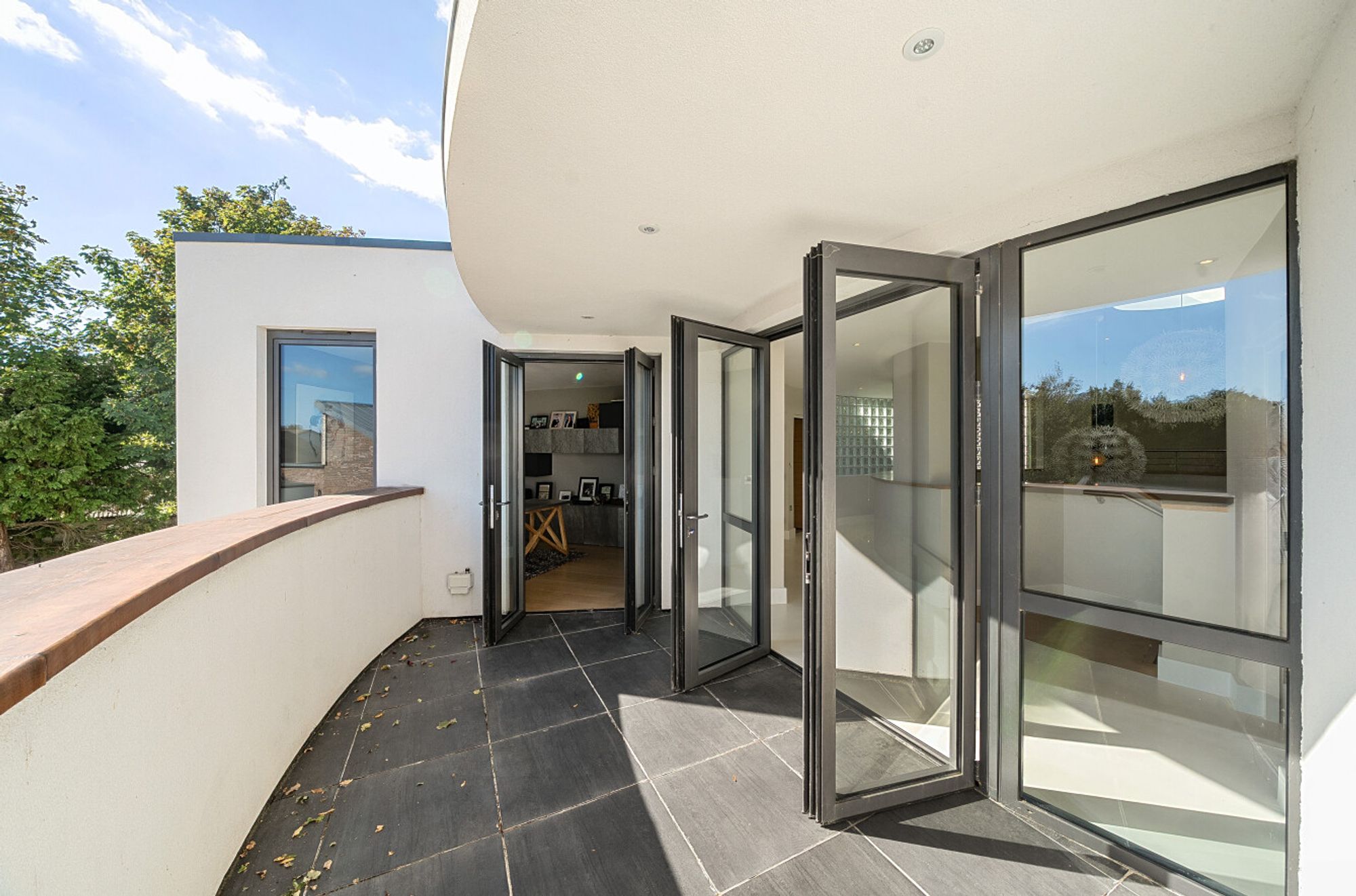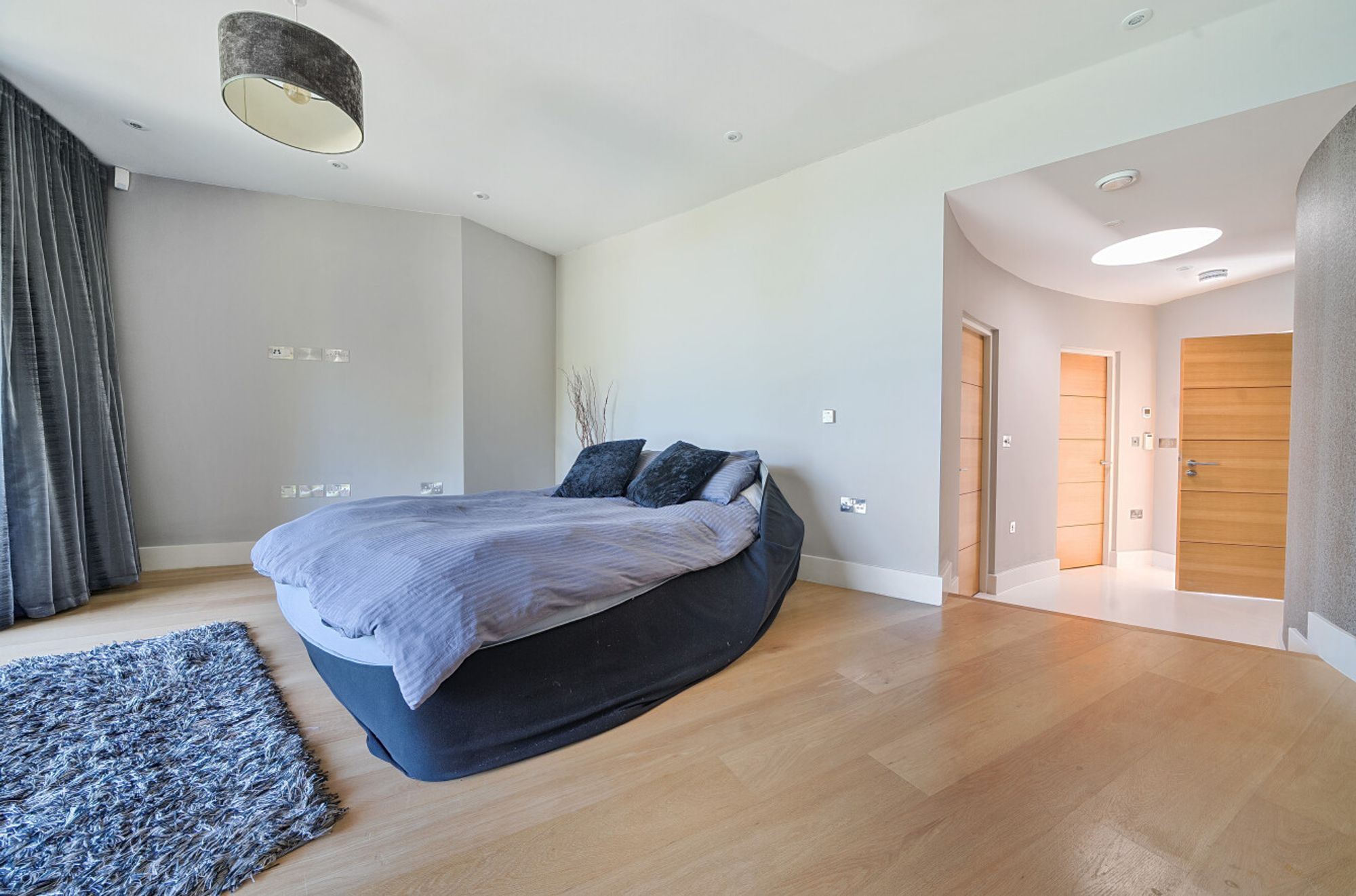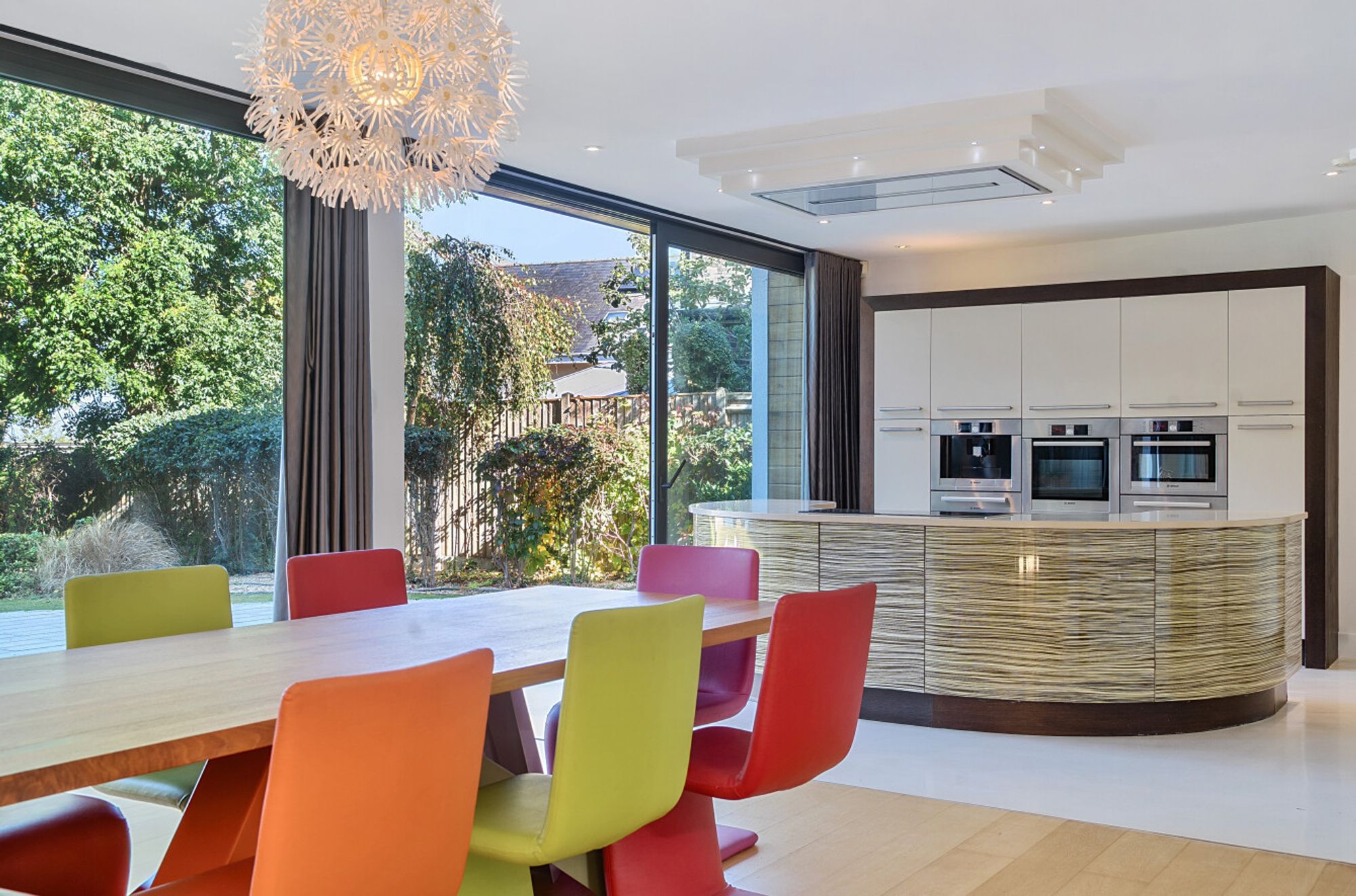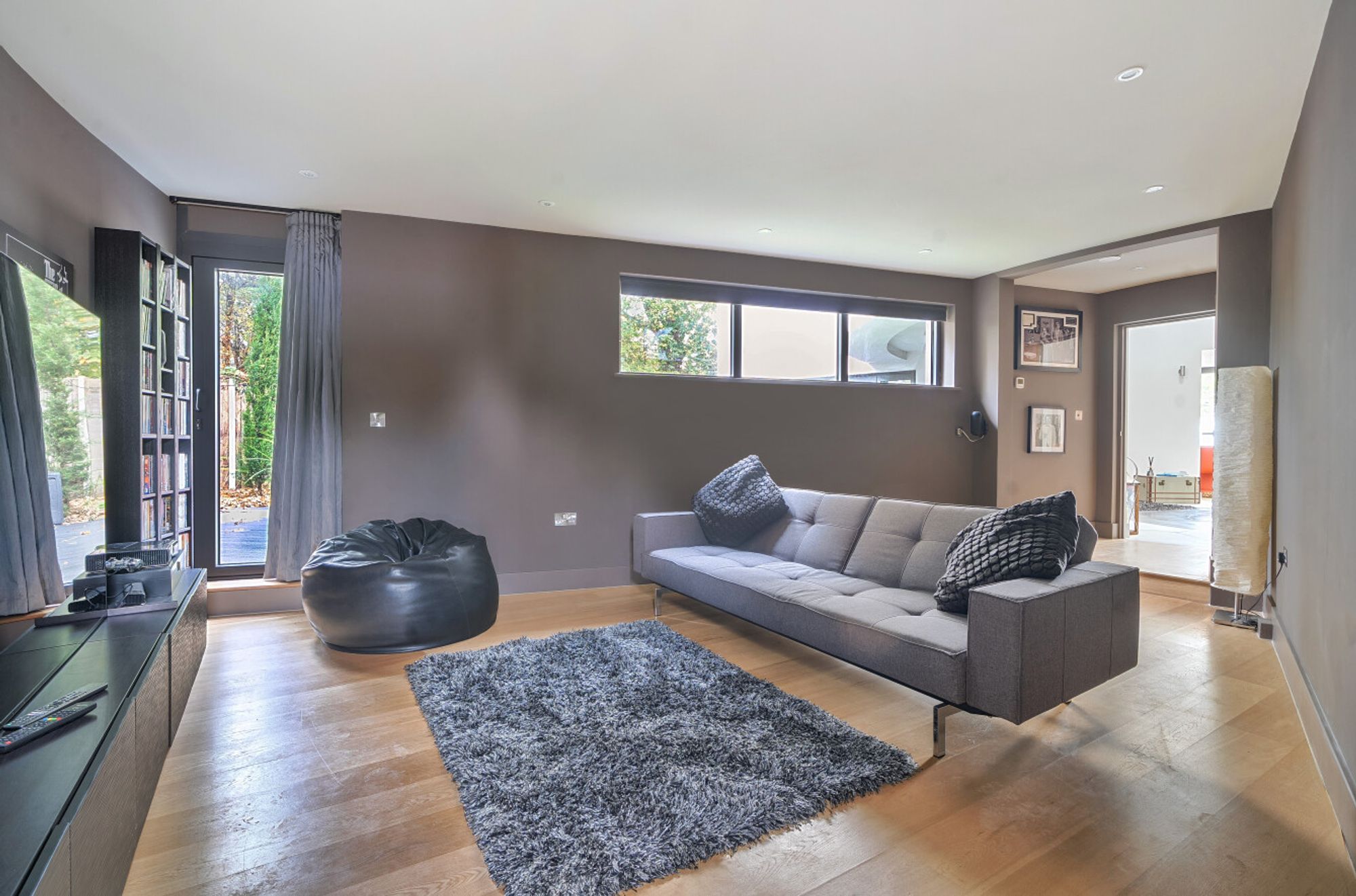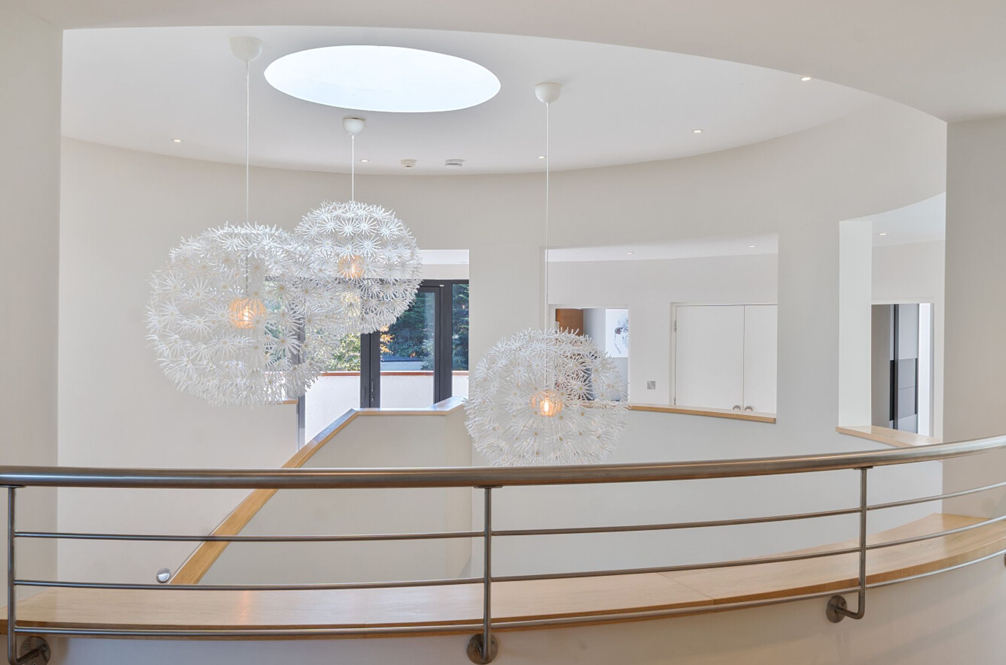 Extending to over 4000sqft the accommodation is centred around a dramatic double-height atrium with sweeping circular staircase — an architectural focal point that sets the tone for the entire house. At its heart, a spectacular open-plan kitchen, dining, and living area opens onto sun terraces and gardens, with floor-to-ceiling glazing ensuring the ever-changing seascape is a constant presence. The addition of a log burner brings warmth and character to the modern design.