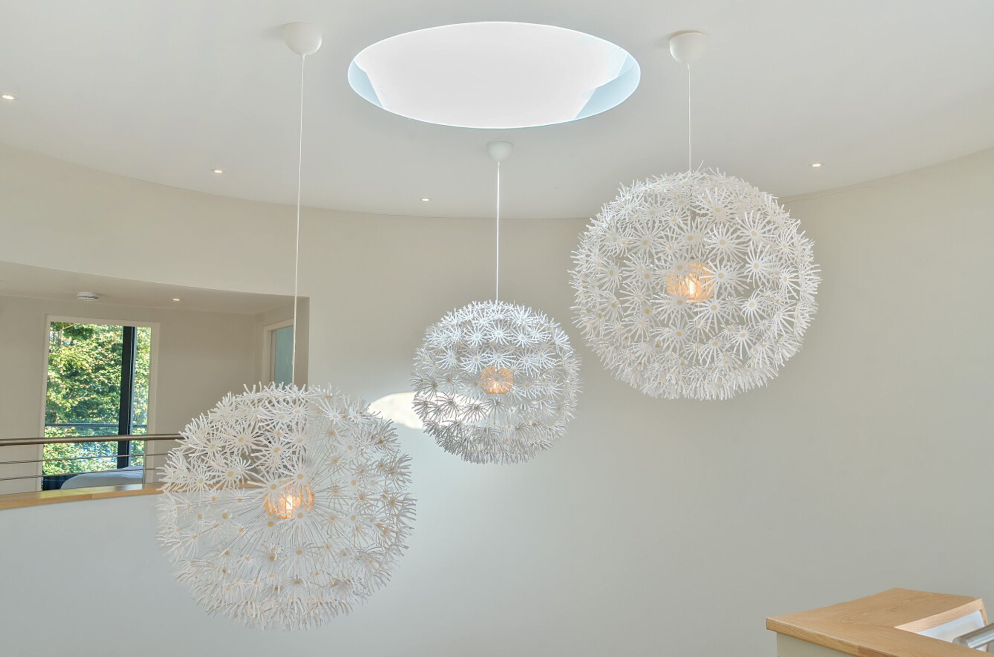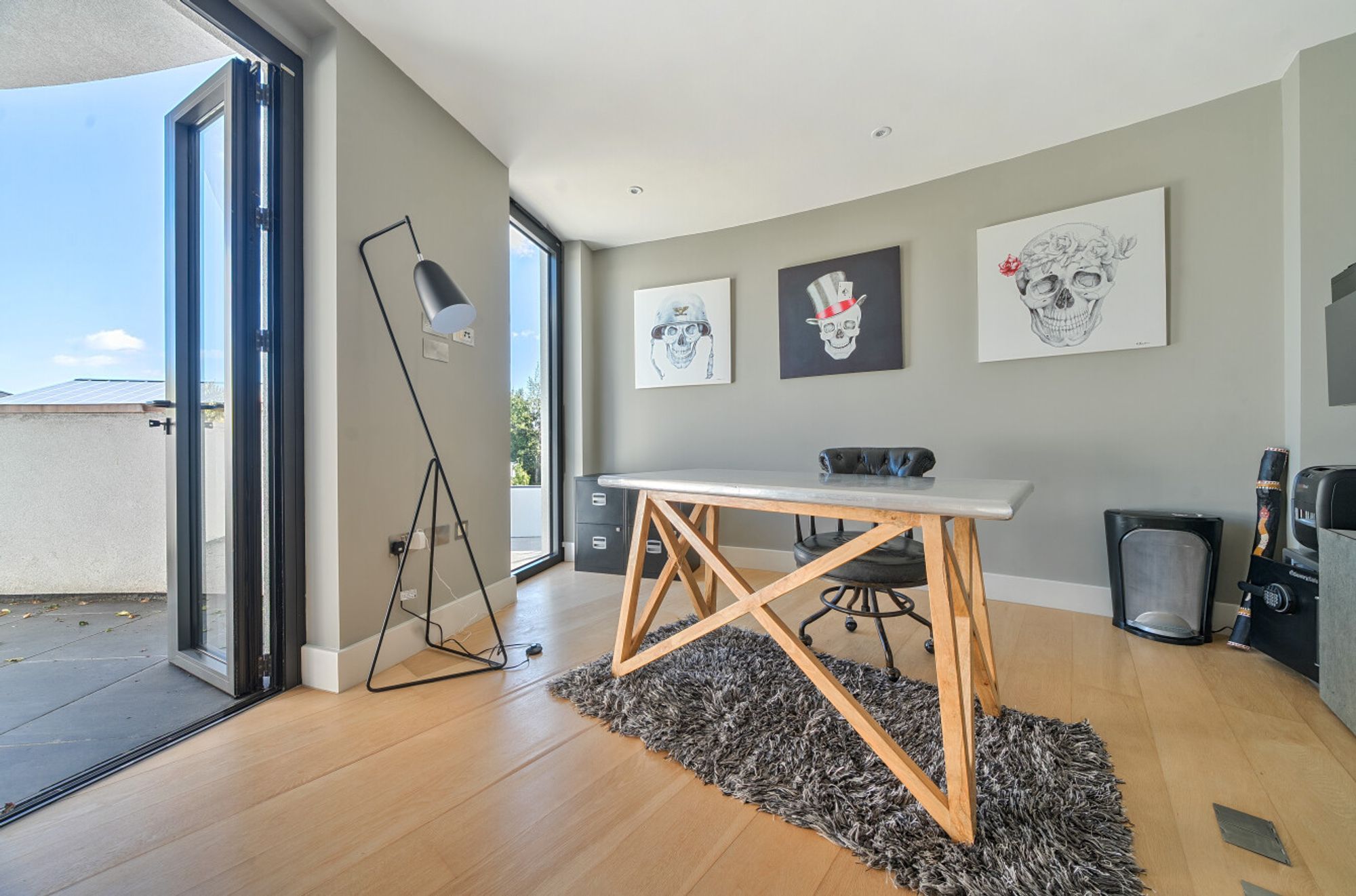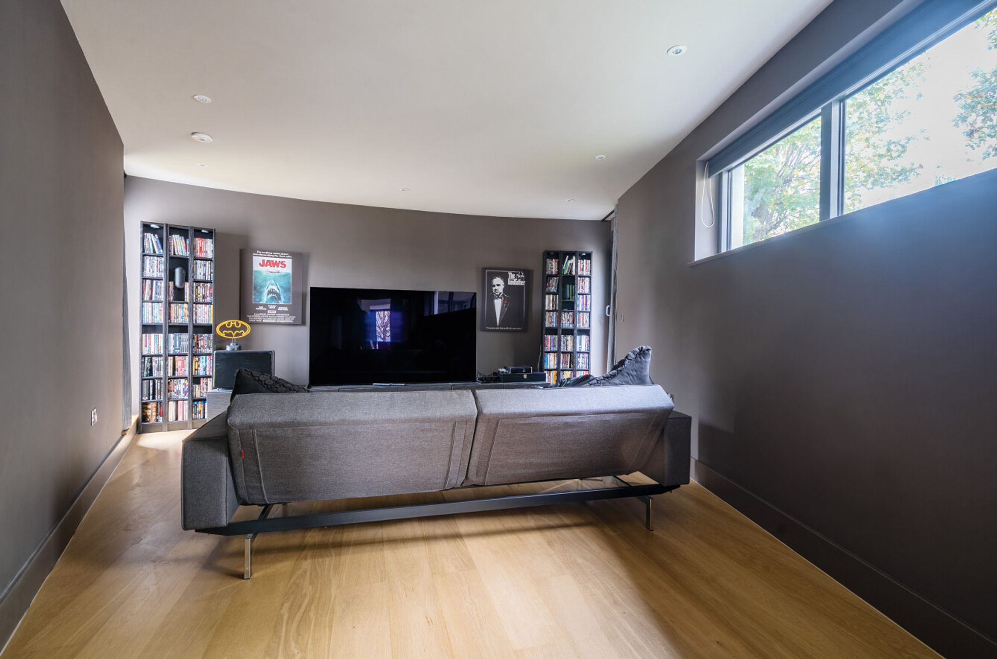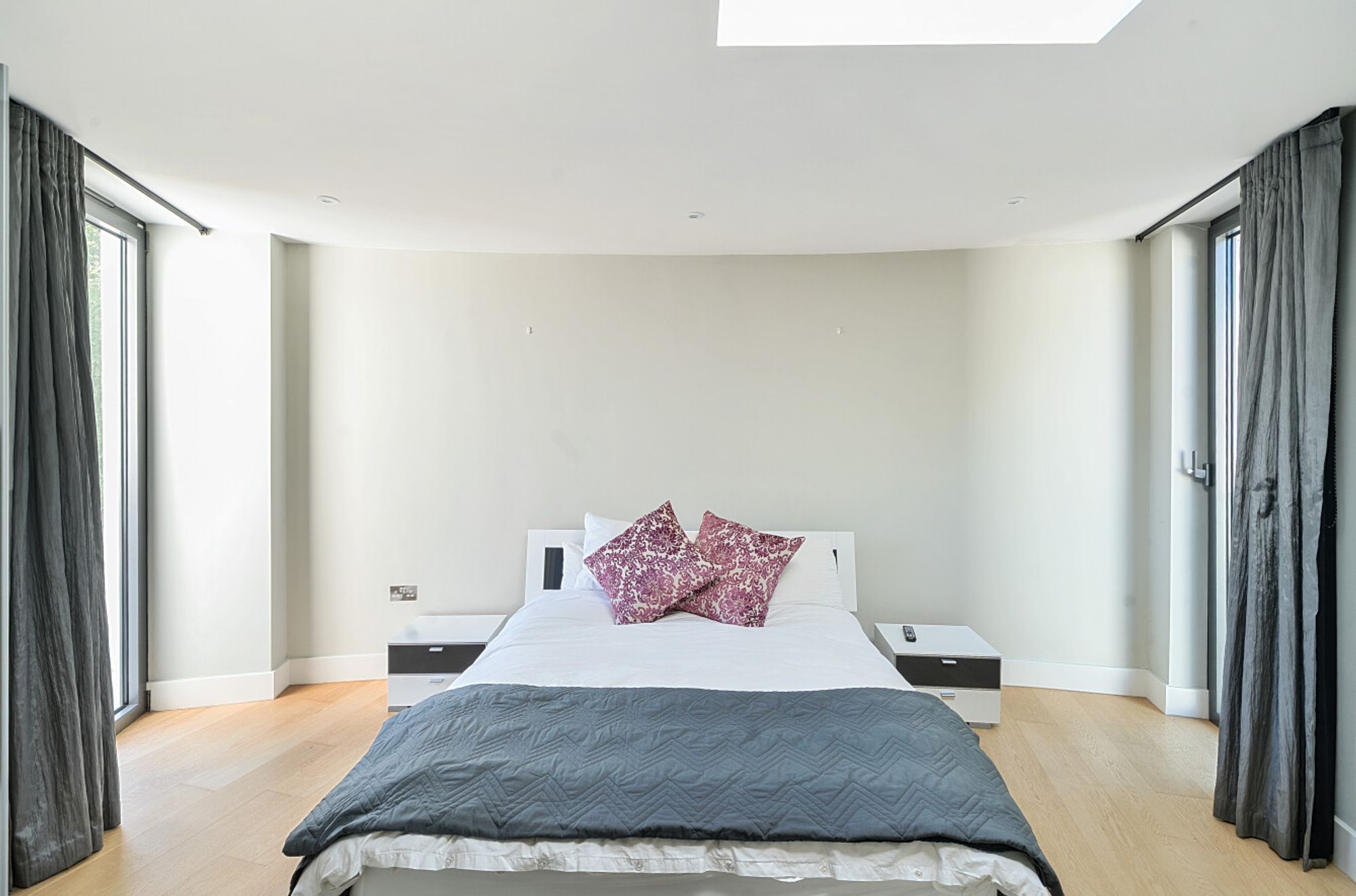Extending to over 4000sqft the accommodation is centred around a dramatic double-height atrium with sweeping circular staircase — an architectural focal point that sets the tone for the entire house. At its heart, a spectacular open-plan kitchen, dining, and living area opens onto sun terraces and gardens, with floor-to-ceiling glazing ensuring the ever-changing seascape is a constant presence. The addition of a log burner brings warmth and character to the modern design.