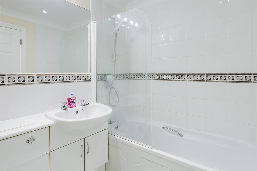 Tiled splash backs, three piece suite comprises bath with shower over, sink with vanity unit, and Wc. Tiled floor, radiator, shaver point and light, mirror, extractor fan.