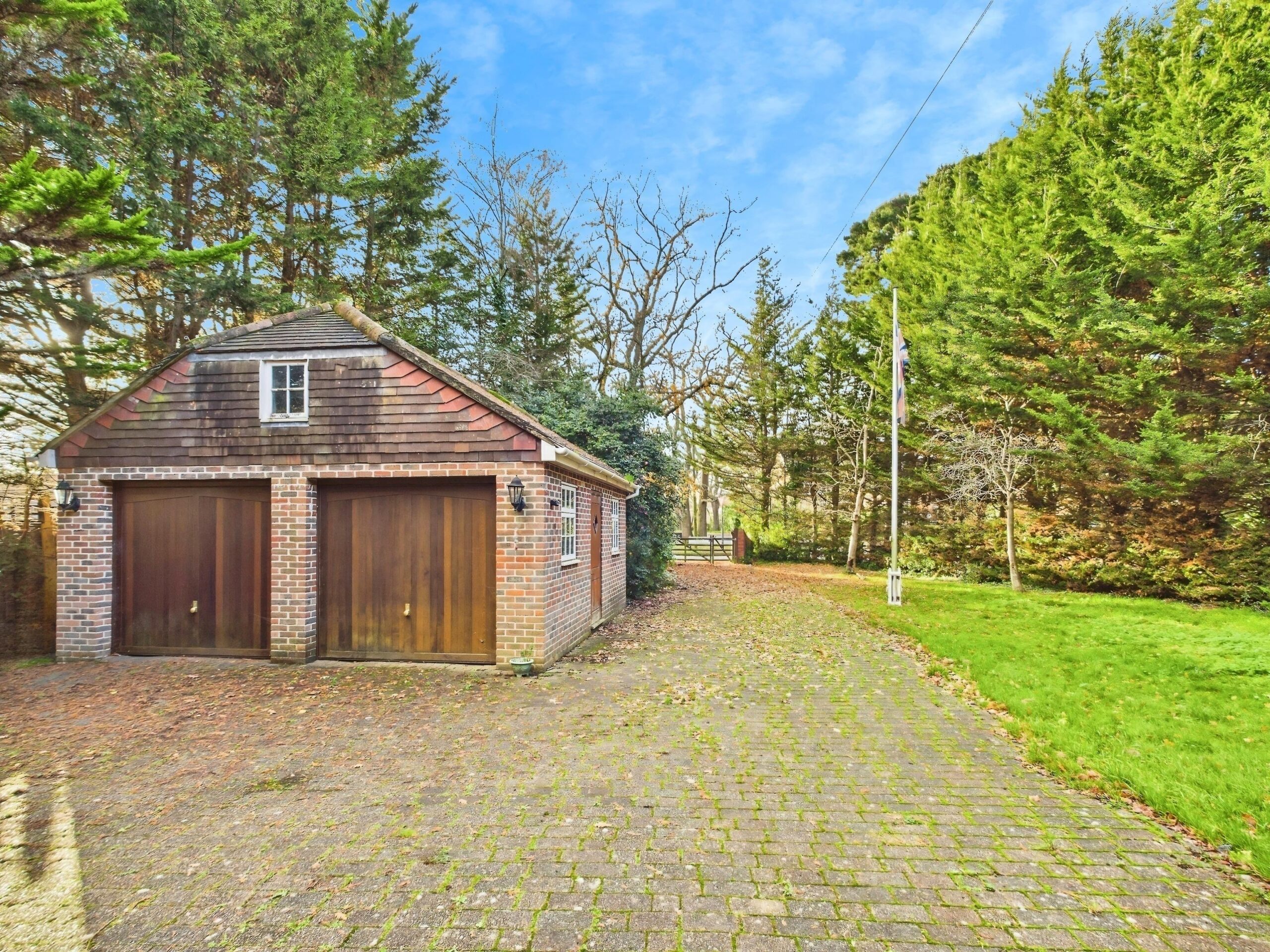 Outside - Wooden gates open to reveal a block paved driveway providing off road parking for numerous vehicles. There is a detached double garage with two up and over doors a pedestrian door, power, lighting and eaves storage. The front garden is laid to lawn with a number of mature trees.