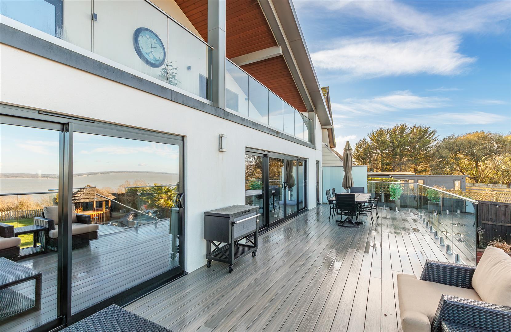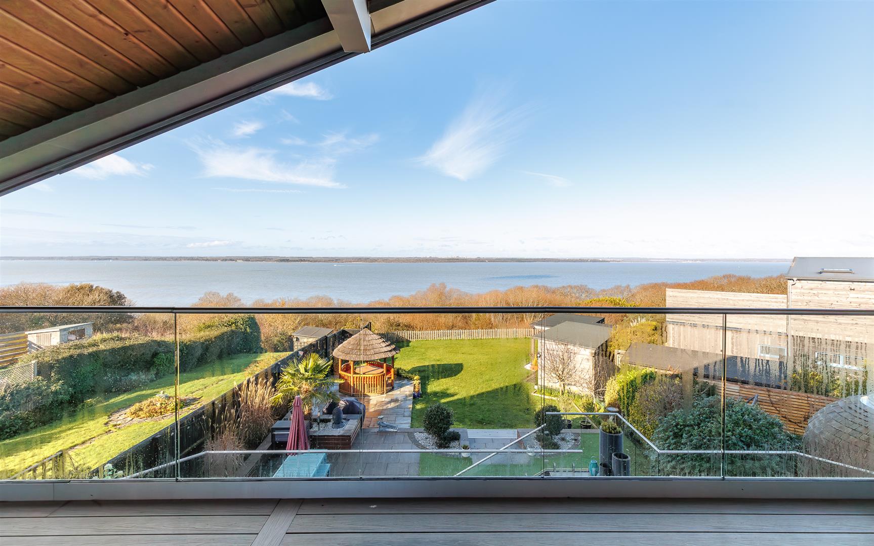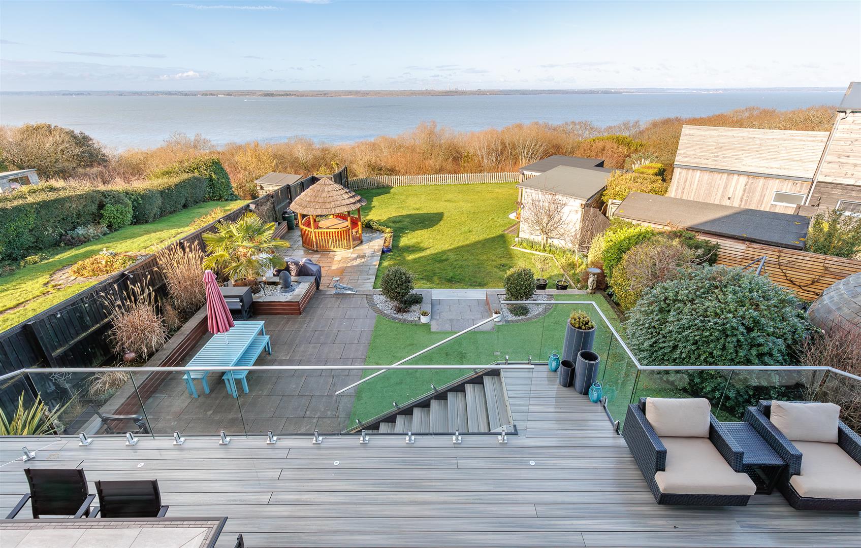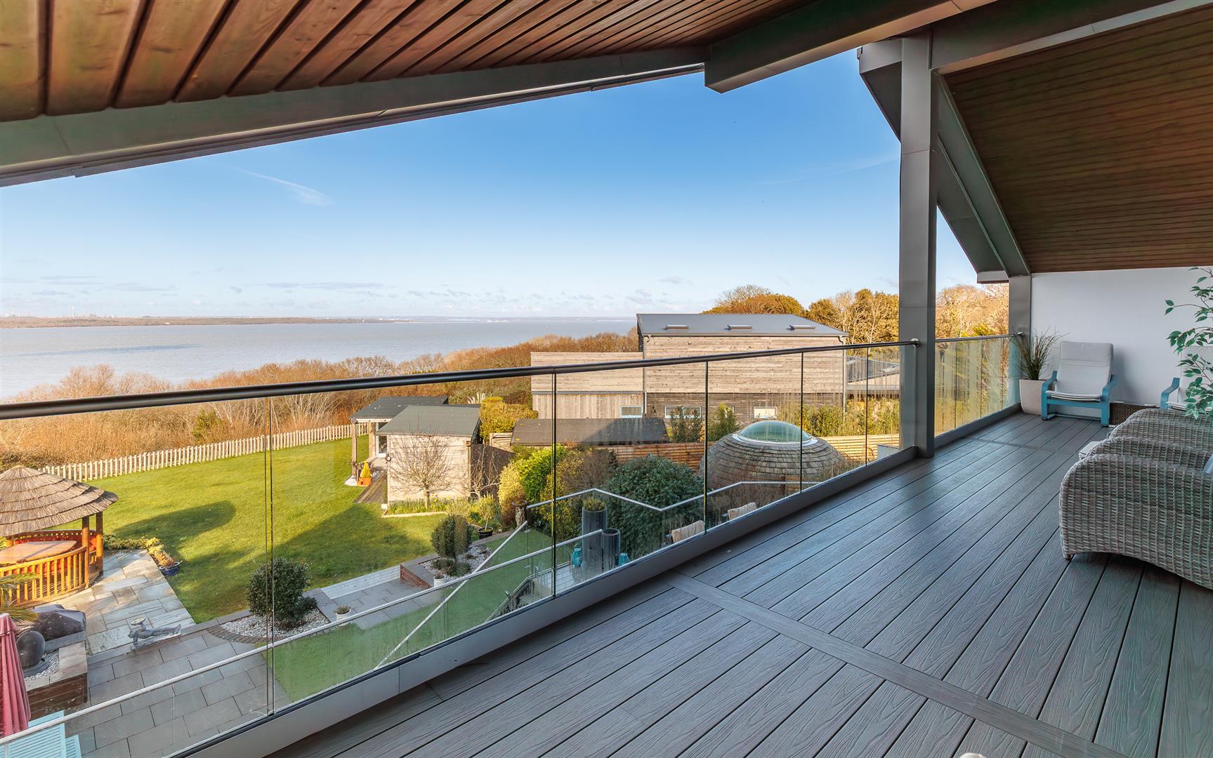 The rear garden gives a far reaching, stunning sea vista that can be enjoyed from the full width composite decked area with glass panels, allowing an unfettered panoramic view, and stainless steel balustrades that continue down the steps to the lower garden. The incredible outlook continues from the 'tipi' style summerhouse and the purpose built covered seating area adjacent to the outdoor bar.