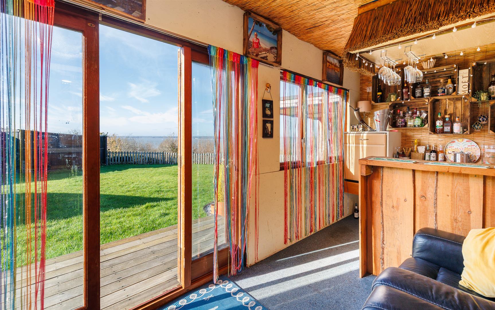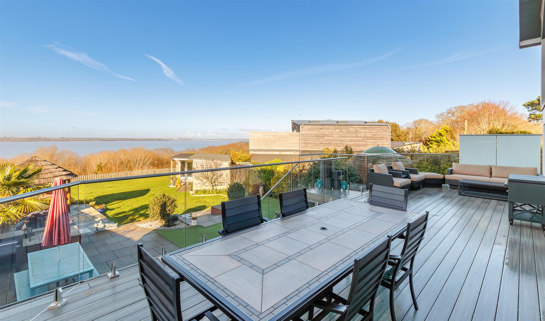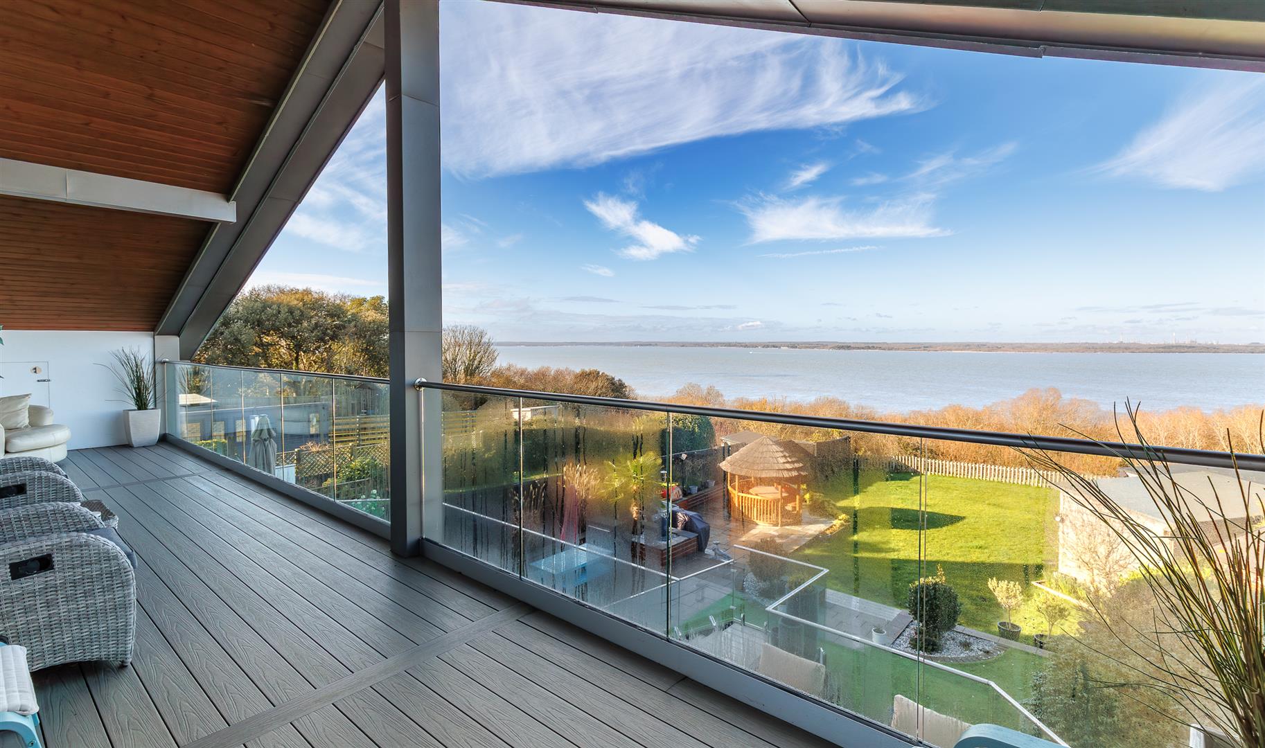 The rear garden gives a far reaching, stunning sea vista that can be enjoyed from the full width composite decked area with glass panels, allowing an unfettered panoramic view, and stainless steel balustrades that continue down the steps to the lower garden. The incredible outlook continues from the 'tipi' style summerhouse and the purpose built covered seating area adjacent to the outdoor bar.