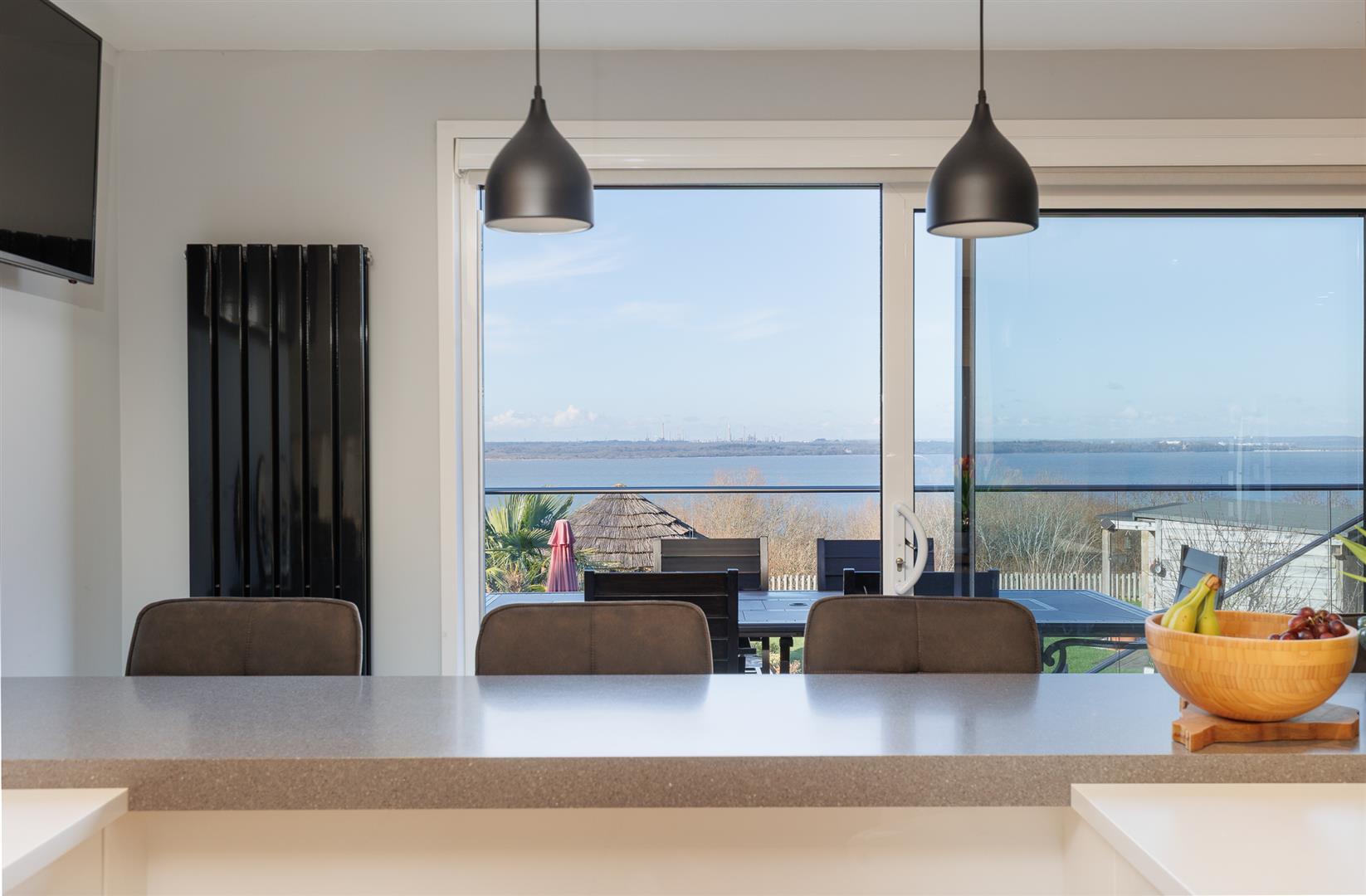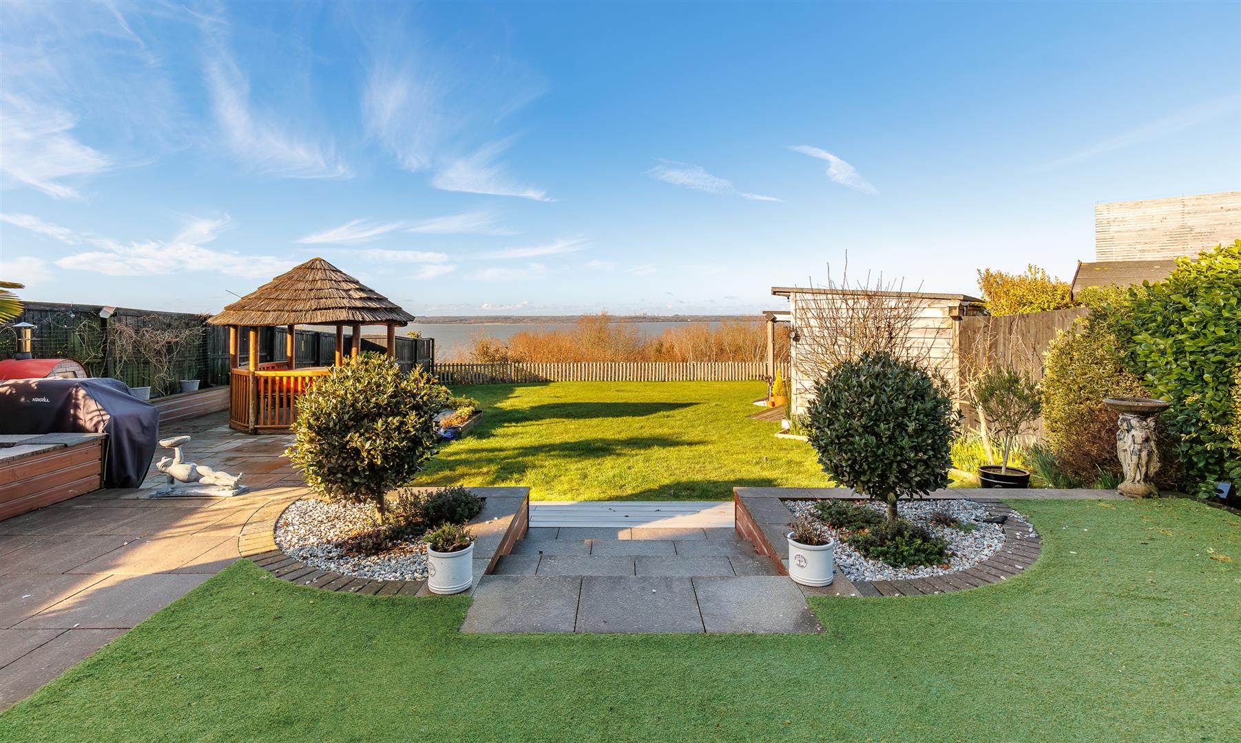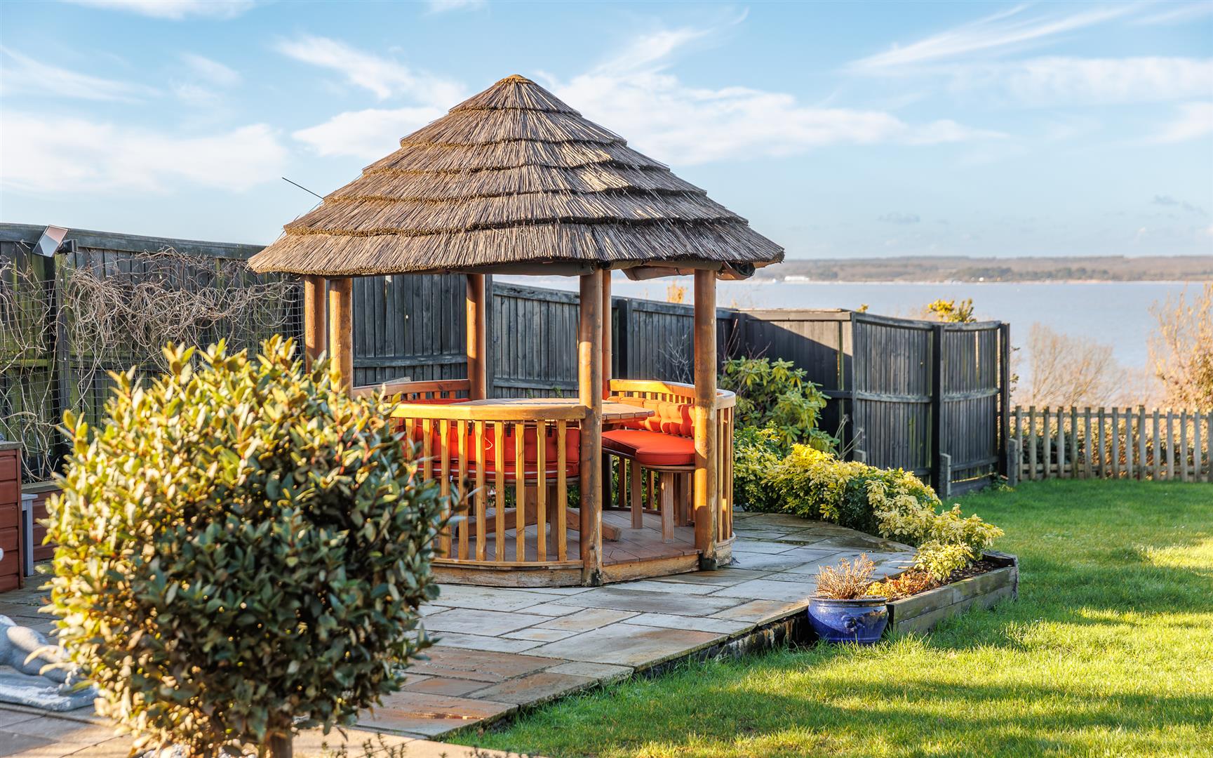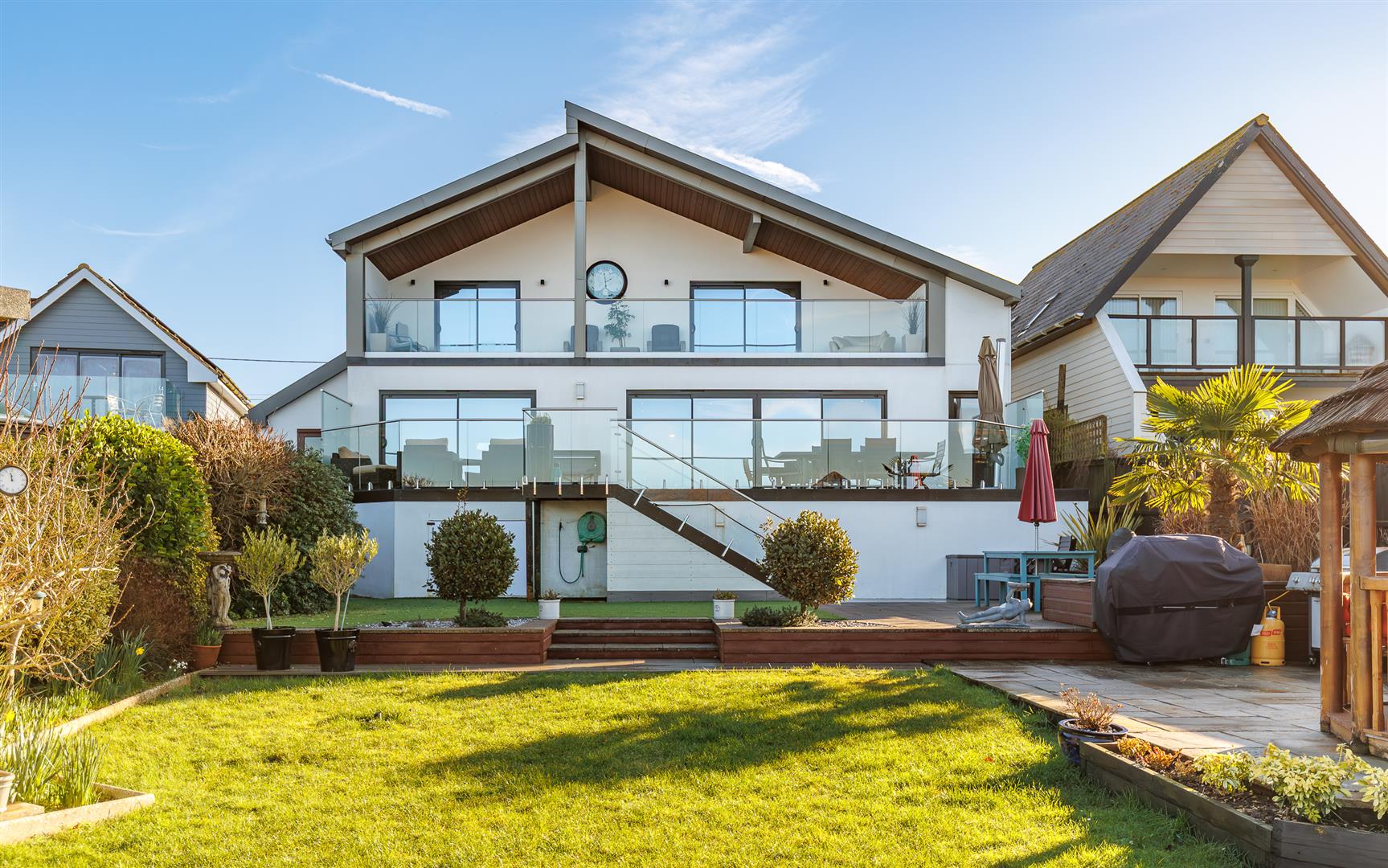 The rear garden gives a far reaching, stunning sea vista that can be enjoyed from the full width composite decked area with glass panels, allowing an unfettered panoramic view, and stainless steel balustrades that continue down the steps to the lower garden. The incredible outlook continues from the 'tipi' style summerhouse and the purpose built covered seating area adjacent to the outdoor bar.