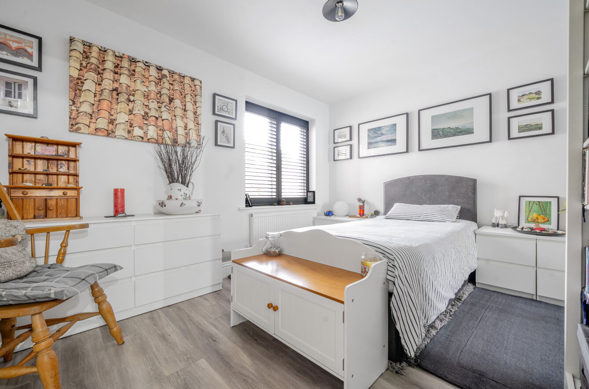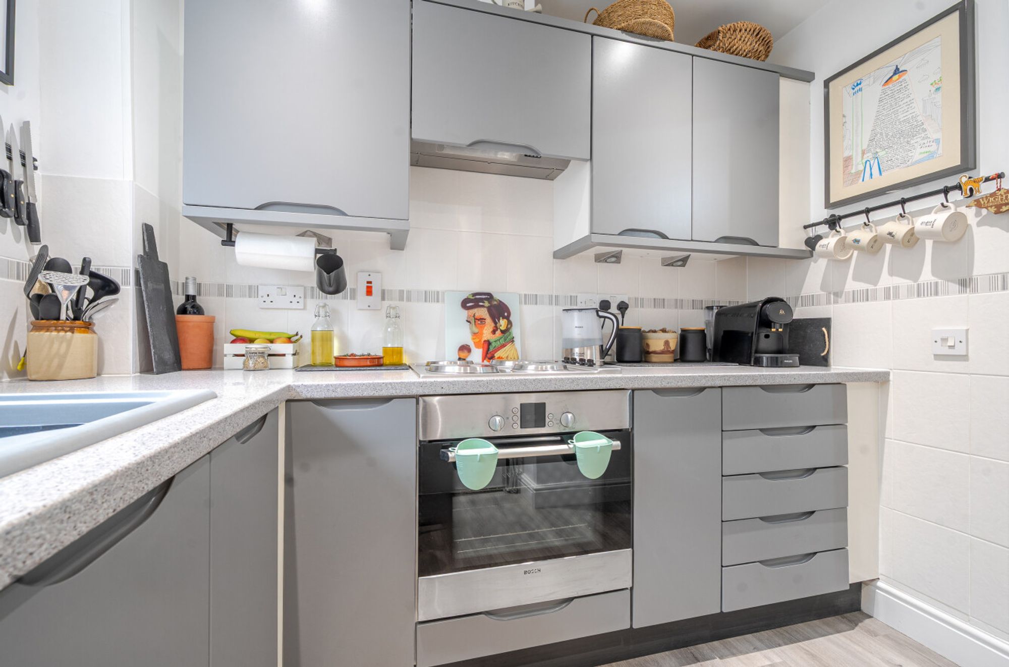 The front door opens to an ‘L’ shaped entrance hall with laminate flooring which leads to all rooms and a large walk-in cupboard. The reception room features French doors opening onto a patio area with communal gardens beyond, has a laminate floor and colonial style shutters. The kitchen features a comprehensive range of wall base units with ample worktops, a frosted casement window, tiled splashback and laminate floors. The first bedroom has a large window overlooking communal gardens, laminate floor, built-in double wardrobe and en-suite shower with corner shower WC and basin. The second bedroom also has a large casement window overlooking communal gardens, laminate flooring and a double built-in wardrobe. Finally, the immaculate family bathroom has a frosted casement window, bath, WC and basin with storage below. A new gas boiler was added in April 2025.