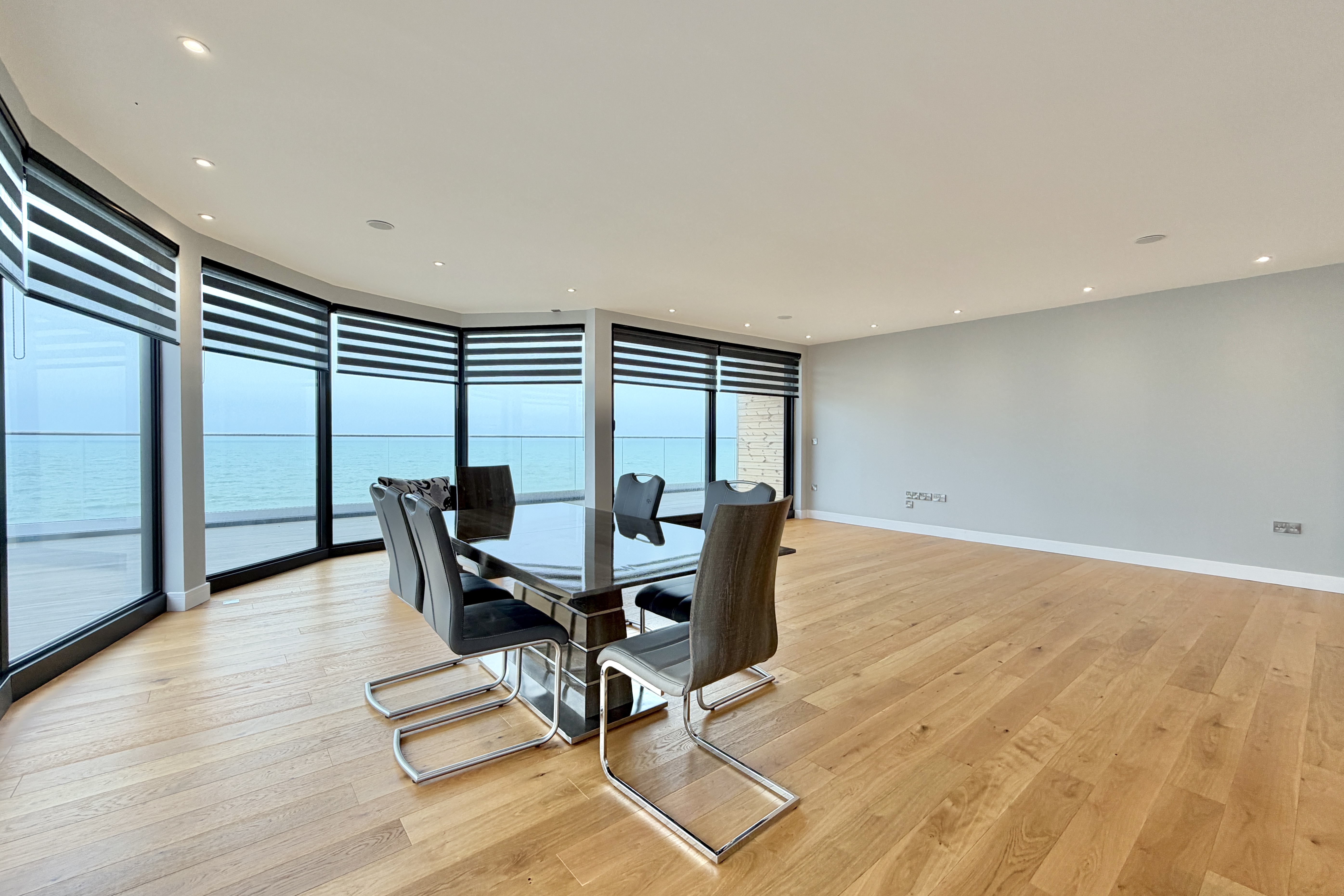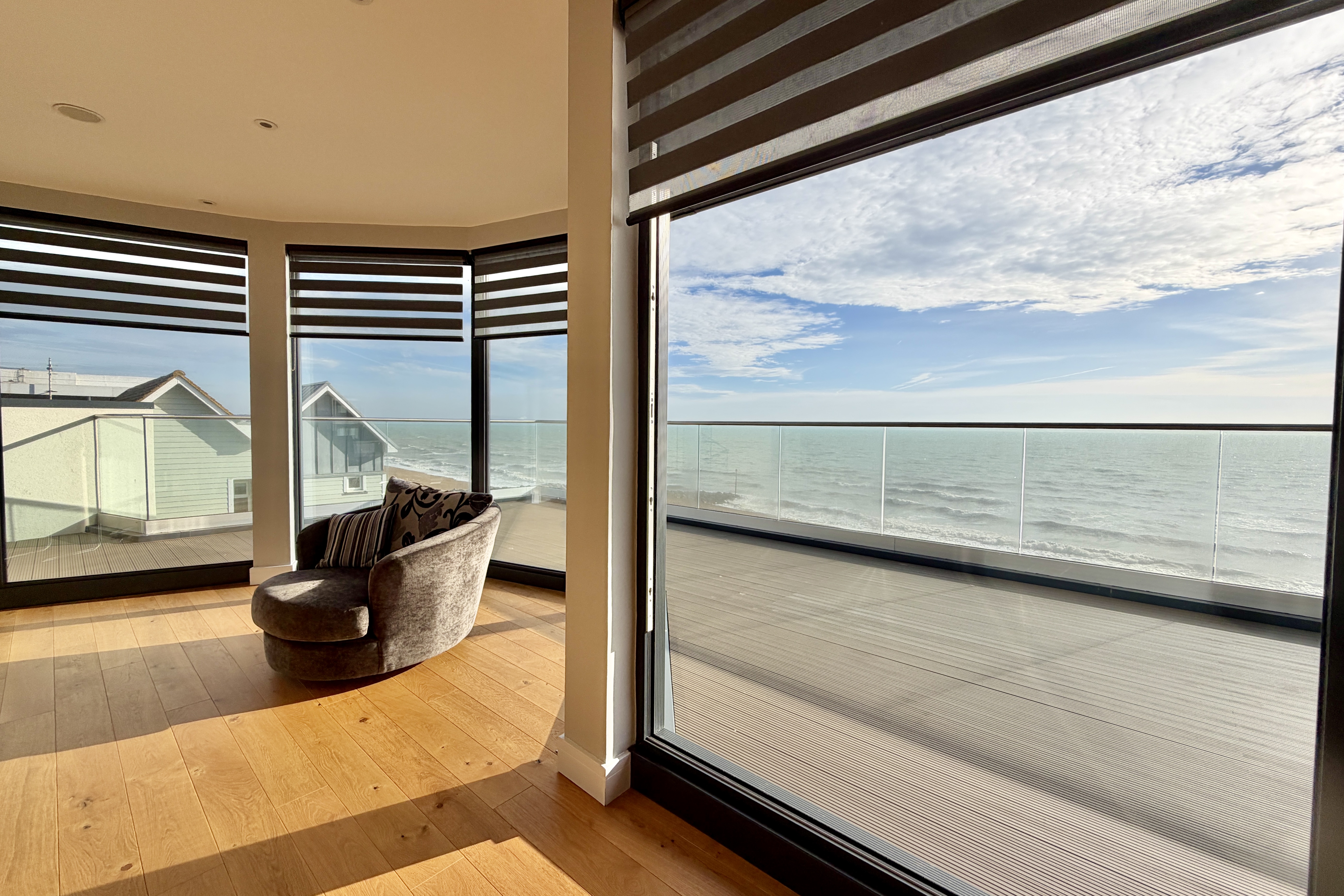 with floor to ceiling double glazed windows to front and side taking full advantage of stunning panoramic sea views over English Channel, sliding double glazed doors leading to balcony, ceiling speakers (currently not connected)