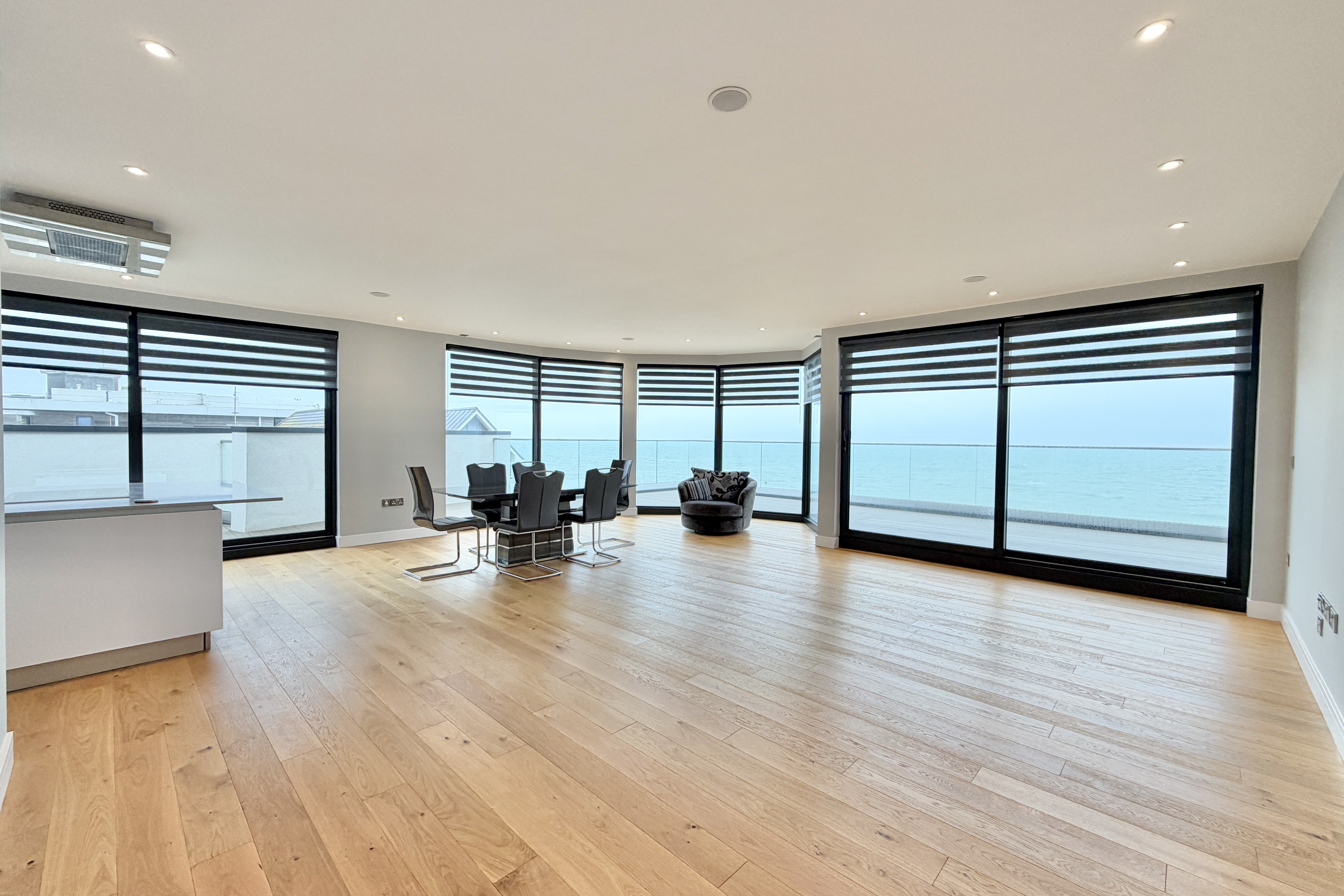 An exceptional three-bedroom penthouse located on Hythe’s sought-after beachfront, offering breathtaking panoramic views across the English Channel. This impressive home features gas-fired underfloor heating throughout and spacious, contemporary accommodation comprising an L-shaped entrance hall with direct lift access, a stunning open-plan living, kitchen and dining area with a modern fitted kitchen including built-in appliances, all taking advantage of the magnificent sea views and giving access to a wrap-around balcony, main bedroom benefitting from an en-suite shower room and balcony access with a further two doubles bedrooms (one of which also has access to the balcony), a luxurious family bathroom and separate utility room. The property further benefits from secure undercroft parking with one allocated space, a private store cupboard. This outstanding penthouse perfectly combines sophisticated modern living with an unrivalled seaside location & also has the added benefit of no onward chain, an early viewing is highly recommended.